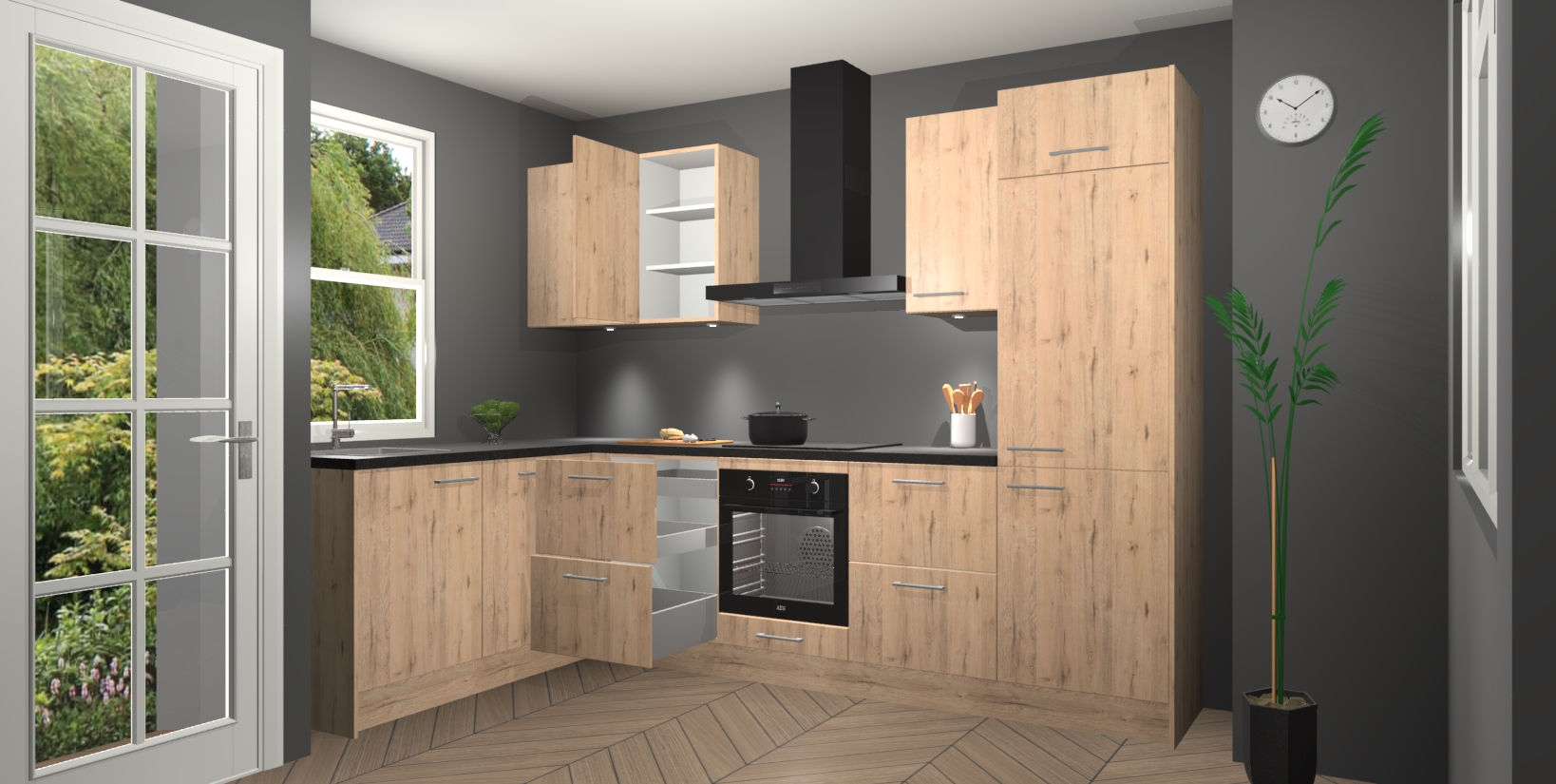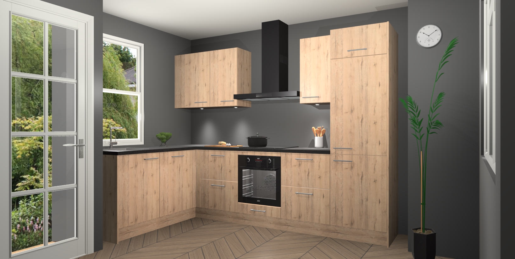 Bent u op zoek naar een strakke, moderne hoekkeuken die uw huis oppept en een moderne uitstraling geeft? Kijk dan niet verder dan de madera natuur keuken Beijing. Deze verbluffende hoekkeuken tilt hedendaags design naar een hoger niveau. Qua stijl is deze chique hoekkeuken voorzien van madera natuur accenten, om een strakke maar opvallende look te creëren. De binnenkant van de kasten is afgewerkt in dezelfde prachtige madera natuur kleur voor extra esthetische aantrekkingskracht.
