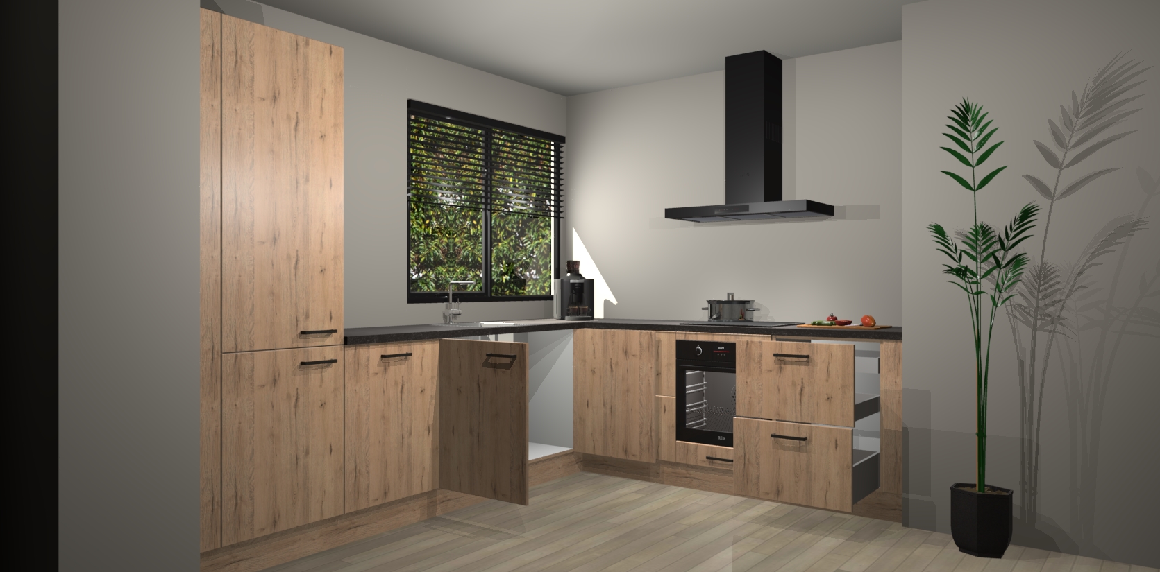 Met een modern, tijdloos design en ruime opslagruimte, zult u zich in no-time thuis voelen in uw nieuwe keuken. Uw leven wordt eenvoudiger met de soft-close deuren die voor het ultieme stille comfort zorgen - geen geluid dat u stoort terwijl u kookt. Ook is de keuken voorzien van 5 ingebouwde apparaten: een oven, inductie kookplaat, afzuigkap, vaatwasser en koelkast. Deze kunnen gemakkelijk na bestelling worden bijgewerkt naar AEG - waardoor uw luxe ervaring compleet is.