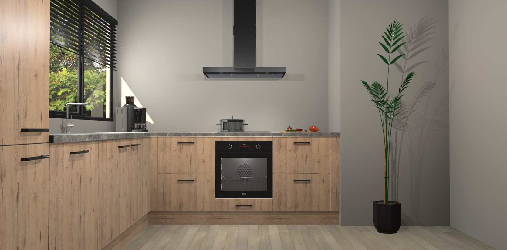 Met een modern, tijdloos design en ruime opslagruimte, zult u zich in no-time thuis voelen in uw nieuwe keuken. Uw leven wordt eenvoudiger met de soft-close deuren die voor het ultieme stille comfort zorgen - geen geluid dat u stoort terwijl u kookt. Ook is de keuken voorzien van 5 ingebouwde apparaten: een oven, inductie kookplaat, afzuigkap, vaatwasser en koelkast. Deze kunnen gemakkelijk na bestelling worden bijgewerkt naar AEG - waardoor uw luxe ervaring compleet is.