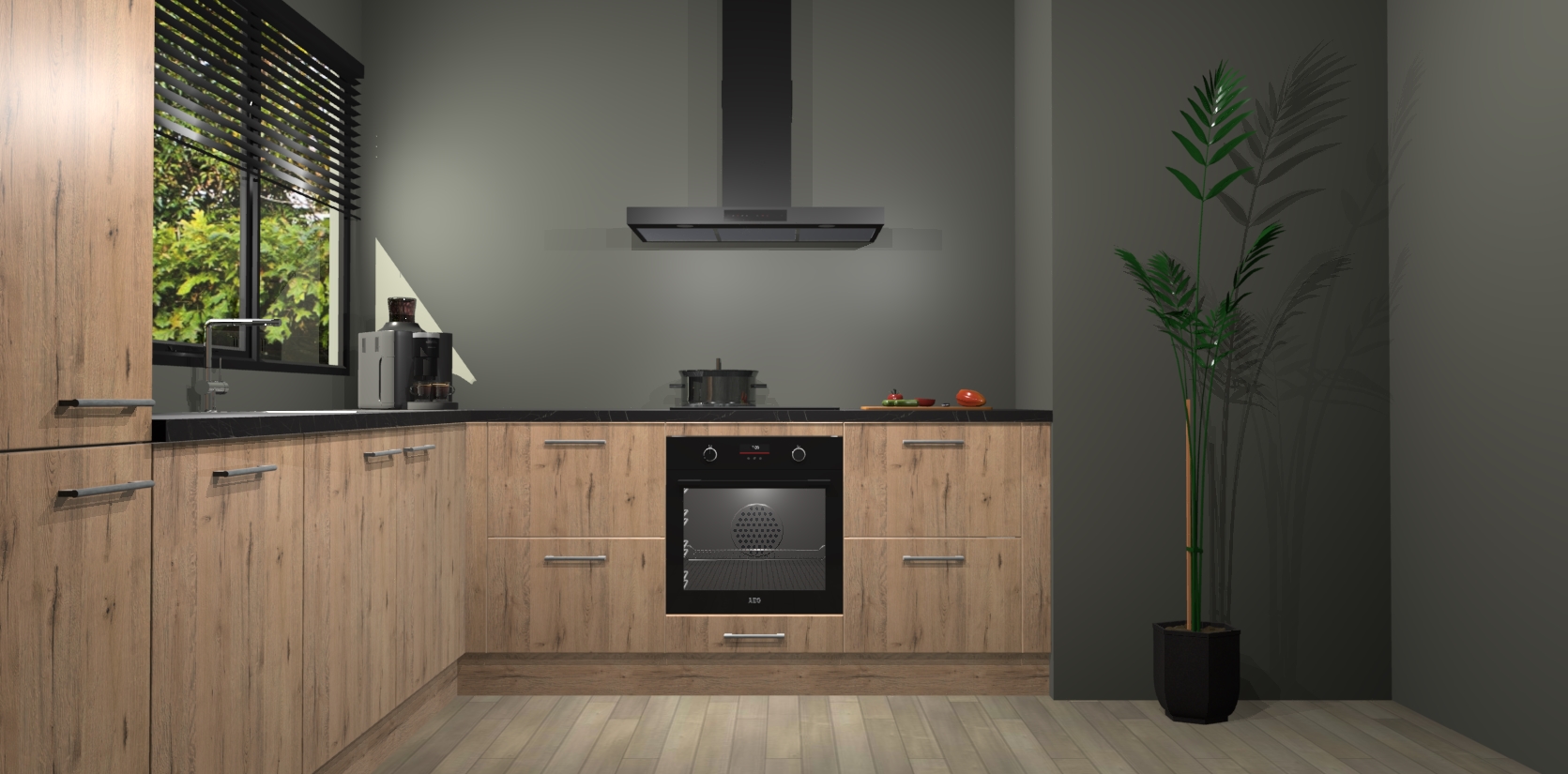Met een modern, tijdloos design en ruime opslagruimte, zult u zich in no-time thuis voelen in uw nieuwe keuken. Uw leven wordt eenvoudiger met de soft-close deuren die voor het ultieme stille comfort zorgen - geen geluid dat u stoort terwijl u kookt. Ook is de keuken voorzien van 5 ingebouwde apparaten: een oven, inductie kookplaat, afzuigkap, vaatwasser en koelkast. Deze kunnen gemakkelijk na bestelling worden bijgewerkt naar AEG - waardoor uw luxe ervaring compleet is.