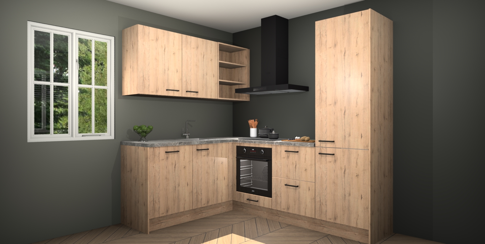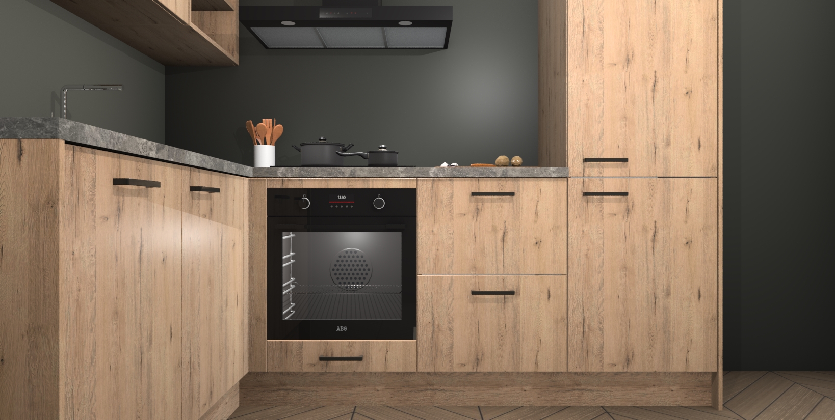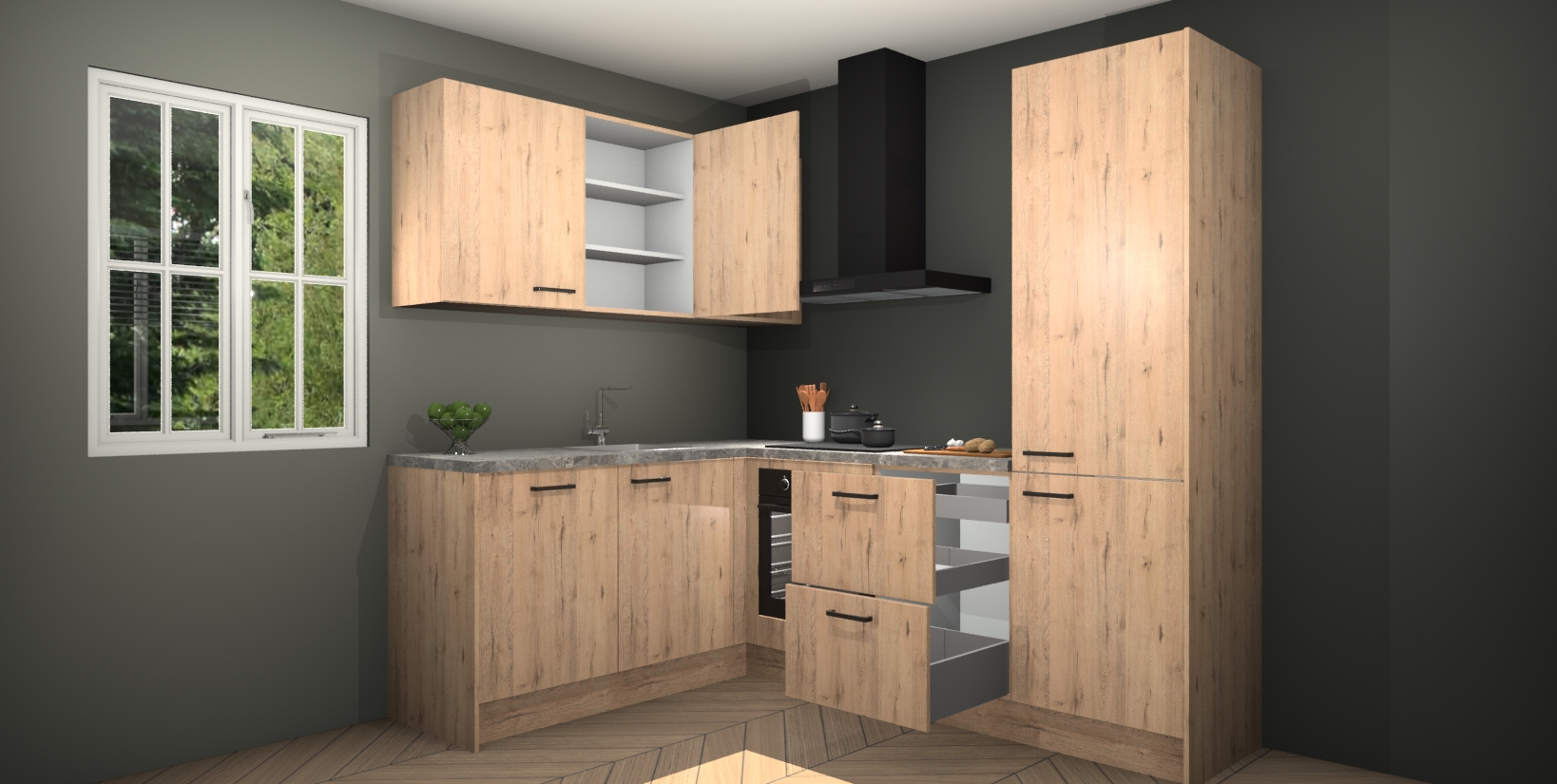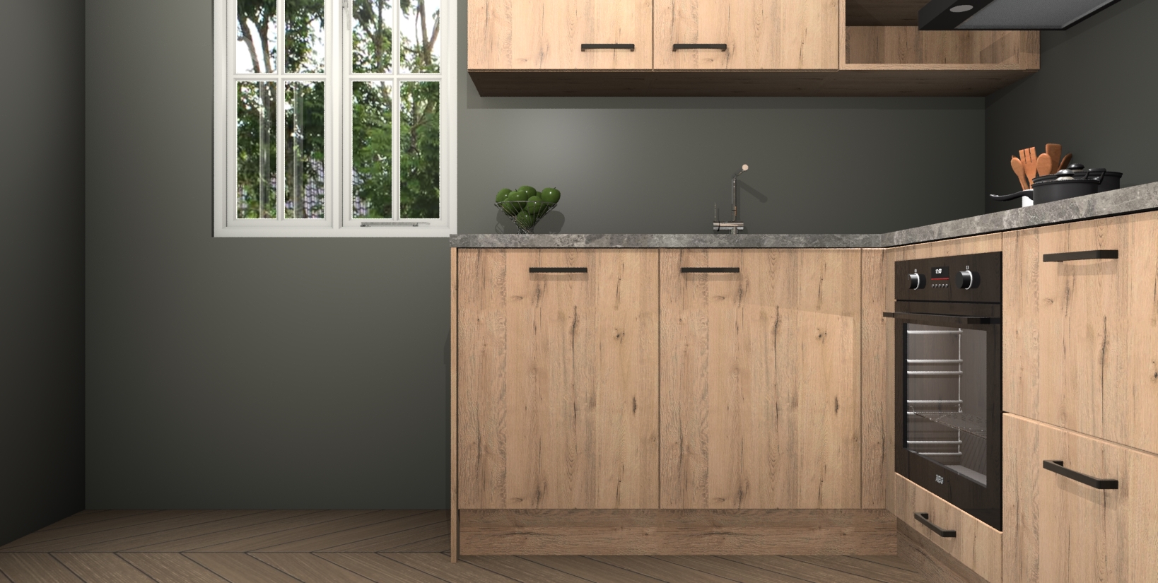 Maak kennis met de Madera Natuur keuken Boekarest, een prachtige hoekkeuken die gegarandeerd een statement maakt in uw huis! Met zijn moderne, houtlook design en de warme sfeer die hij uitstraalt, kan u niet anders dan verliefd worden.