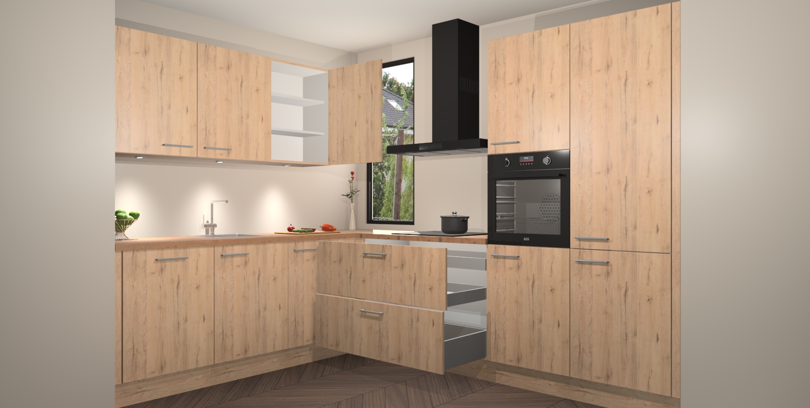 De ruime opbergruimte van dit model maakt het bereiden van voedsel en het gebruik van apparaten snel en gemakkelijk. Het beste van alles is dat het wordt geleverd met vijf inbouwapparaten: een oven, inductiekookplaat, afzuigkap, vaatwasser en koelkast - die allemaal gemakkelijk kunnen worden opgewaardeerd naar AEG na aankoop. Wat de gemaksfactor nog groter maakt, is het feit dat alle cabines voorgemonteerd worden geleverd, zodat u er meteen mee aan de slag kunt!