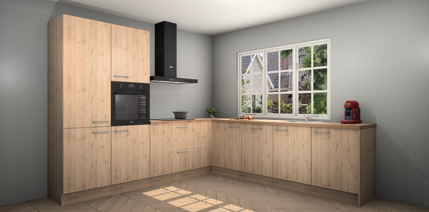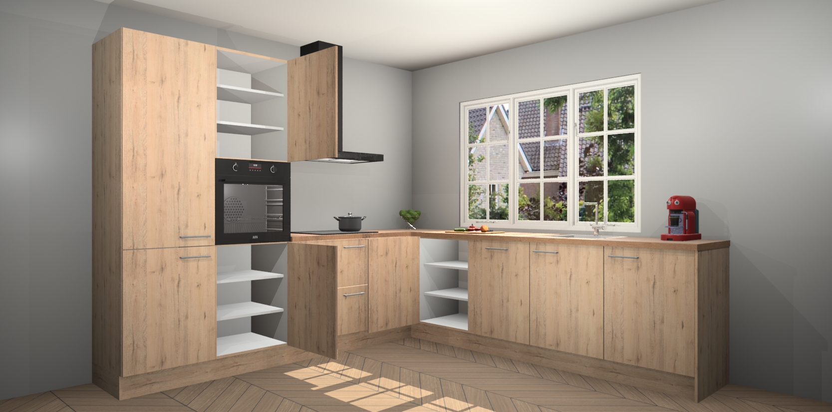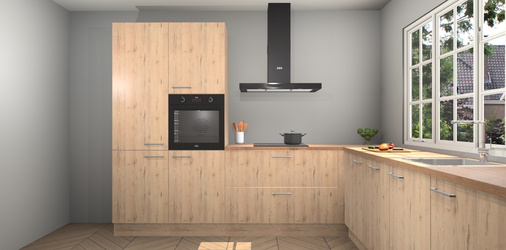 De keuken heeft veel opbergruimte, waardoor u alle ingrediënten gemakkelijk bereikbaar hebt staan. En daarnaast bevat deze volledig uitgeruste keuken ook 5 ingebouwde apparaten: een oven, inductiekookplaat, afzuigkap, vaatwasser en koelkast. Deze zijn heel eenvoudig na bestellen te upgraden naar AEG als u dit wilt. Bovendien zijn de softclose-kastdeuren ideaal; geef ze gewoon even een tikje en ze sluiten automatisch met geruisloze precisie.
