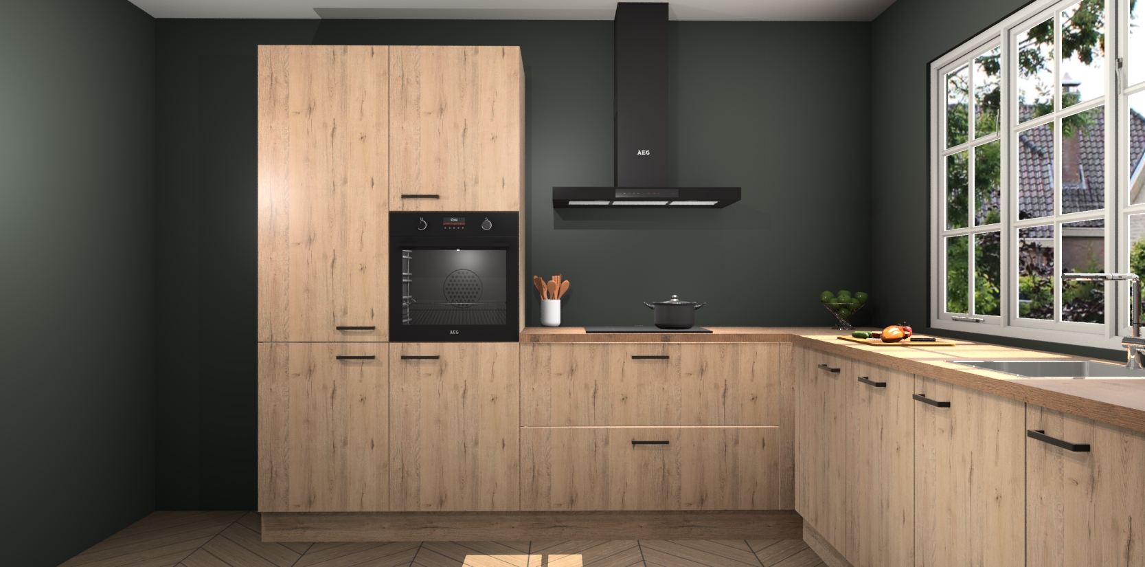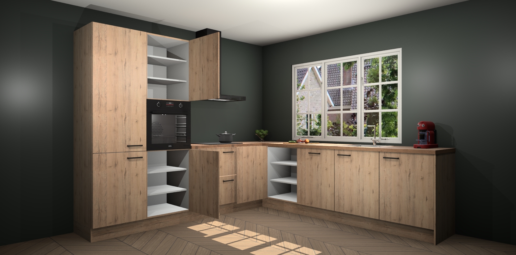 De keuken heeft veel opbergruimte, waardoor u alle ingrediënten gemakkelijk bereikbaar hebt staan. En daarnaast bevat deze volledig uitgeruste keuken ook 5 ingebouwde apparaten: een oven, inductiekookplaat, afzuigkap, vaatwasser en koelkast. Deze zijn heel eenvoudig na bestellen te upgraden naar AEG als u dit wilt. Bovendien zijn de softclose-kastdeuren ideaal; geef ze gewoon even een tikje en ze sluiten automatisch met geruisloze precisie.