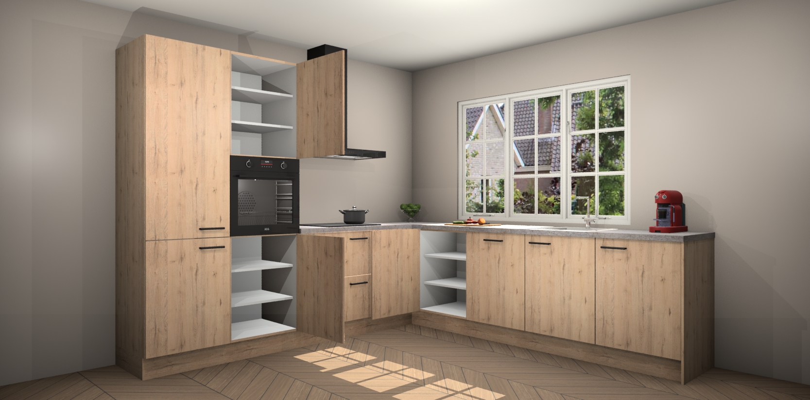 De keuken heeft veel opbergruimte, waardoor u alle ingrediënten gemakkelijk bereikbaar hebt staan. En daarnaast bevat deze volledig uitgeruste keuken ook 5 ingebouwde apparaten: een oven, inductiekookplaat, afzuigkap, vaatwasser en koelkast. Deze zijn heel eenvoudig na bestellen te upgraden naar AEG als u dit wilt. Bovendien zijn de softclose-kastdeuren ideaal; geef ze gewoon even een tikje en ze sluiten automatisch met geruisloze precisie.