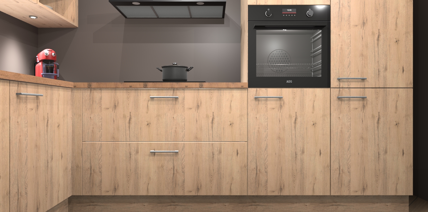 De Madera Natuur keuken Cognac is een adembenemend ontwerp met een modern en tijdloos uiterlijk. Deze luxe keuken straalt echt aristocratisch uit, waardoor uw koken plezieriger zal worden! Het prachtige design begint bij de hoekkeuken, wat perfect past bij elk type interieur. Bovendien bevat deze hoogwaardige set vijf inbouwapparaten - van oven tot koelkast - die via bestelling naar AEG geüpgraded kunnen worden!