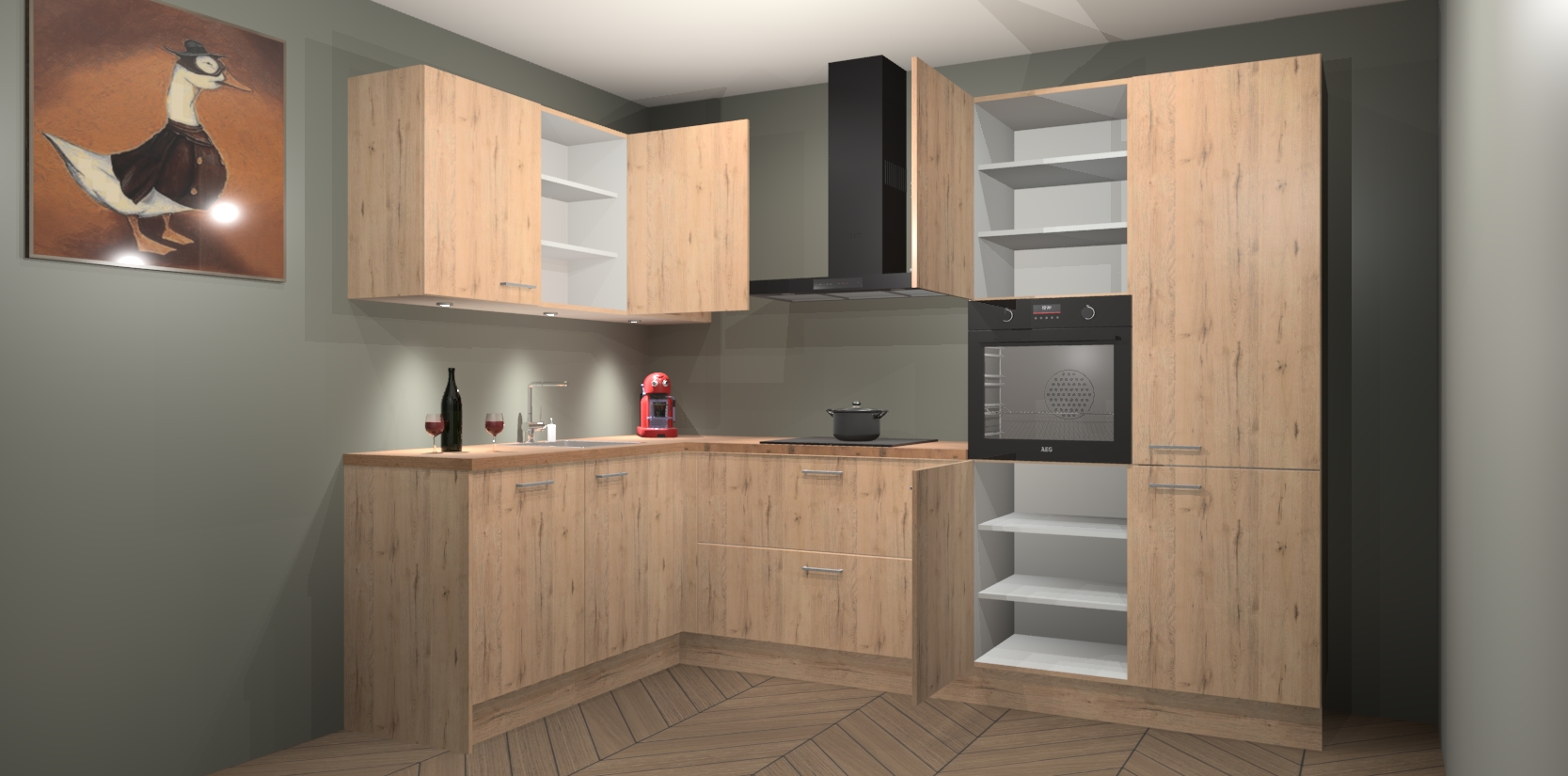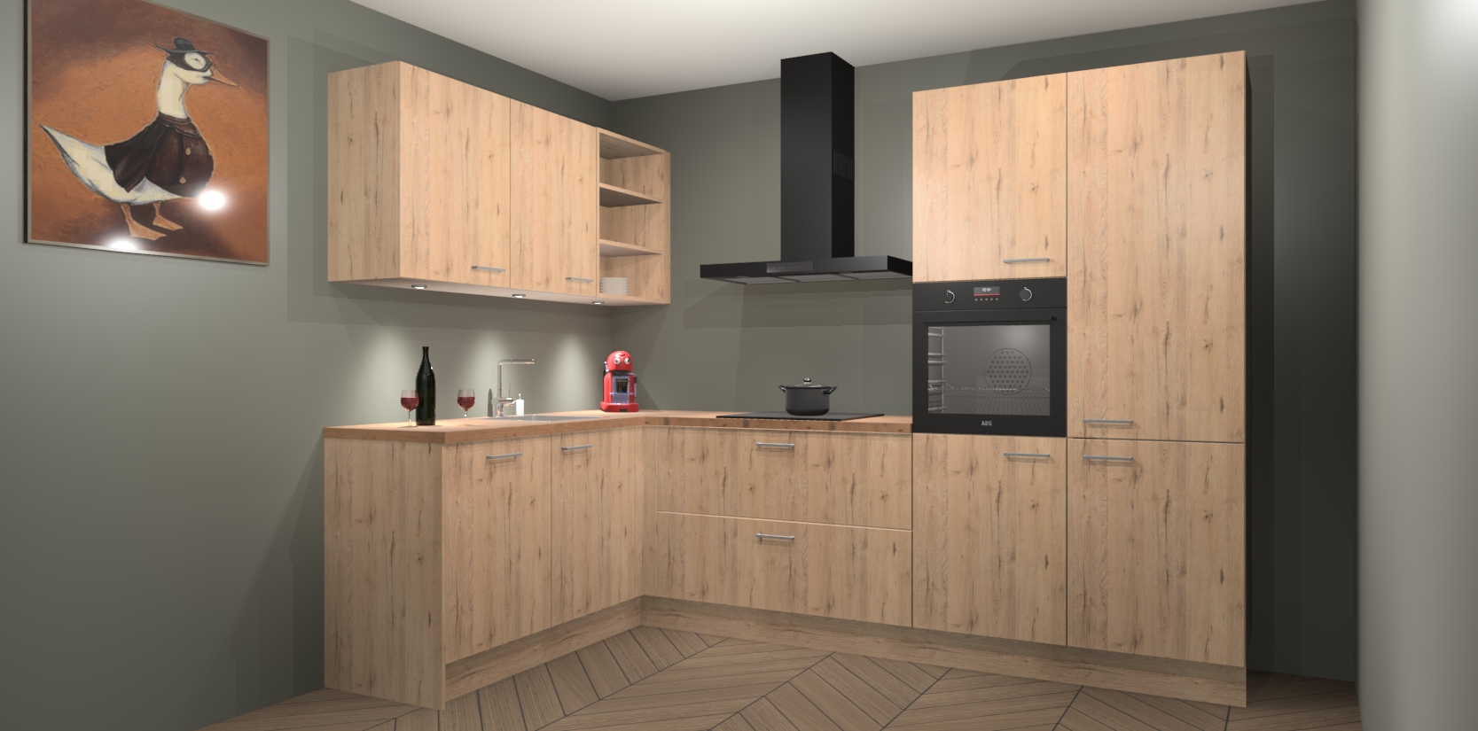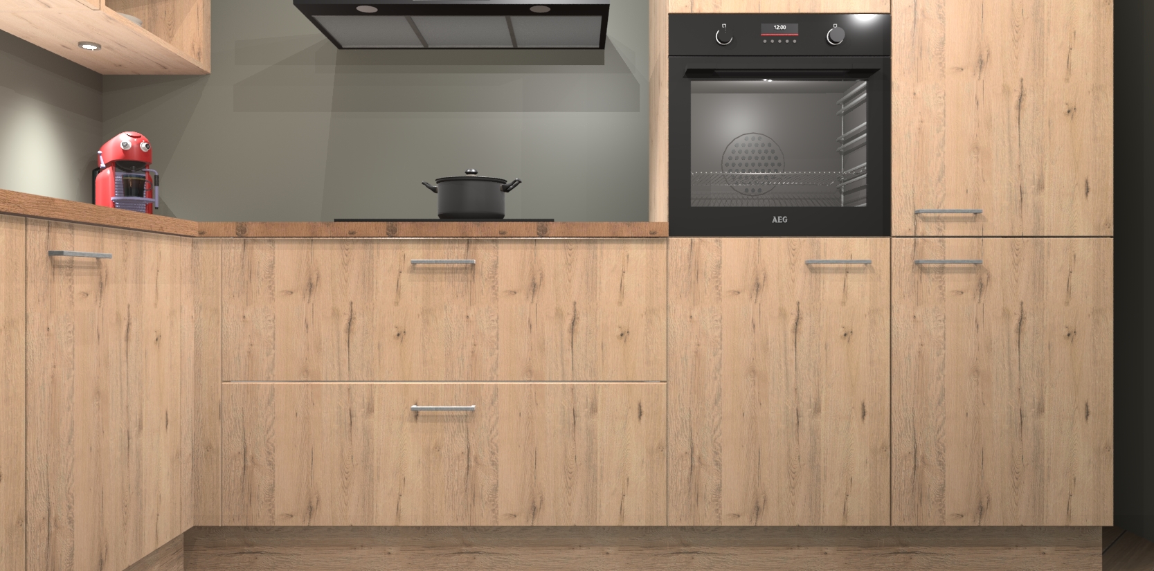 De Madera Natuur keuken Cognac is een adembenemend ontwerp met een modern en tijdloos uiterlijk. Deze luxe keuken straalt echt aristocratisch uit, waardoor uw koken plezieriger zal worden! Het prachtige design begint bij de hoekkeuken, wat perfect past bij elk type interieur. Bovendien bevat deze hoogwaardige set vijf inbouwapparaten - van oven tot koelkast - die via bestelling naar AEG geüpgraded kunnen worden!