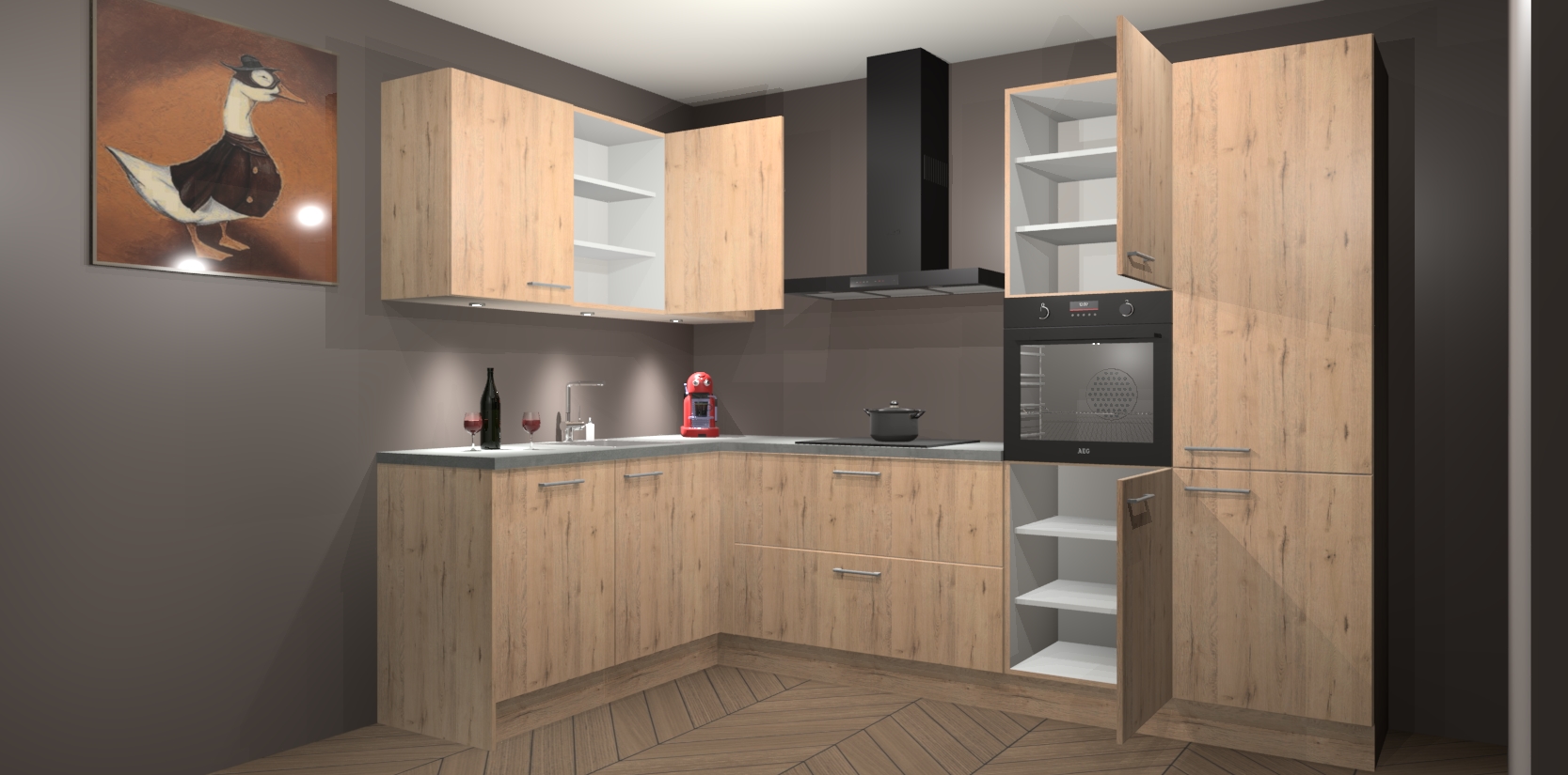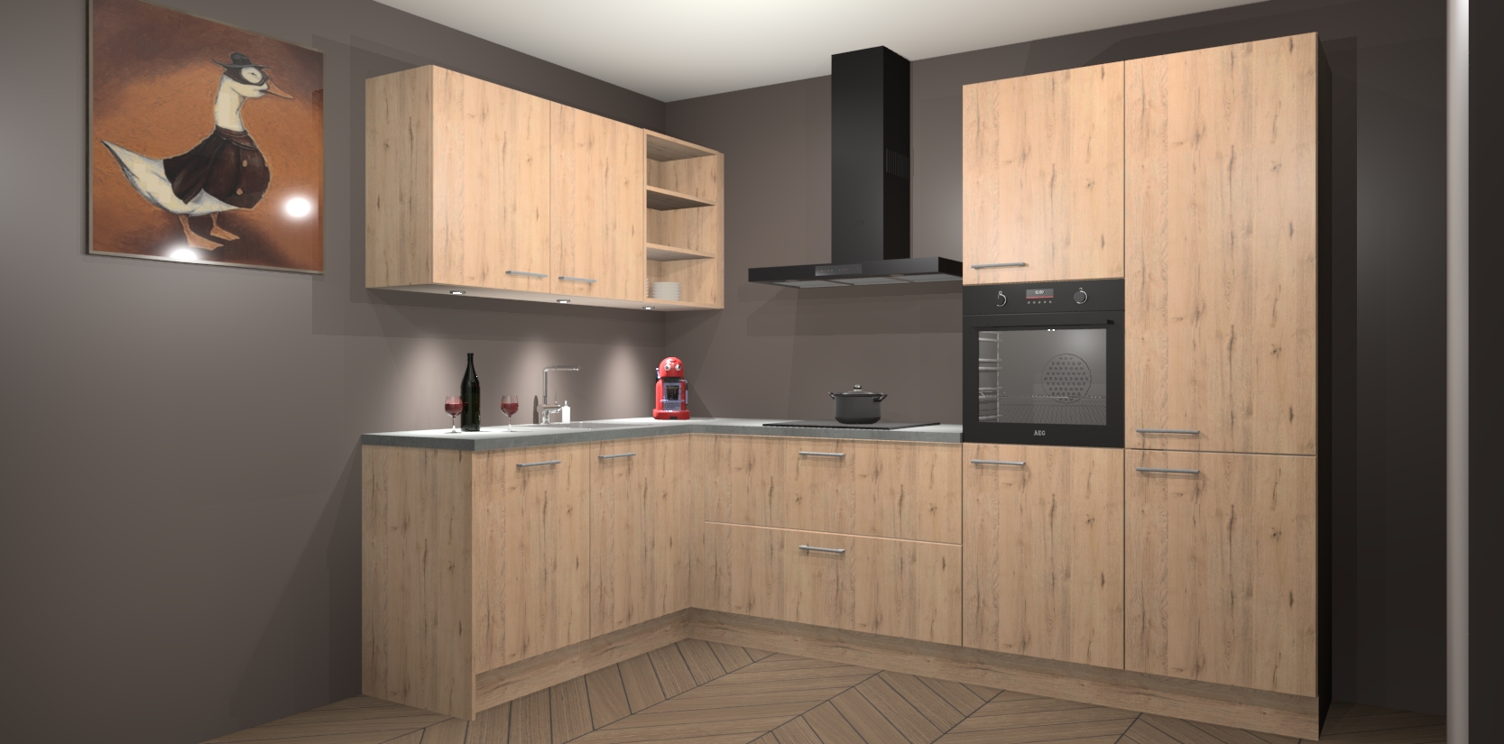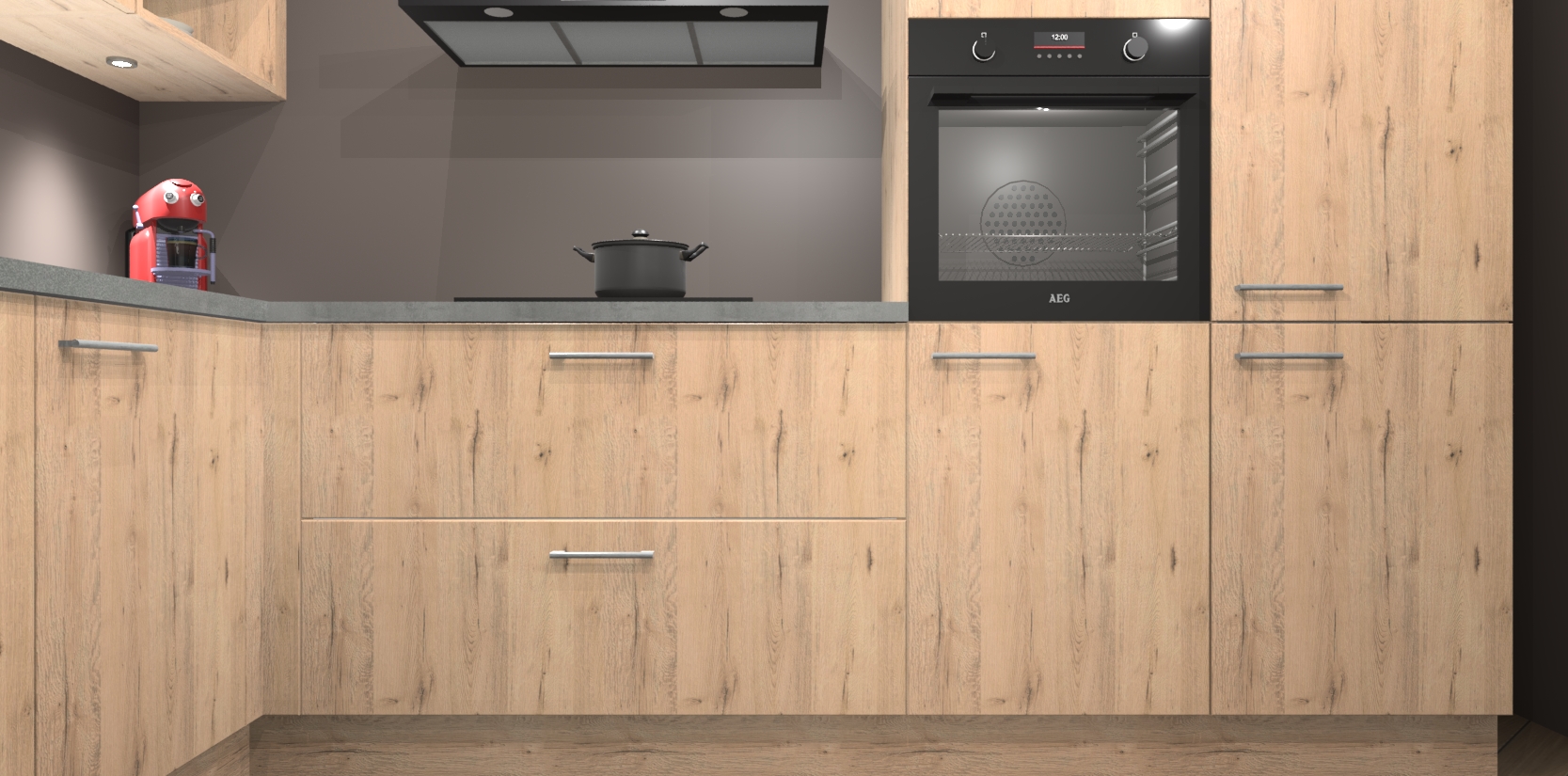 De Madera Natuur keuken Cognac is een adembenemend ontwerp met een modern en tijdloos uiterlijk. Deze luxe keuken straalt echt aristocratisch uit, waardoor uw koken plezieriger zal worden! Het prachtige design begint bij de hoekkeuken, wat perfect past bij elk type interieur. Bovendien bevat deze hoogwaardige set vijf inbouwapparaten - van oven tot koelkast - die via bestelling naar AEG geüpgraded kunnen worden!