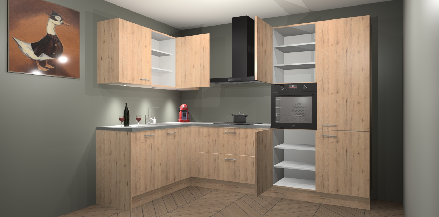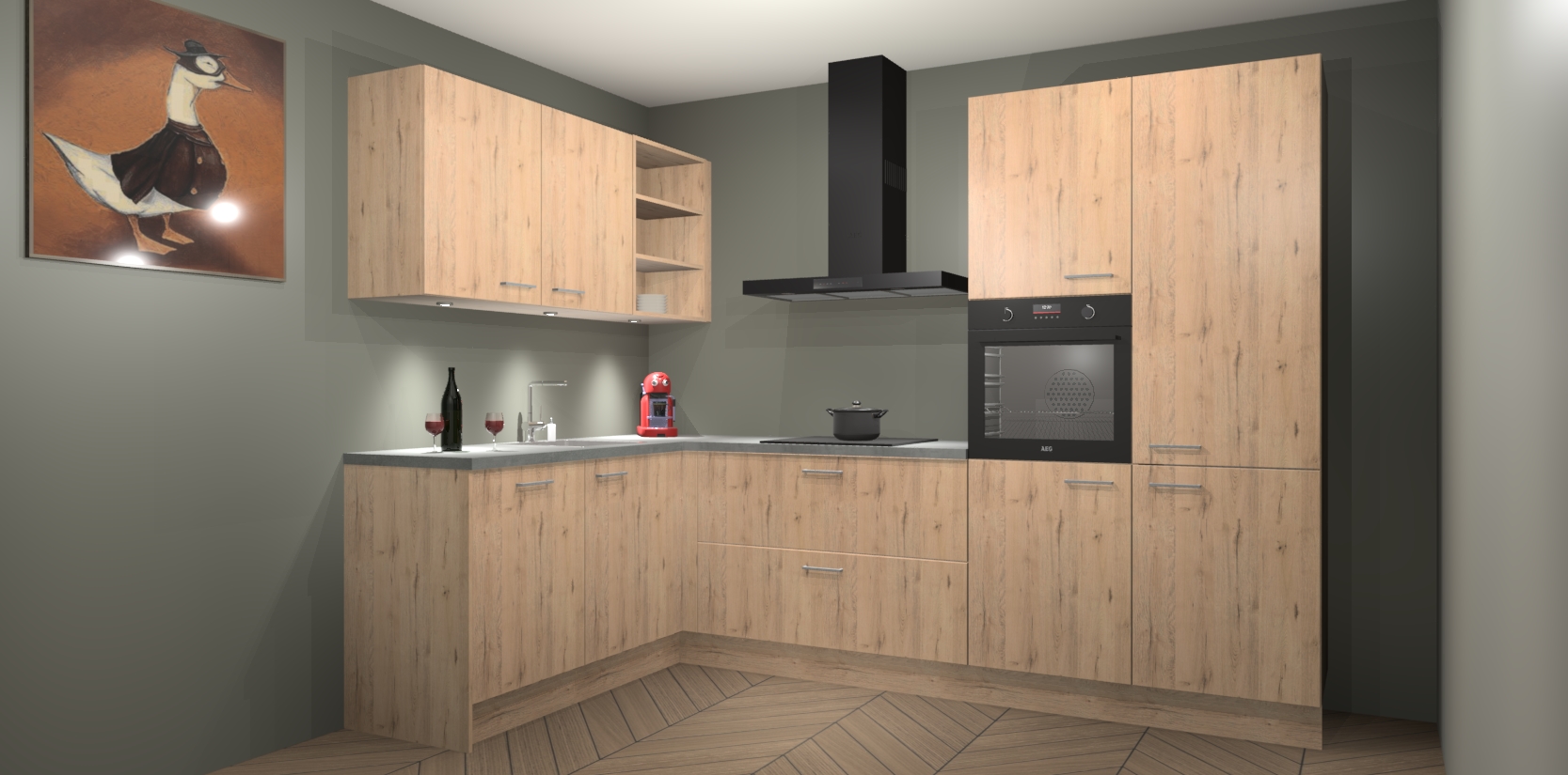 De Madera Natuur keuken Cognac is een adembenemend ontwerp met een modern en tijdloos uiterlijk. Deze luxe keuken straalt echt aristocratisch uit, waardoor uw koken plezieriger zal worden! Het prachtige design begint bij de hoekkeuken, wat perfect past bij elk type interieur. Bovendien bevat deze hoogwaardige set vijf inbouwapparaten - van oven tot koelkast - die via bestelling naar AEG geüpgraded kunnen worden!