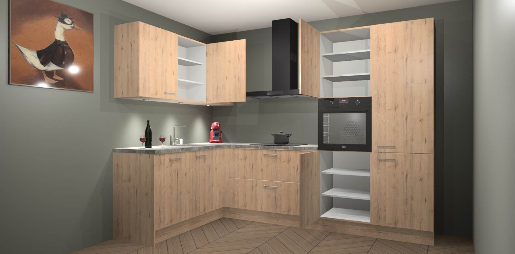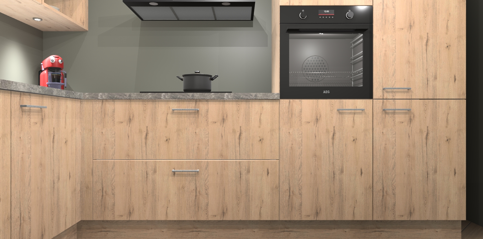 De Madera Natuur keuken Cognac is een adembenemend ontwerp met een modern en tijdloos uiterlijk. Deze luxe keuken straalt echt aristocratisch uit, waardoor uw koken plezieriger zal worden! Het prachtige design begint bij de hoekkeuken, wat perfect past bij elk type interieur. Bovendien bevat deze hoogwaardige set vijf inbouwapparaten - van oven tot koelkast - die via bestelling naar AEG geüpgraded kunnen worden!