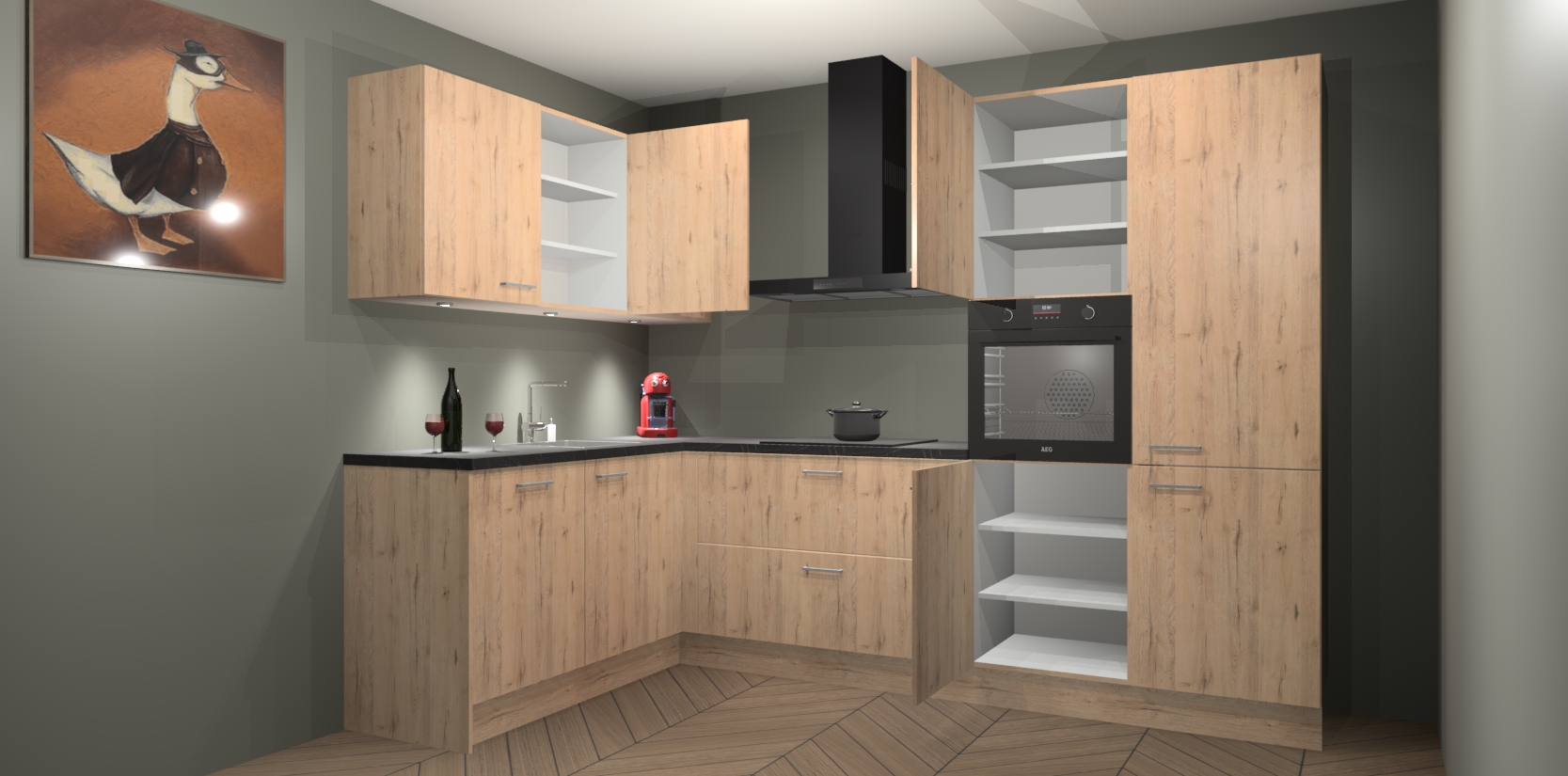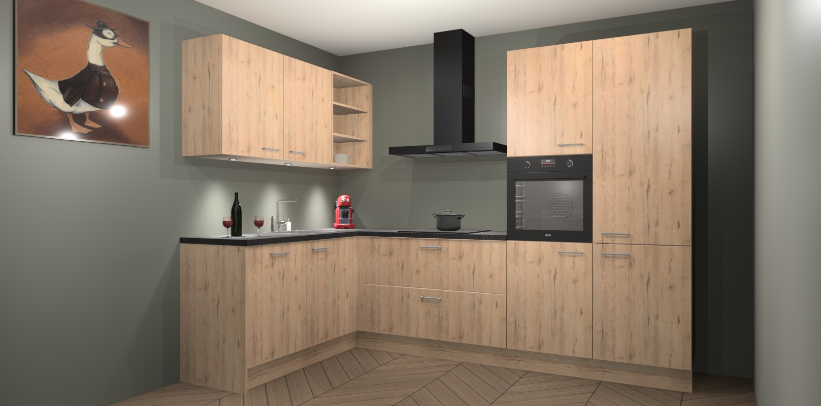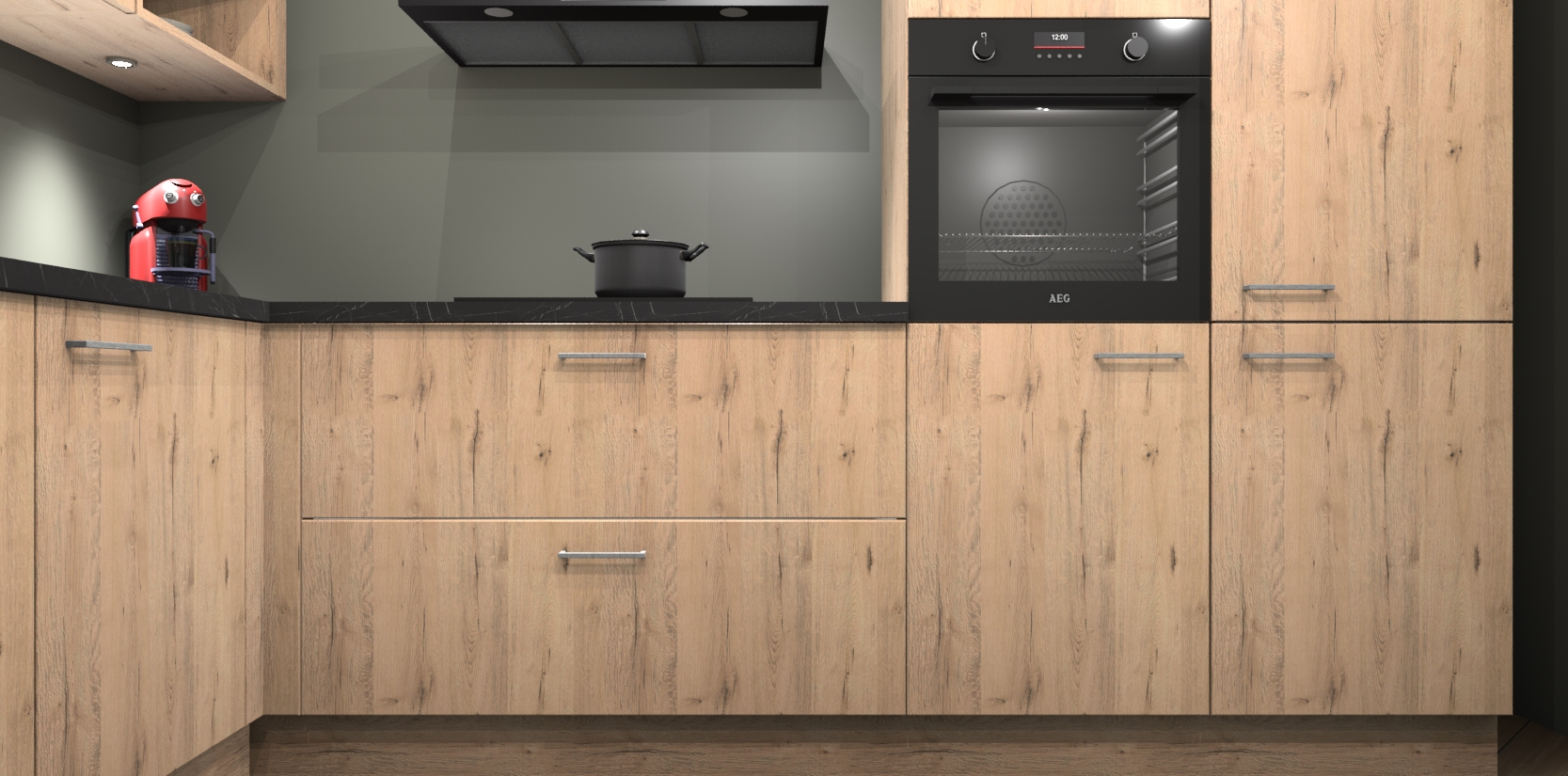 De Madera Natuur keuken Cognac is een adembenemend ontwerp met een modern en tijdloos uiterlijk. Deze luxe keuken straalt echt aristocratisch uit, waardoor uw koken plezieriger zal worden! Het prachtige design begint bij de hoekkeuken, wat perfect past bij elk type interieur. Bovendien bevat deze hoogwaardige set vijf inbouwapparaten - van oven tot koelkast - die via bestelling naar AEG geüpgraded kunnen worden!