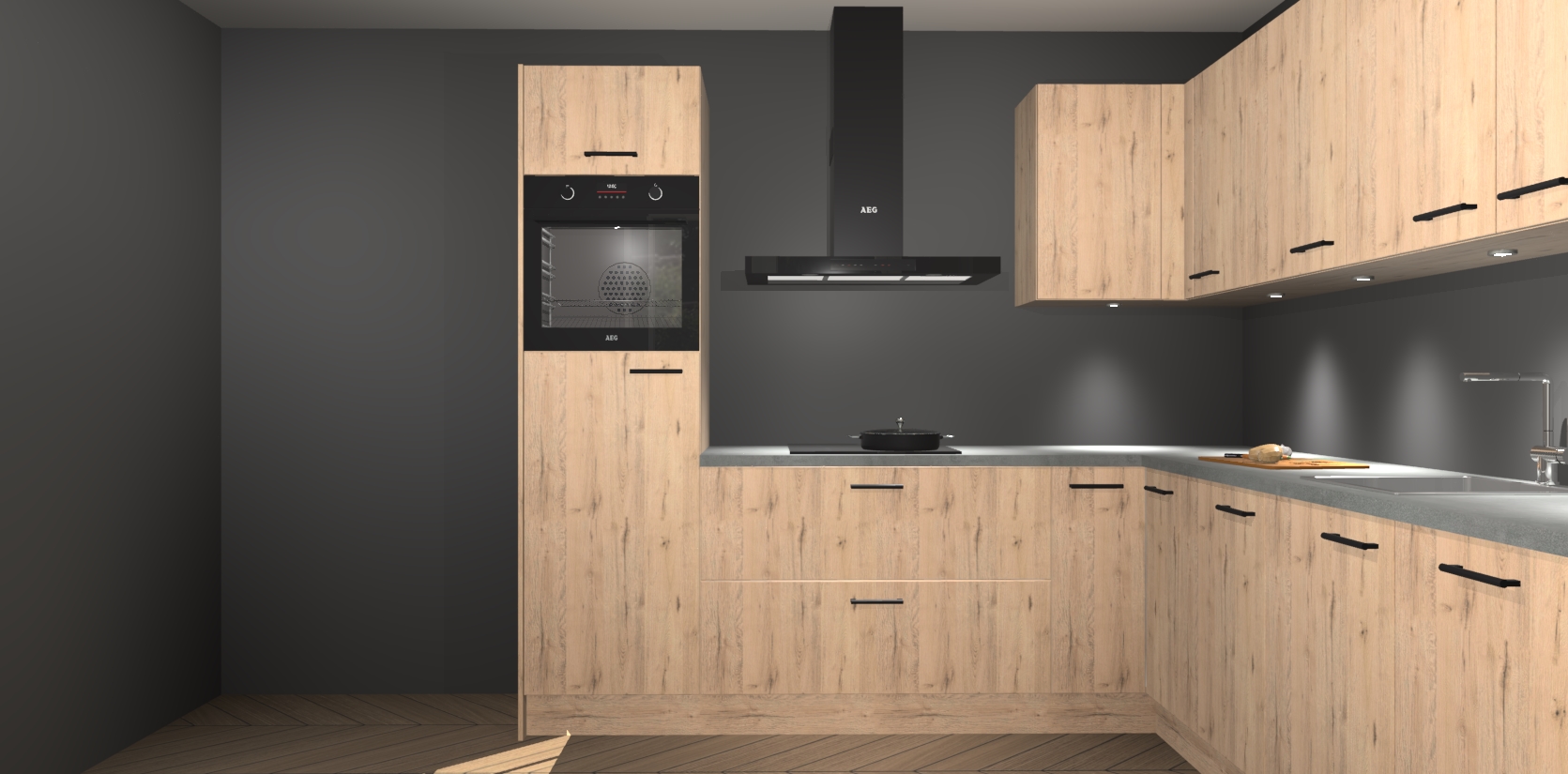 De Madera Natuur keuken Debar is uitgerust met vijf inbouwapparaten die elke kooktaak handig en efficiënt maken. Een oven, inductiekookplaat, afzuigkap, vaatwasser en koelkast zijn standaard, maar kunnen na bestelling eenvoudig worden geupgrade naar AEG. Profiteer vervolgens van de softclose deuren voor snelle toegang en geruisloze toegang.