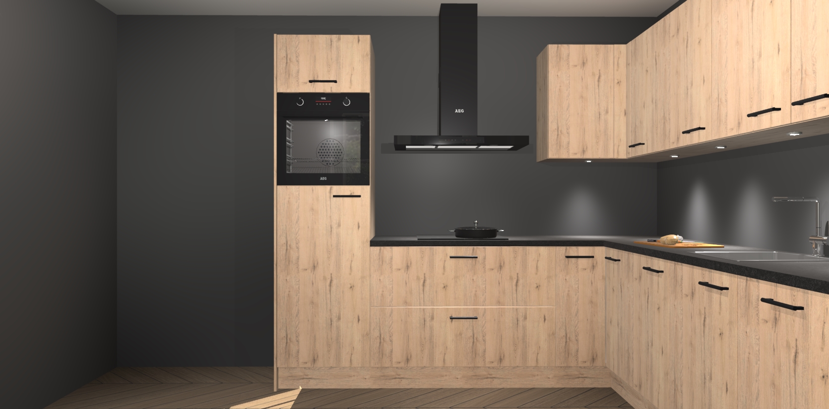 De Madera Natuur keuken Debar is uitgerust met vijf inbouwapparaten die elke kooktaak handig en efficiënt maken. Een oven, inductiekookplaat, afzuigkap, vaatwasser en koelkast zijn standaard, maar kunnen na bestelling eenvoudig worden geupgrade naar AEG. Profiteer vervolgens van de softclose deuren voor snelle toegang en geruisloze toegang.