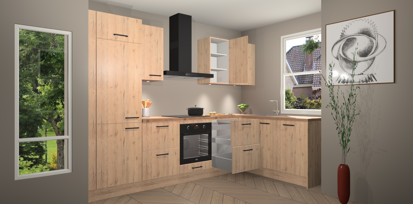 De Madera Natuur keuken Geneve is uitgerust met 5 inbouwapparaten - een oven, inductiekookplaat, afzuigkap, vaatwasser en koelkast - voor al uw kook- en bewaarbehoeftes. U kunt deze apparaten desgewenst eenvoudig upgraden naar AEG of de oven omruilen voor een combimagnetron na het plaatsen van uw bestelling. En met de soft close deuren, voldoende opbergruimte en kasten die voorgemonteerd worden geleverd, bent u in een mum van tijd klaar om heerlijke maaltijden te bereiden!