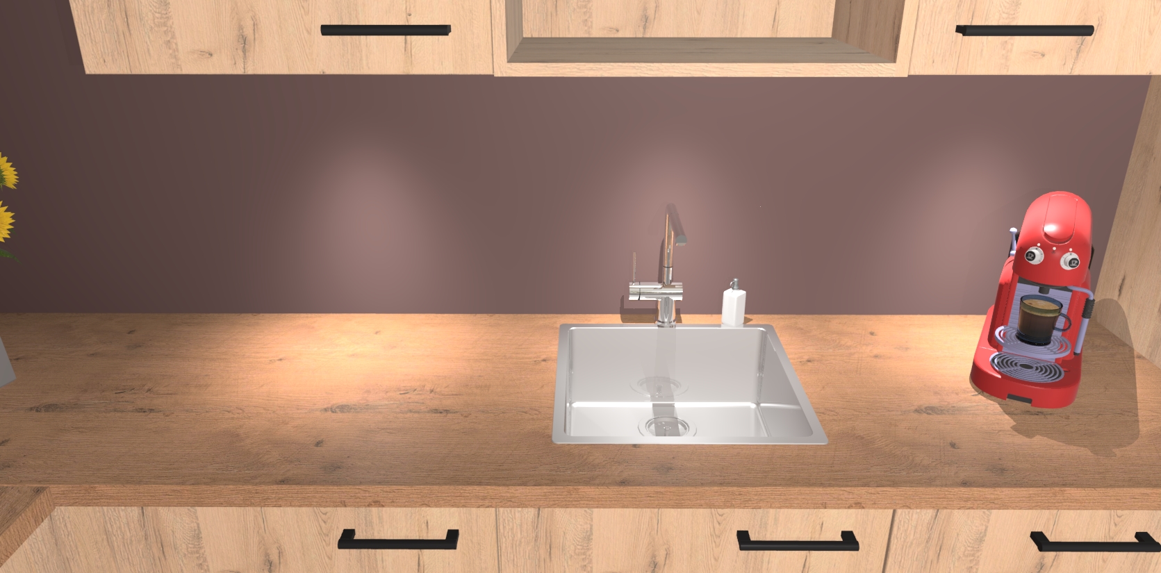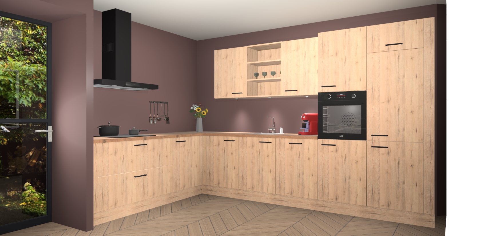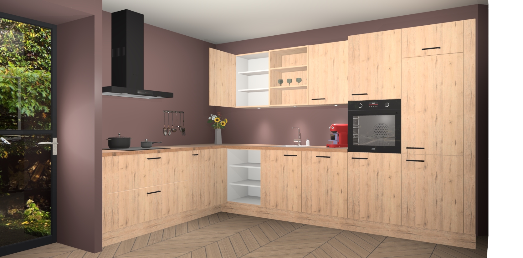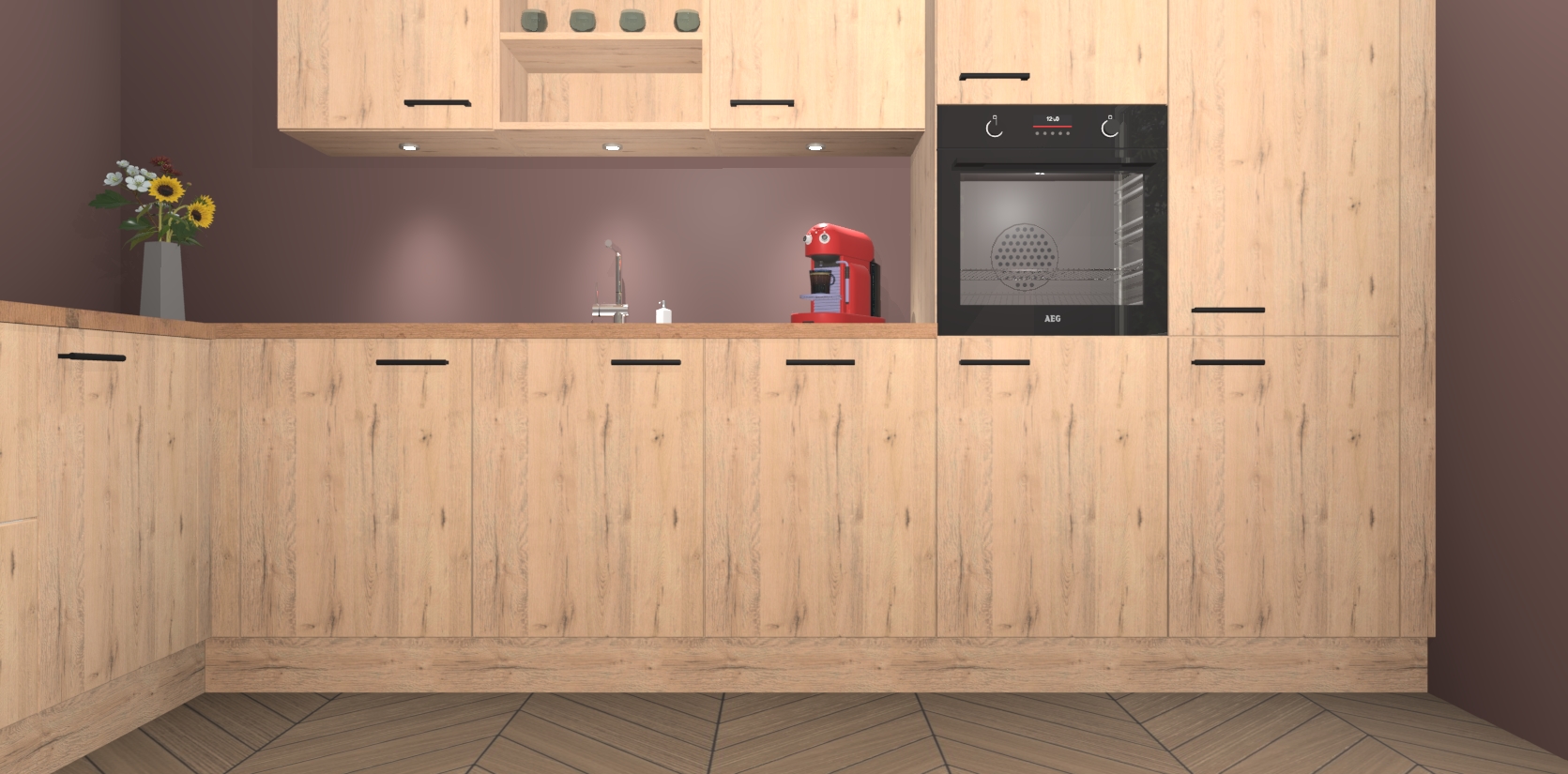 Over opbergruimte hoeft u zich ook geen zorgen te maken! Er is voldoende ruimte voor al uw culinaire behoeftes. Plus, we hebben al 5 inbouwapparaten meegeleverd die gemakkelijk na uw bestelling te upgraden zijn naar AEG: een oven, inductiekookplaat, afzuigkap, vaatwasser en koelkast. En maakt u zich geen zorgen - alle deuren sluiten zacht, dus u hoeft zich geen zorgen te maken over dichtslaande deuren of lawaai terwijl u kookt.