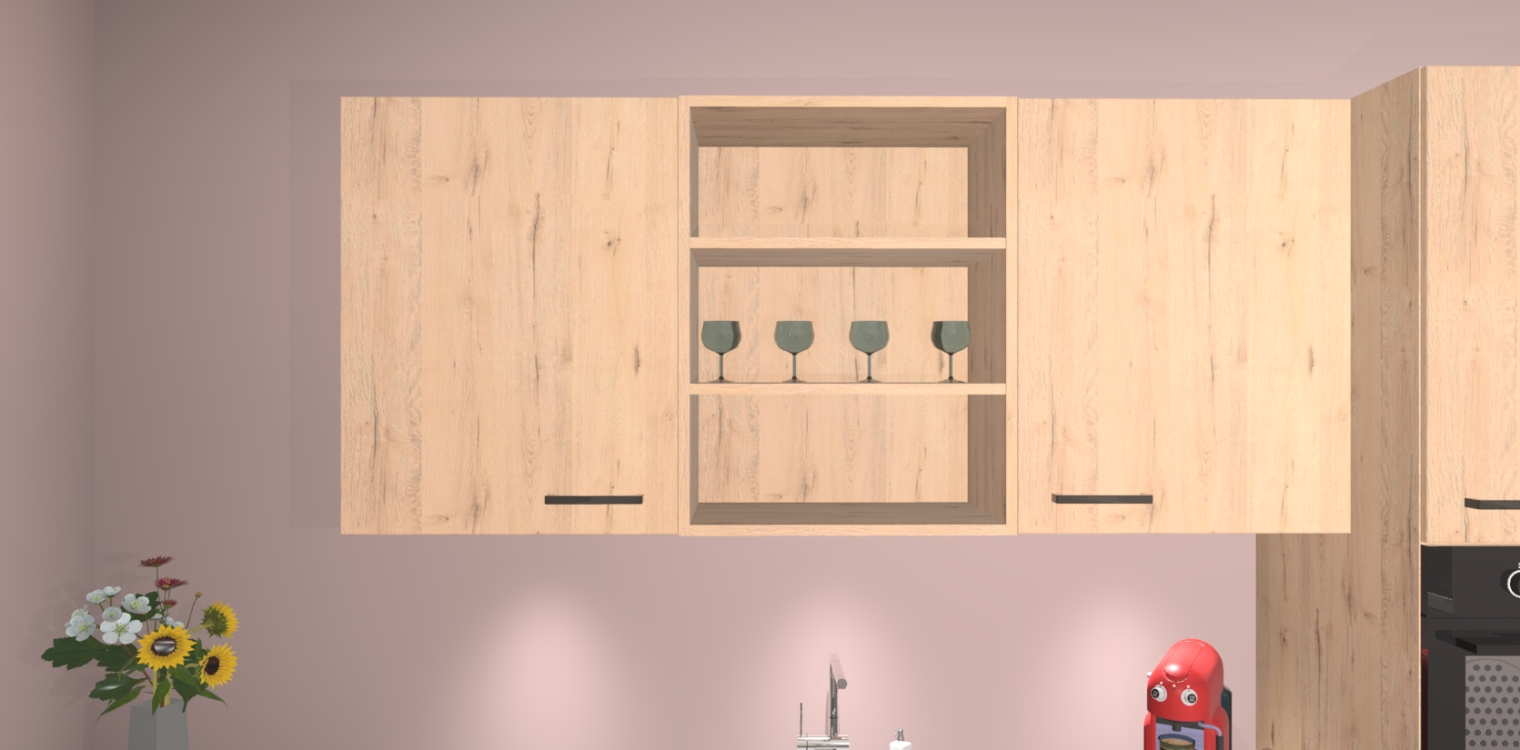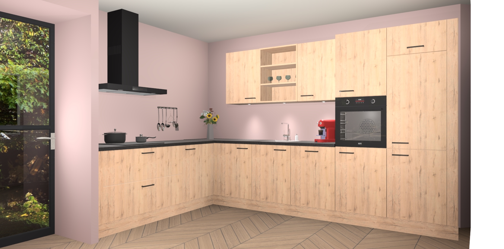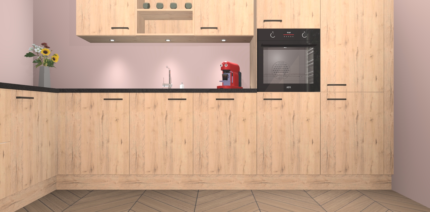 Over opbergruimte hoeft u zich ook geen zorgen te maken! Er is voldoende ruimte voor al uw culinaire behoeftes. Plus, we hebben al 5 inbouwapparaten meegeleverd die gemakkelijk na uw bestelling te upgraden zijn naar AEG: een oven, inductiekookplaat, afzuigkap, vaatwasser en koelkast. En maakt u zich geen zorgen - alle deuren sluiten zacht, dus u hoeft zich geen zorgen te maken over dichtslaande deuren of lawaai terwijl u kookt.