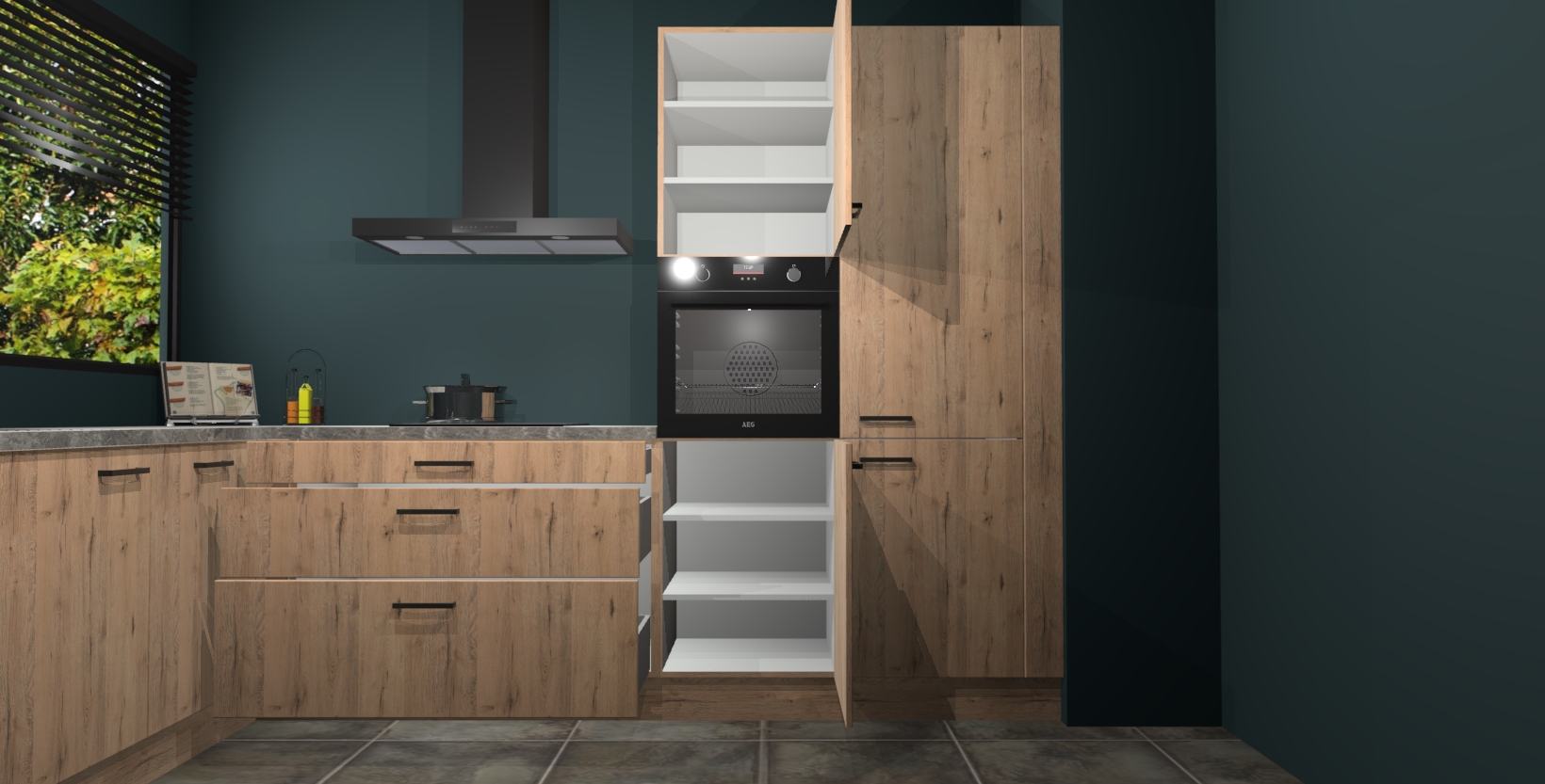 Met een modern, tijdloos design en ruime opslagruimte, zult u zich in no-time thuis voelen in uw nieuwe keuken. Uw leven wordt eenvoudiger met de soft-close deuren die voor het ultieme stille comfort zorgen - geen geluid dat u stoort terwijl u kookt. Ook is de keuken voorzien van 5 ingebouwde apparaten: een oven, inductie kookplaat, afzuigkap, vaatwasser en koelkast. Deze kunnen gemakkelijk na bestelling worden bijgewerkt naar AEG - waardoor uw luxe ervaring compleet is.