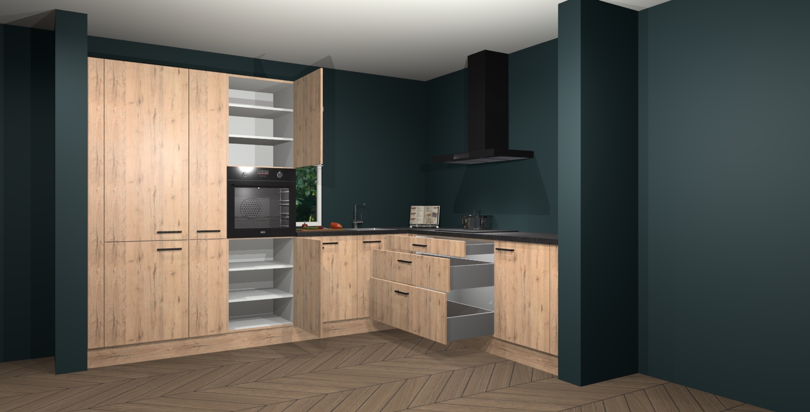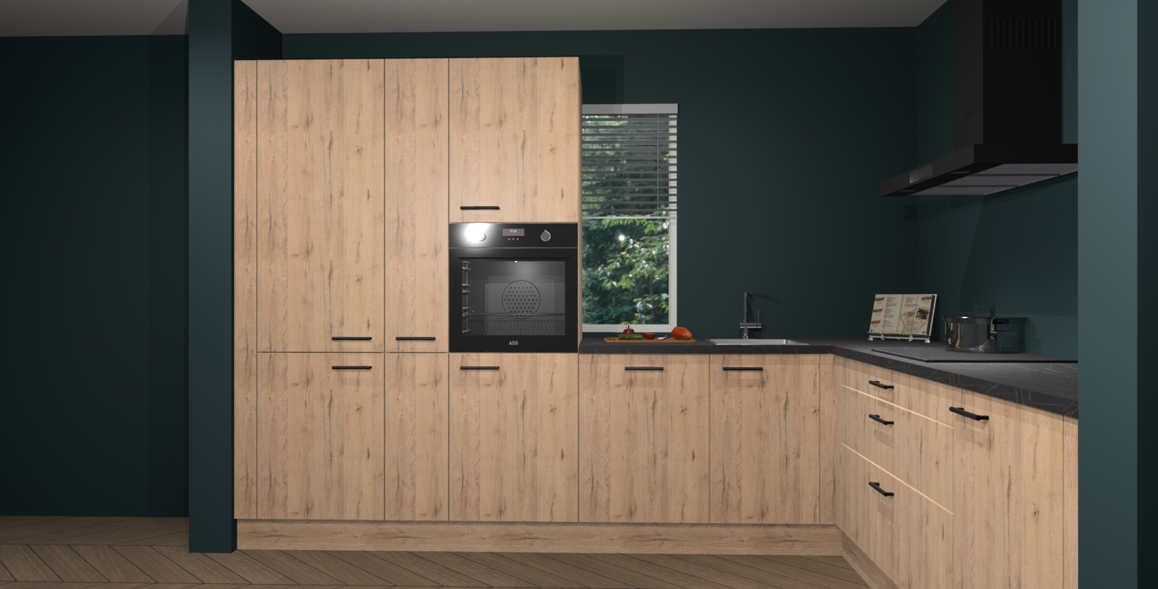 Met een modern, tijdloos design en ruime opslagruimte, zult u zich in no-time thuis voelen in uw nieuwe keuken. Uw leven wordt eenvoudiger met de soft-close deuren die voor het ultieme stille comfort zorgen - geen geluid dat u stoort terwijl u kookt. Ook is de keuken voorzien van 5 ingebouwde apparaten: een oven, inductie kookplaat, afzuigkap, vaatwasser en koelkast. Deze kunnen gemakkelijk na bestelling worden bijgewerkt naar AEG - waardoor uw luxe ervaring compleet is.