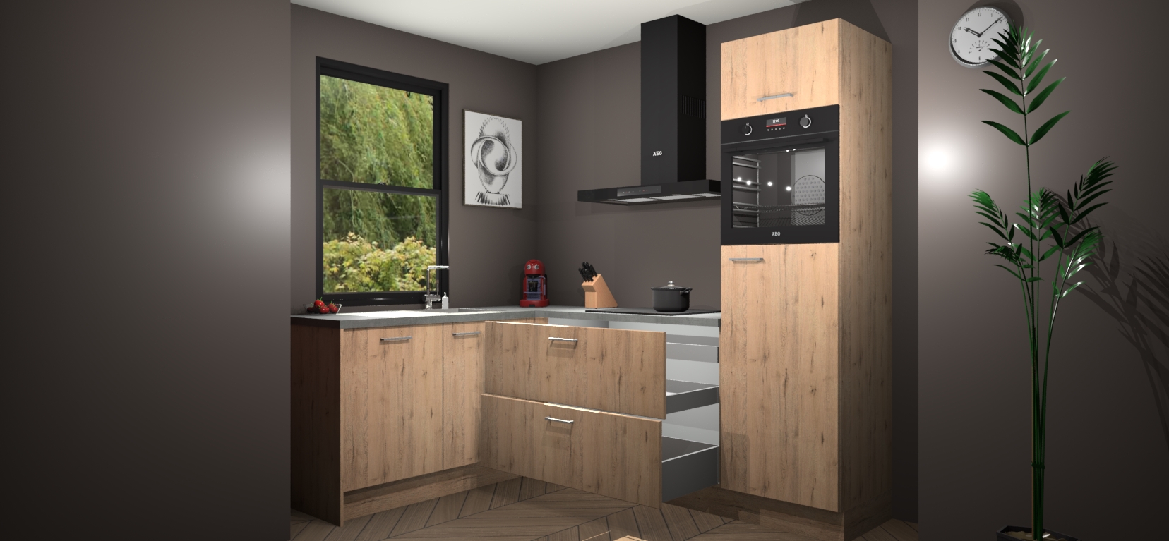 Deze prachtige hoekkeuken heeft alle benodigdheden om uw droomkook- en eetruimte compleet te maken. De Madera Natuur kasten bieden een echo van raffinement, terwijl de 5 inbouwapparaten genoeg opties bieden voor het bereiden van heerlijke maaltijden. De oven, inductiekookplaat, afzuigkap, vaatwasser en koelkast zorgen ervoor dat u tijd in de keuken zo efficiënt mogelijk verloopt, terwijl ze ook dat extra vleugje luxe bieden.