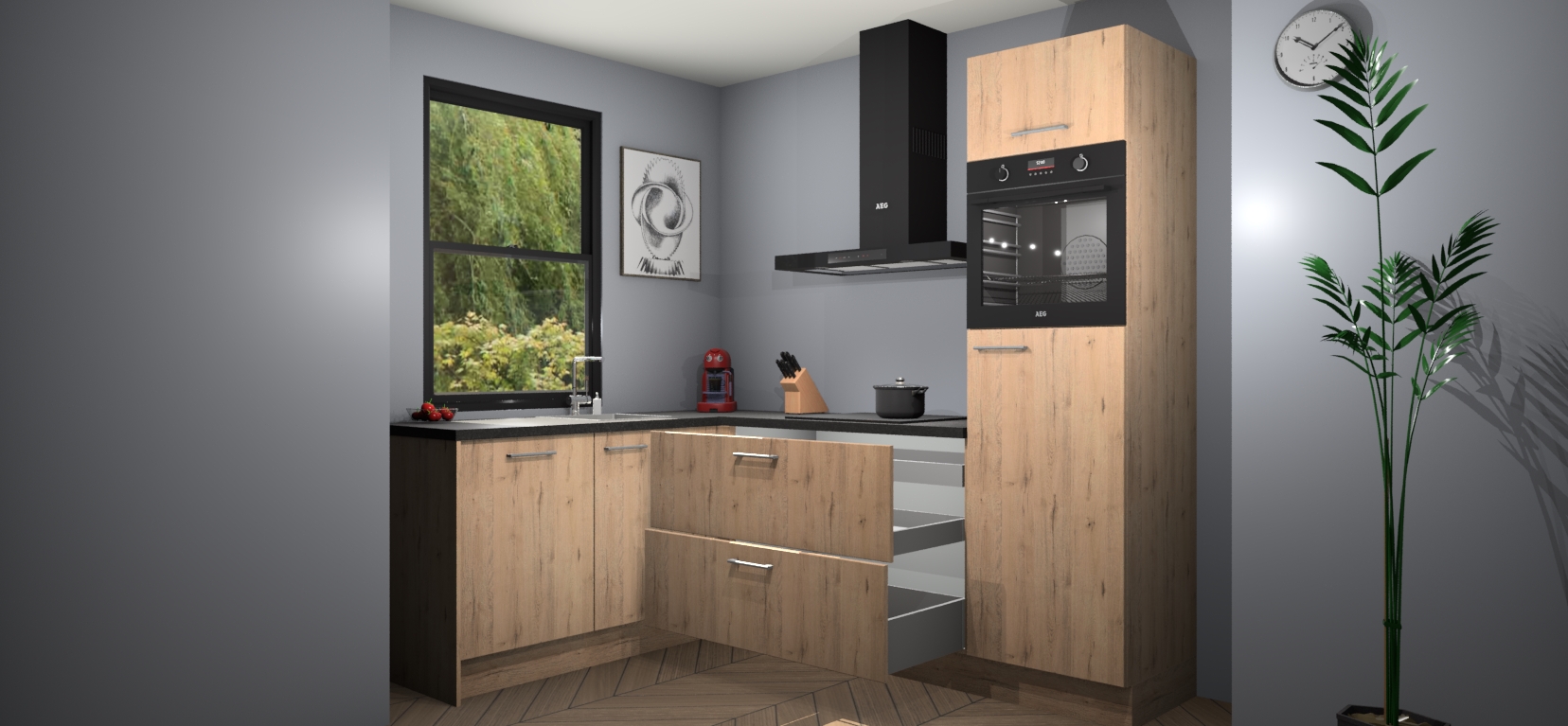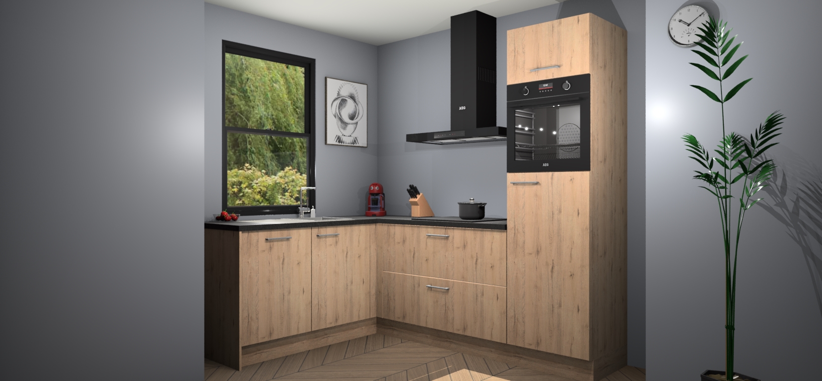 Deze prachtige hoekkeuken heeft alle benodigdheden om uw droomkook- en eetruimte compleet te maken. De Madera Natuur kasten bieden een echo van raffinement, terwijl de 5 inbouwapparaten genoeg opties bieden voor het bereiden van heerlijke maaltijden. De oven, inductiekookplaat, afzuigkap, vaatwasser en koelkast zorgen ervoor dat u tijd in de keuken zo efficiënt mogelijk verloopt, terwijl ze ook dat extra vleugje luxe bieden.