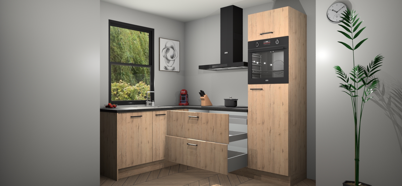 Deze prachtige hoekkeuken heeft alle benodigdheden om uw droomkook- en eetruimte compleet te maken. De Madera Natuur kasten bieden een echo van raffinement, terwijl de 5 inbouwapparaten genoeg opties bieden voor het bereiden van heerlijke maaltijden. De oven, inductiekookplaat, afzuigkap, vaatwasser en koelkast zorgen ervoor dat u tijd in de keuken zo efficiënt mogelijk verloopt, terwijl ze ook dat extra vleugje luxe bieden.