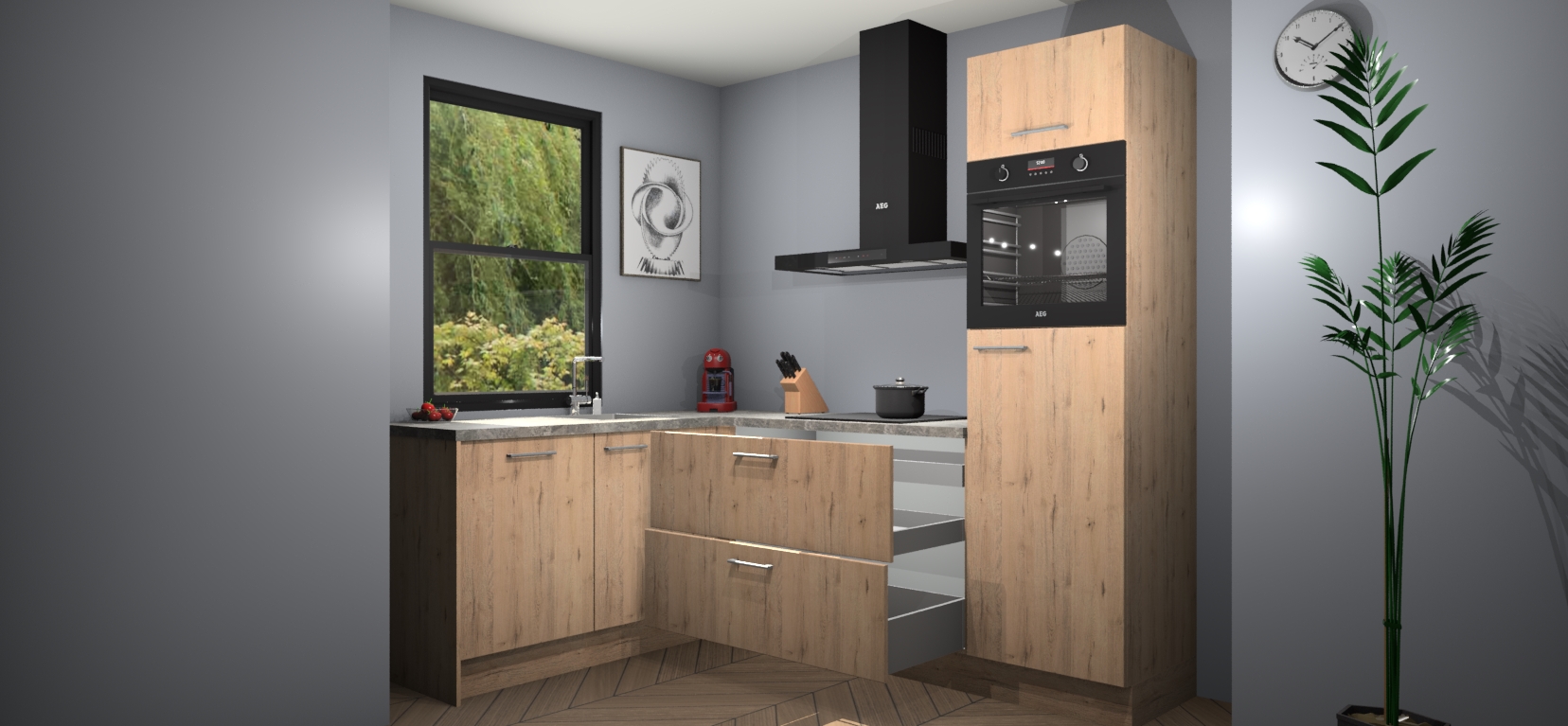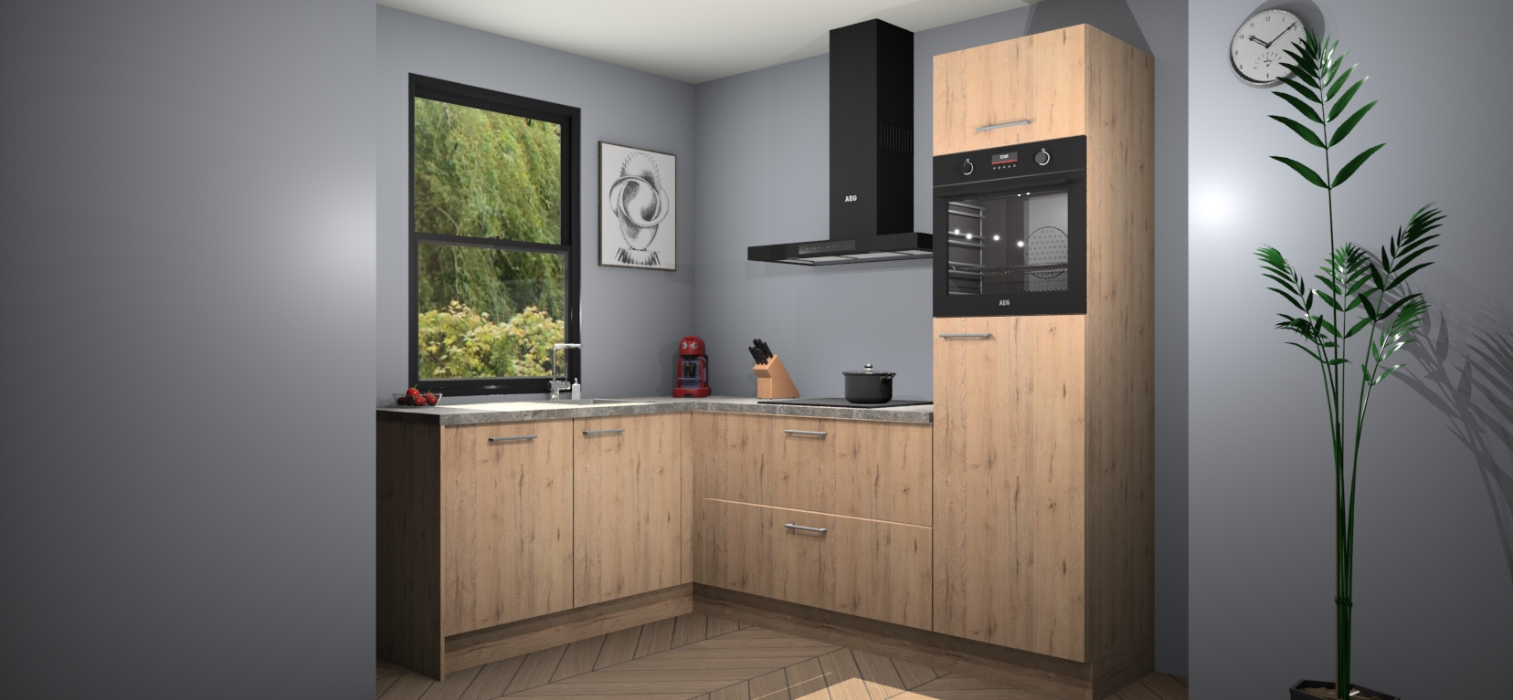 Deze prachtige hoekkeuken heeft alle benodigdheden om uw droomkook- en eetruimte compleet te maken. De Madera Natuur kasten bieden een echo van raffinement, terwijl de 5 inbouwapparaten genoeg opties bieden voor het bereiden van heerlijke maaltijden. De oven, inductiekookplaat, afzuigkap, vaatwasser en koelkast zorgen ervoor dat u tijd in de keuken zo efficiënt mogelijk verloopt, terwijl ze ook dat extra vleugje luxe bieden.