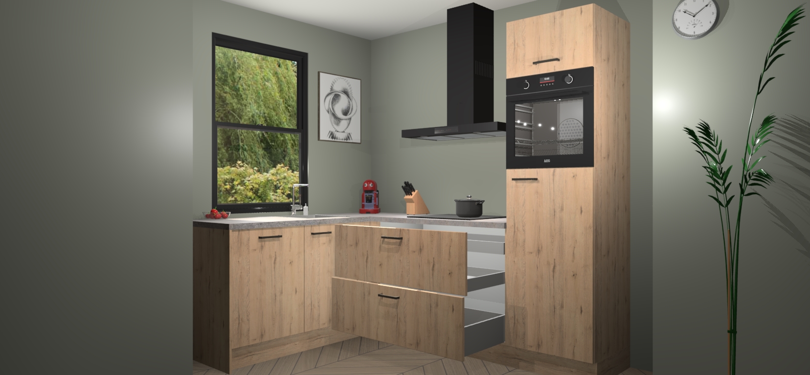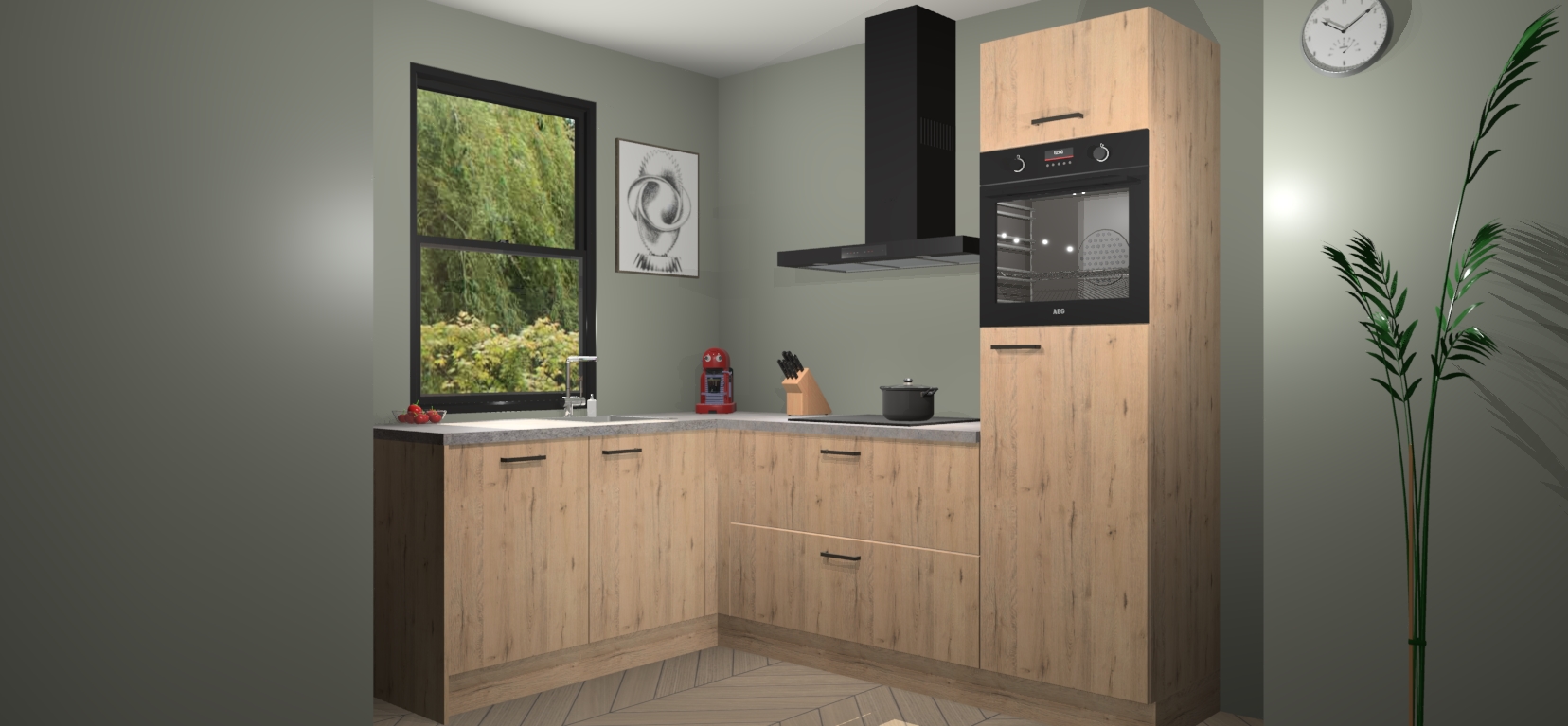 Deze prachtige hoekkeuken heeft alle benodigdheden om uw droomkook- en eetruimte compleet te maken. De Madera Natuur kasten bieden een echo van raffinement, terwijl de 5 inbouwapparaten genoeg opties bieden voor het bereiden van heerlijke maaltijden. De oven, inductiekookplaat, afzuigkap, vaatwasser en koelkast zorgen ervoor dat u tijd in de keuken zo efficiënt mogelijk verloopt, terwijl ze ook dat extra vleugje luxe bieden.