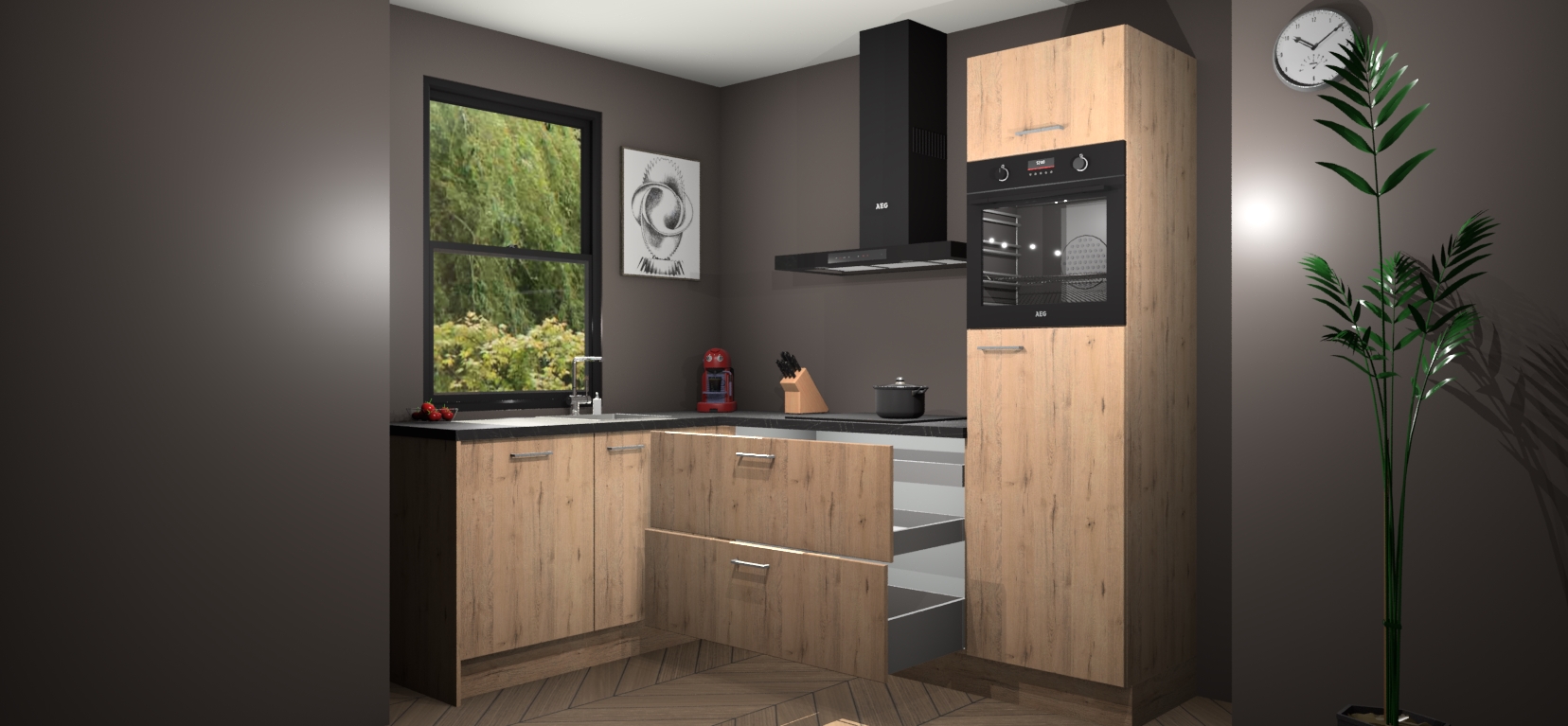 Deze prachtige hoekkeuken heeft alle benodigdheden om uw droomkook- en eetruimte compleet te maken. De Madera Natuur kasten bieden een echo van raffinement, terwijl de 5 inbouwapparaten genoeg opties bieden voor het bereiden van heerlijke maaltijden. De oven, inductiekookplaat, afzuigkap, vaatwasser en koelkast zorgen ervoor dat u tijd in de keuken zo efficiënt mogelijk verloopt, terwijl ze ook dat extra vleugje luxe bieden.