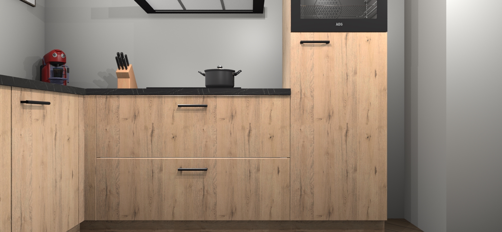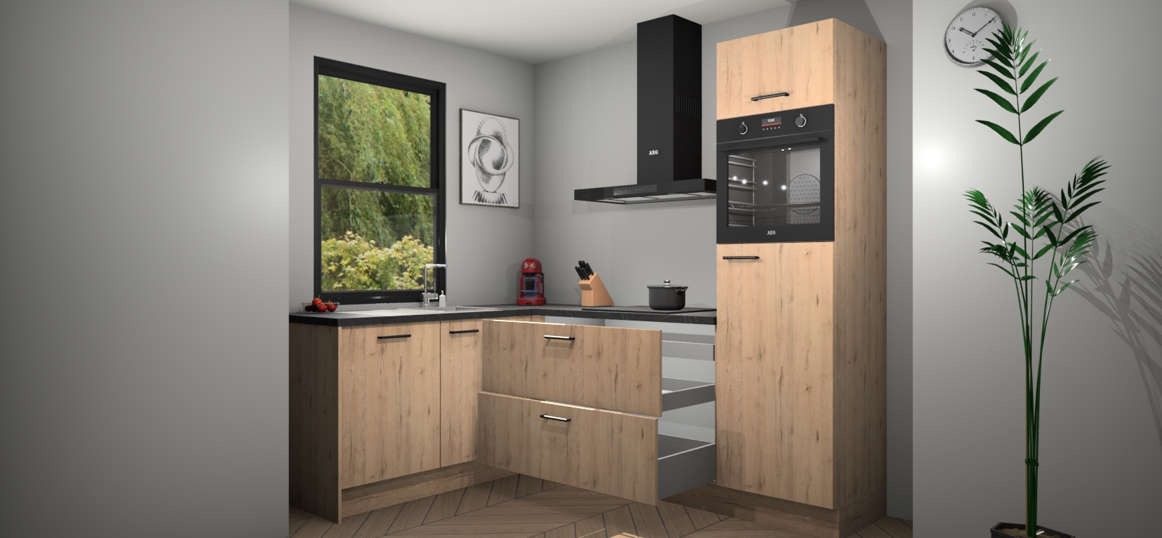 Deze prachtige hoekkeuken heeft alle benodigdheden om uw droomkook- en eetruimte compleet te maken. De Madera Natuur kasten bieden een echo van raffinement, terwijl de 5 inbouwapparaten genoeg opties bieden voor het bereiden van heerlijke maaltijden. De oven, inductiekookplaat, afzuigkap, vaatwasser en koelkast zorgen ervoor dat u tijd in de keuken zo efficiënt mogelijk verloopt, terwijl ze ook dat extra vleugje luxe bieden.