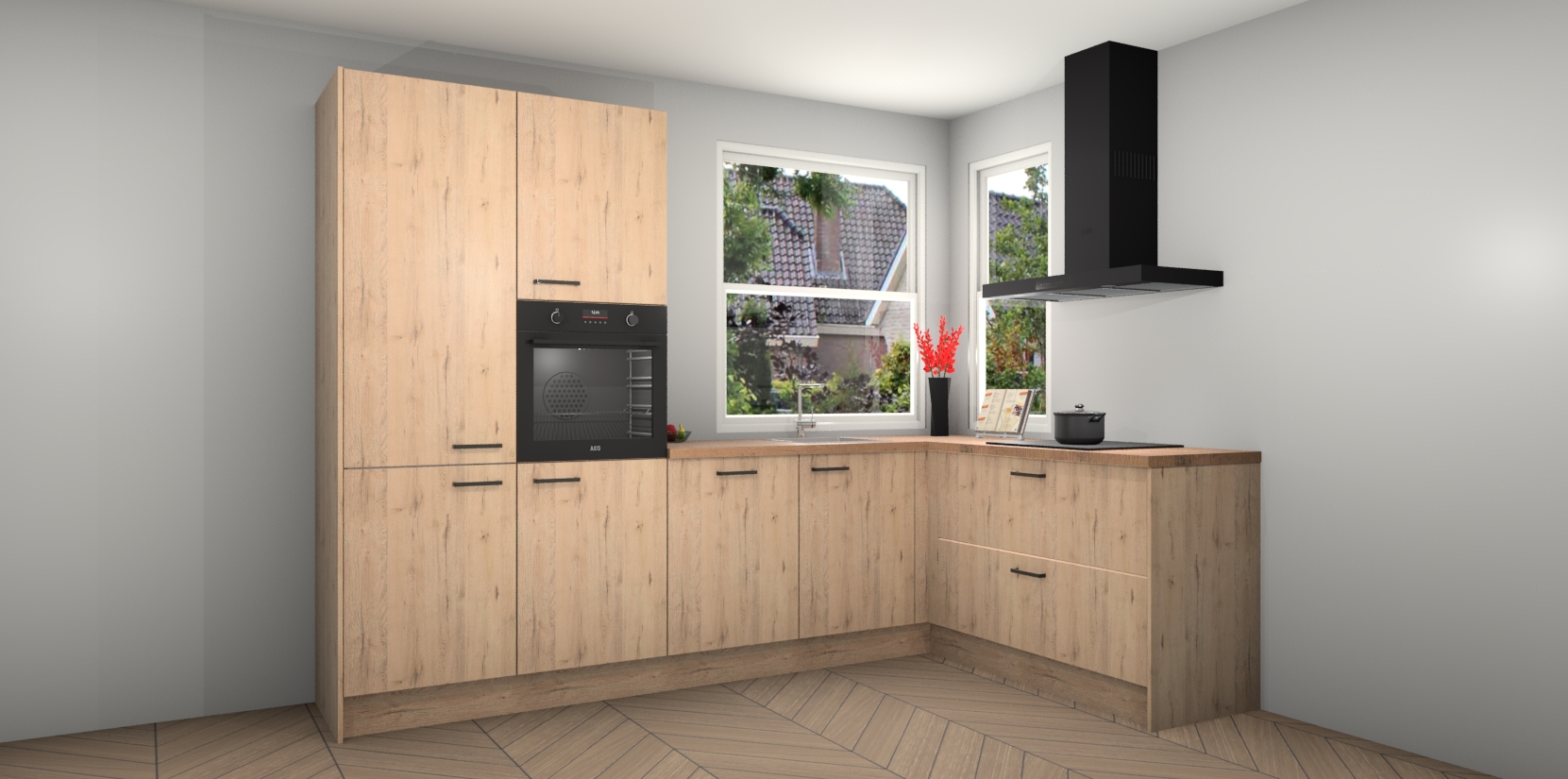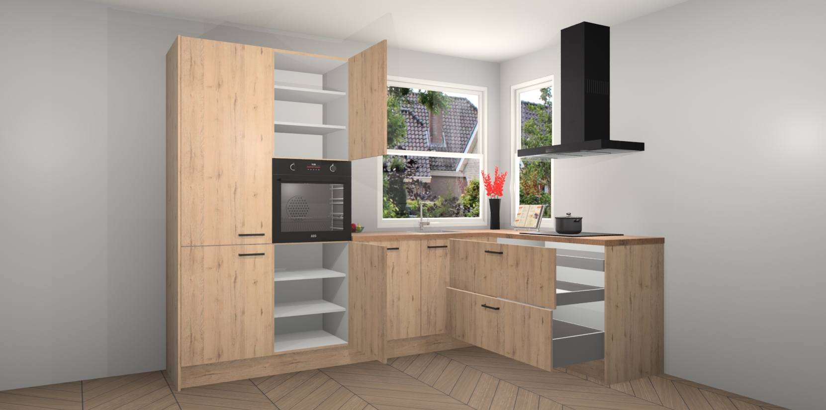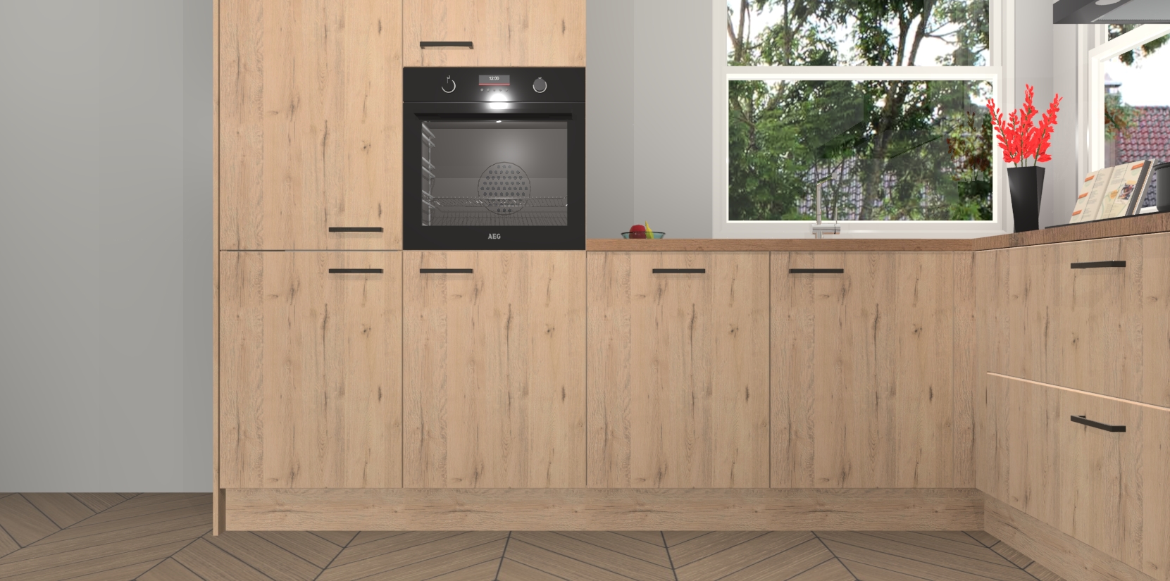 Elke Madera Natuur keuken Kotor wordt compleet geleverd met vijf inbouwapparaten, waaronder een oven, inductiekookplaat, afzuigkap, vaatwasser en koelkast. Sterker nog - indien gewenst kunt u deze apparaten na bestelling eenvoudig upgraden naar AEG! Extra functies zijn onder andere soft close deuren voor extra gemak, en elke kast wordt voor gemonteerd geleverd zodat u sneller van uw nieuwe keuken kunt genieten.
