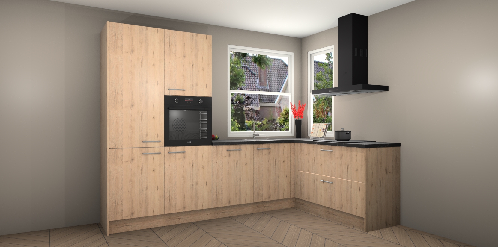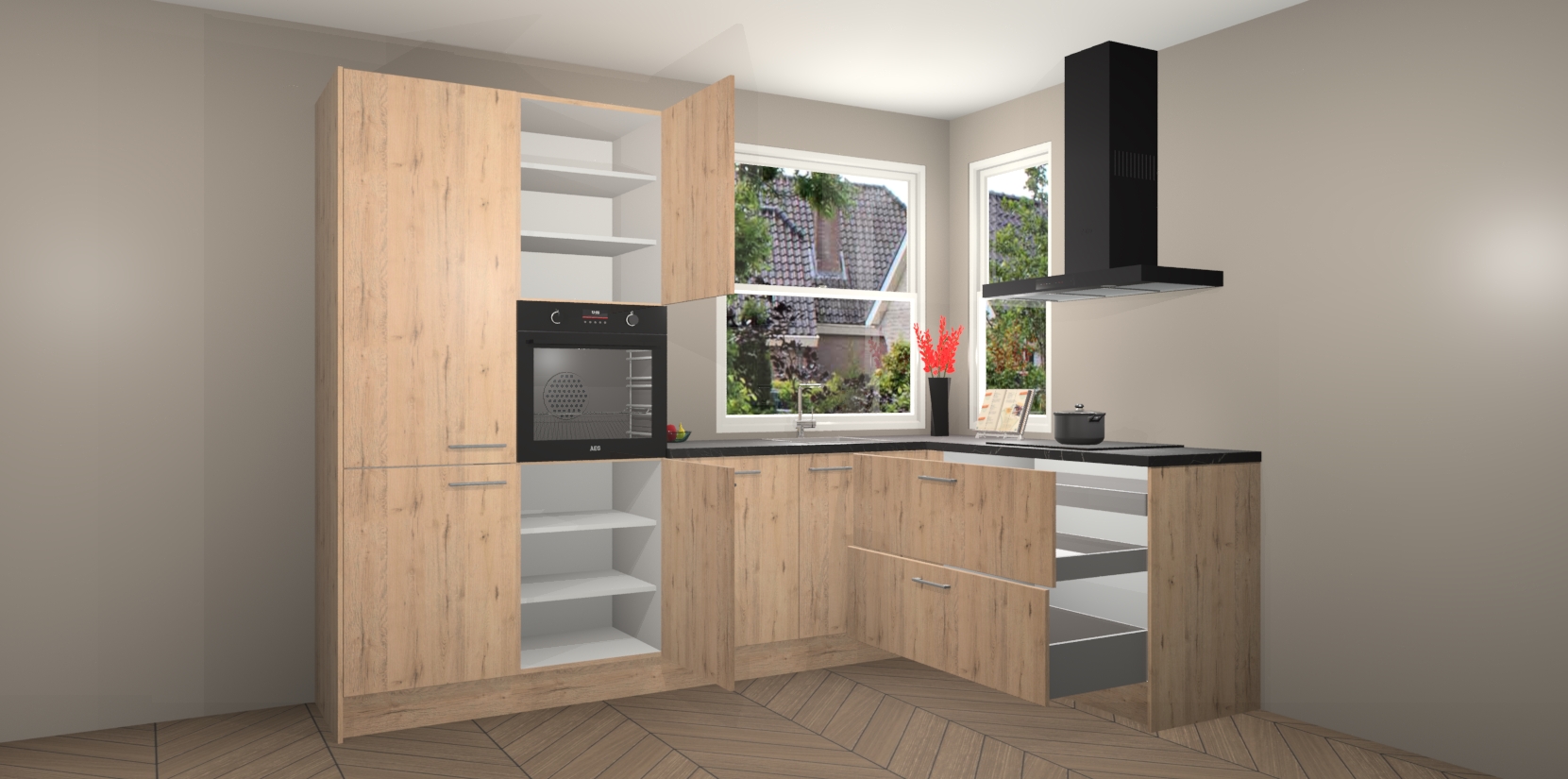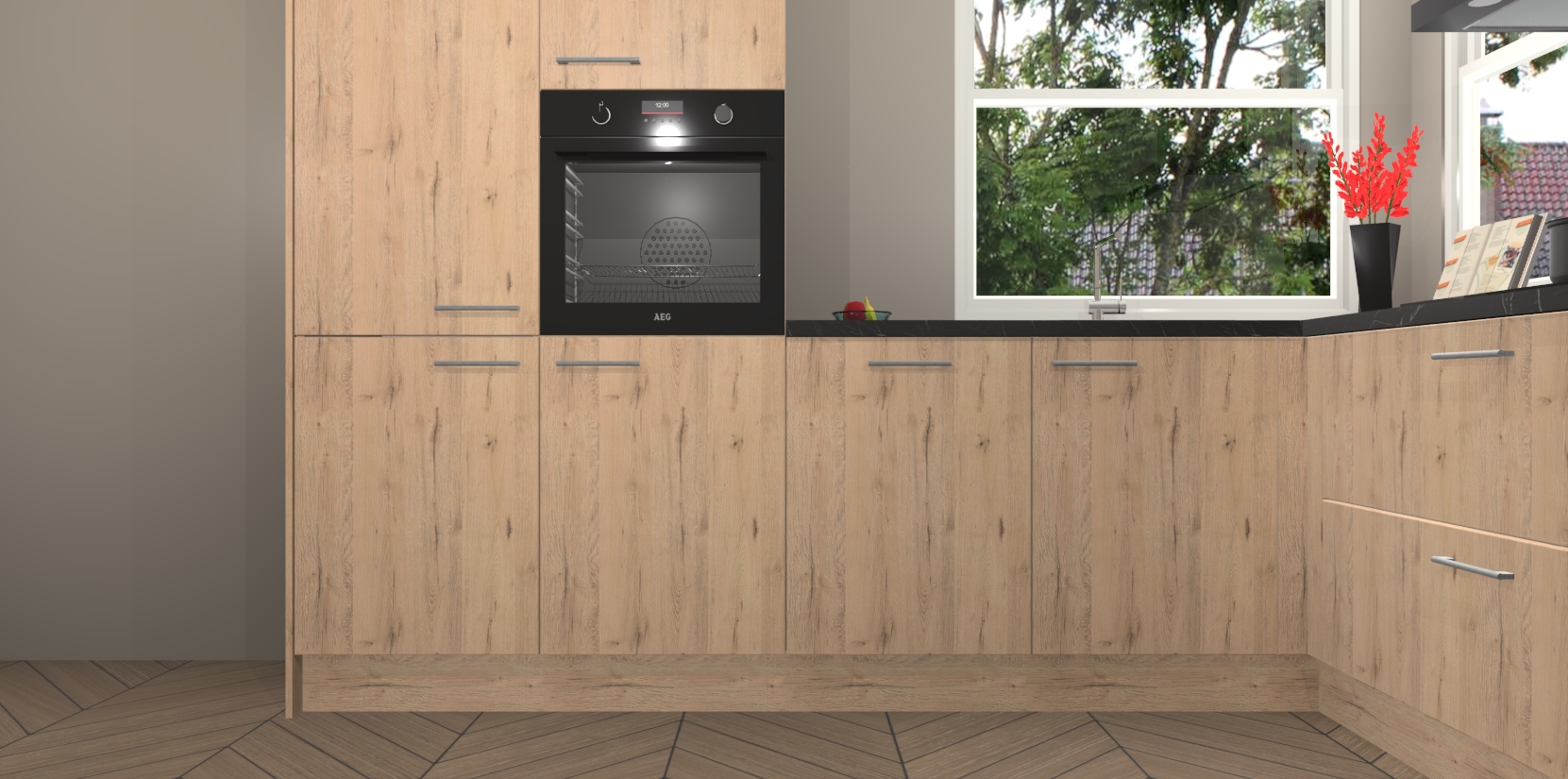 Elke Madera Natuur keuken Kotor wordt compleet geleverd met vijf inbouwapparaten, waaronder een oven, inductiekookplaat, afzuigkap, vaatwasser en koelkast. Sterker nog - indien gewenst kunt u deze apparaten na bestelling eenvoudig upgraden naar AEG! Extra functies zijn onder andere soft close deuren voor extra gemak, en elke kast wordt voor gemonteerd geleverd zodat u sneller van uw nieuwe keuken kunt genieten.