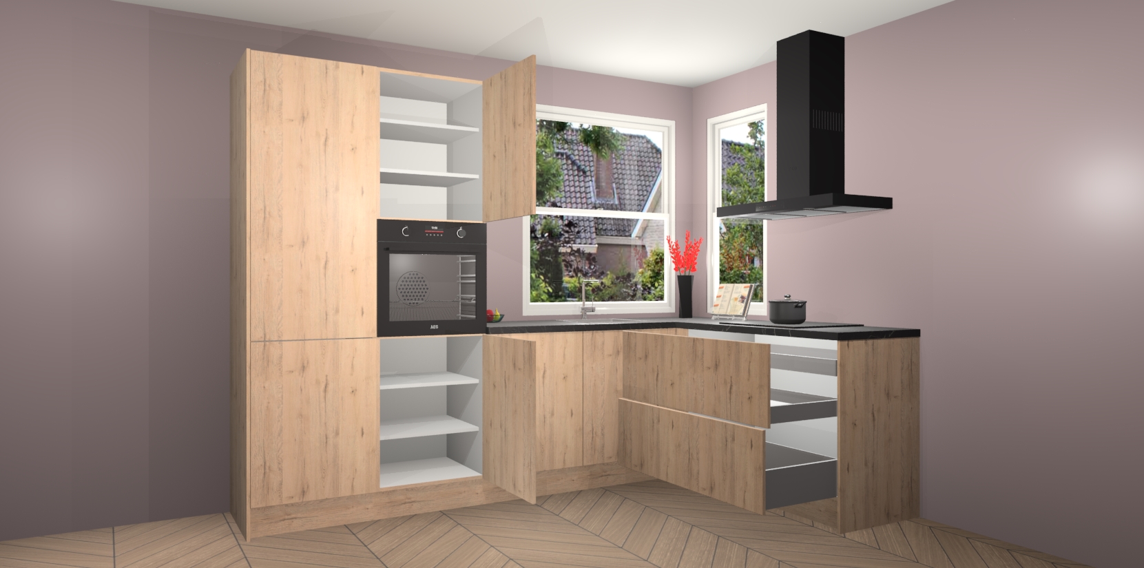 Elke Madera Natuur keuken Kotor wordt compleet geleverd met vijf inbouwapparaten, waaronder een oven, inductiekookplaat, afzuigkap, vaatwasser en koelkast. Sterker nog - indien gewenst kunt u deze apparaten na bestelling eenvoudig upgraden naar AEG! Extra functies zijn onder andere soft close deuren voor extra gemak, en elke kast wordt voor gemonteerd geleverd zodat u sneller van uw nieuwe keuken kunt genieten.