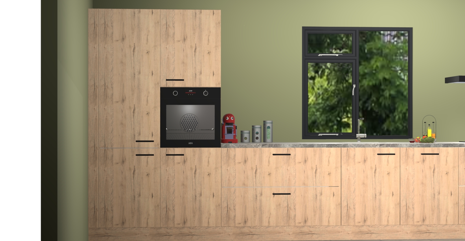 De Madera natuur keuken Lille wordt geleverd met vijf inbouwapparaten - een oven, inductiekookplaat, afzuigkap, vaatwasser en koelkast. Maar dat is nog niet alles! Na bestelling kunnen deze apparaten eenvoudig worden geüpgraded naar premium AEG-apparatuur. Bovendien is er zelfs de optie om de oven te vervangen door een combimagnetron of uw inductiekookplaat te vervangen door een kookplaat met geïntegreerde afzuiging.