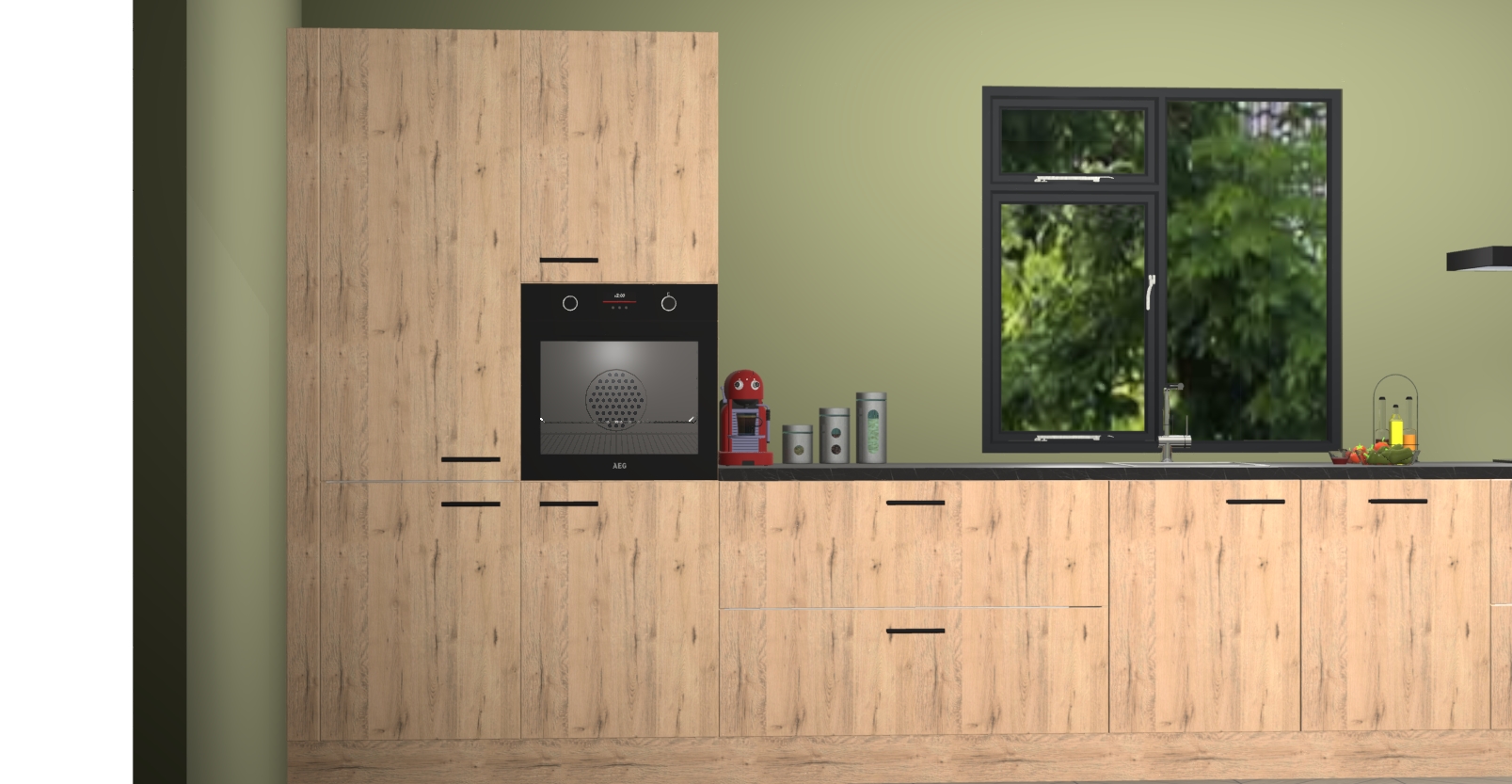De Madera natuur keuken Lille wordt geleverd met vijf inbouwapparaten - een oven, inductiekookplaat, afzuigkap, vaatwasser en koelkast. Maar dat is nog niet alles! Na bestelling kunnen deze apparaten eenvoudig worden geüpgraded naar premium AEG-apparatuur. Bovendien is er zelfs de optie om de oven te vervangen door een combimagnetron of uw inductiekookplaat te vervangen door een kookplaat met geïntegreerde afzuiging.