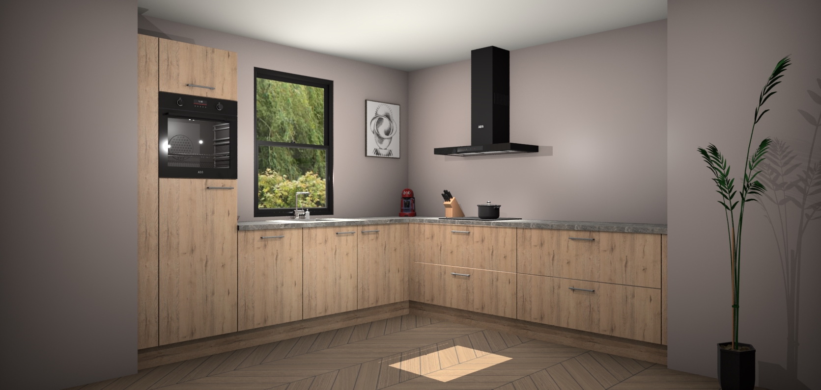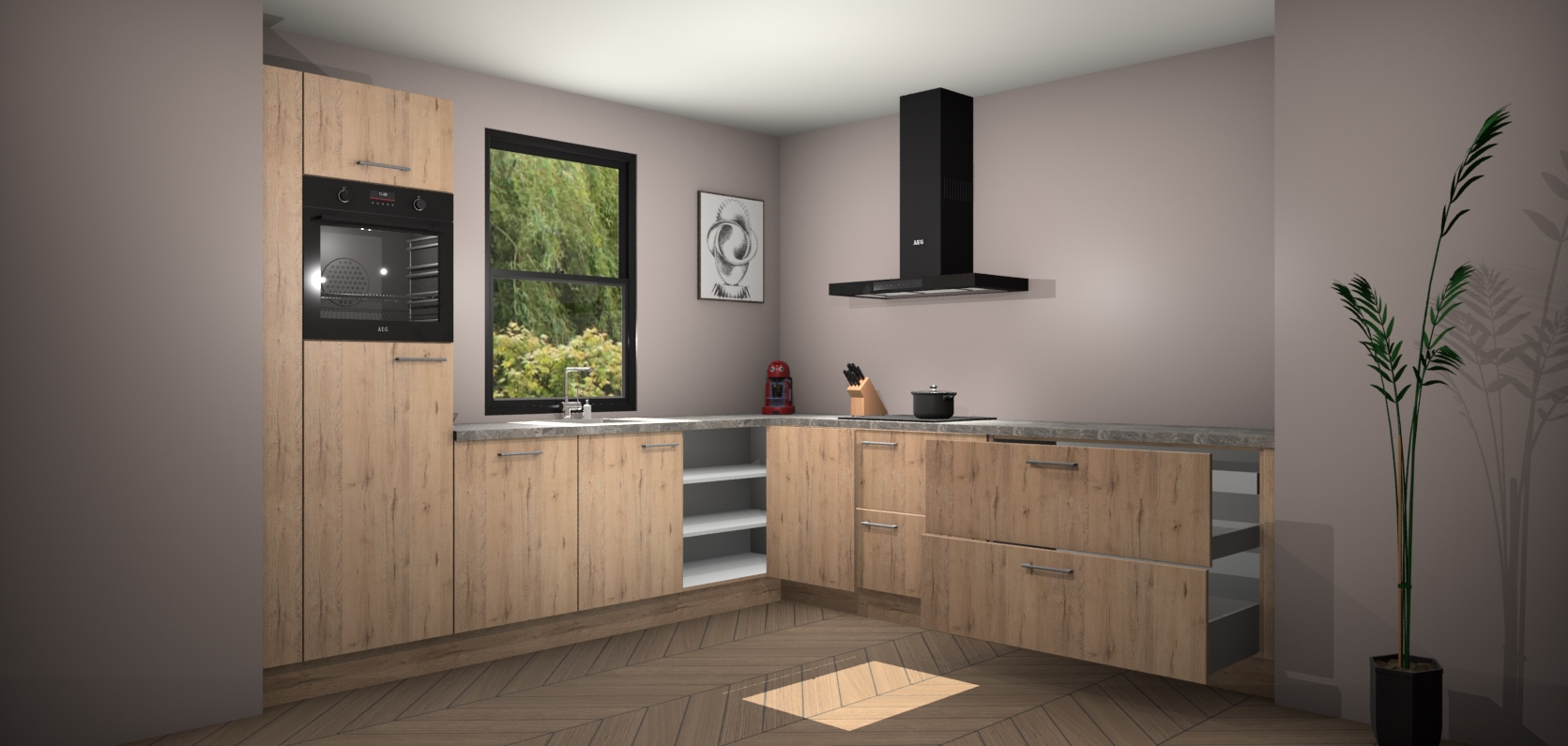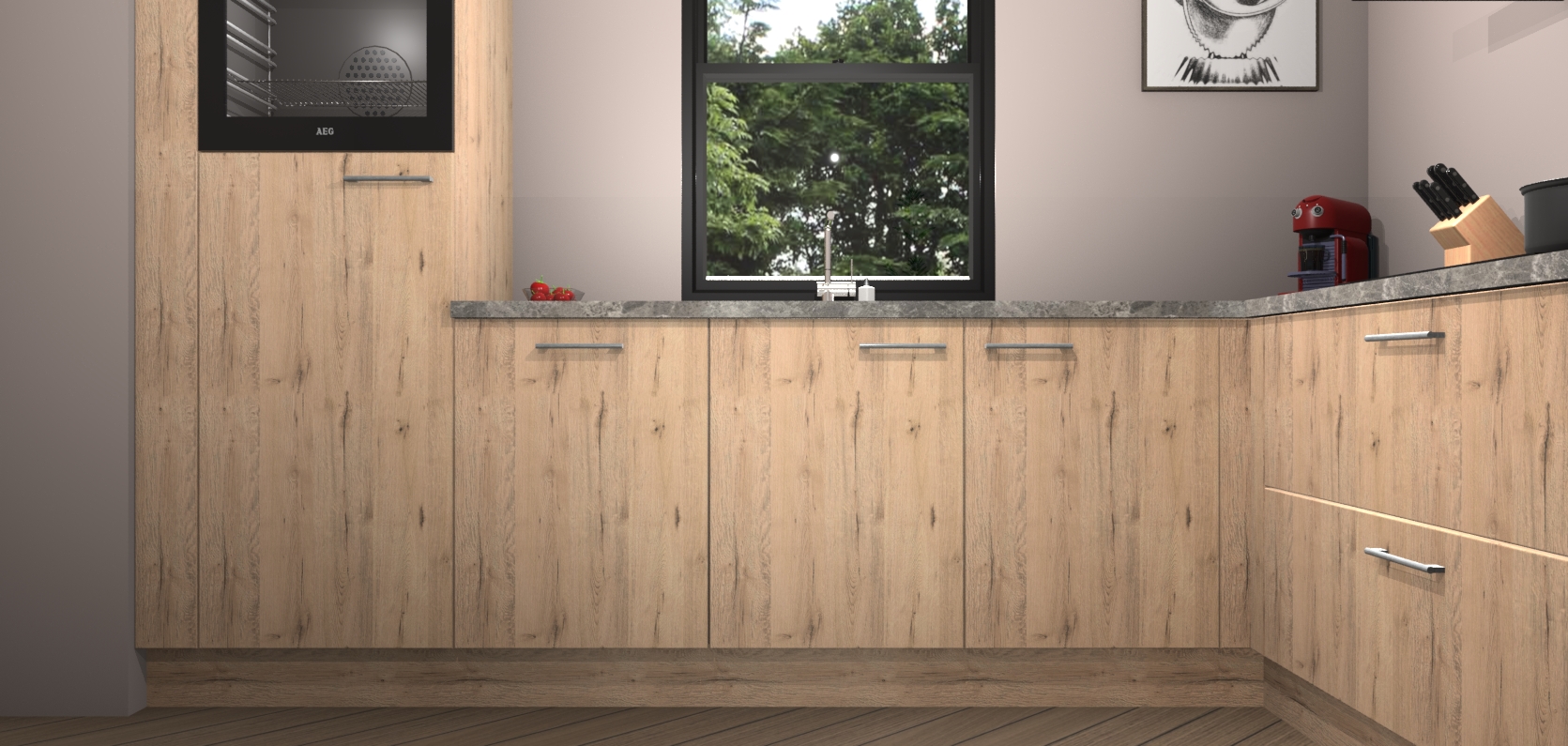 Welkom bij de madera natuur keuken Lublin. Deze prachtige keuken zal de komende jaren het middelpunt van de belangstelling in uw huis zijn. Uitgerust met vijf inbouwapparaten komt u nooit kookgereedschap tekort. Bovendien geeft de warme houtlook elke ruimte een uitnodigende en tijdloze uitstraling.
