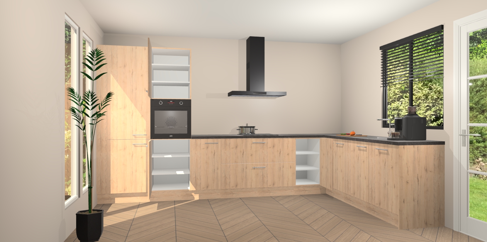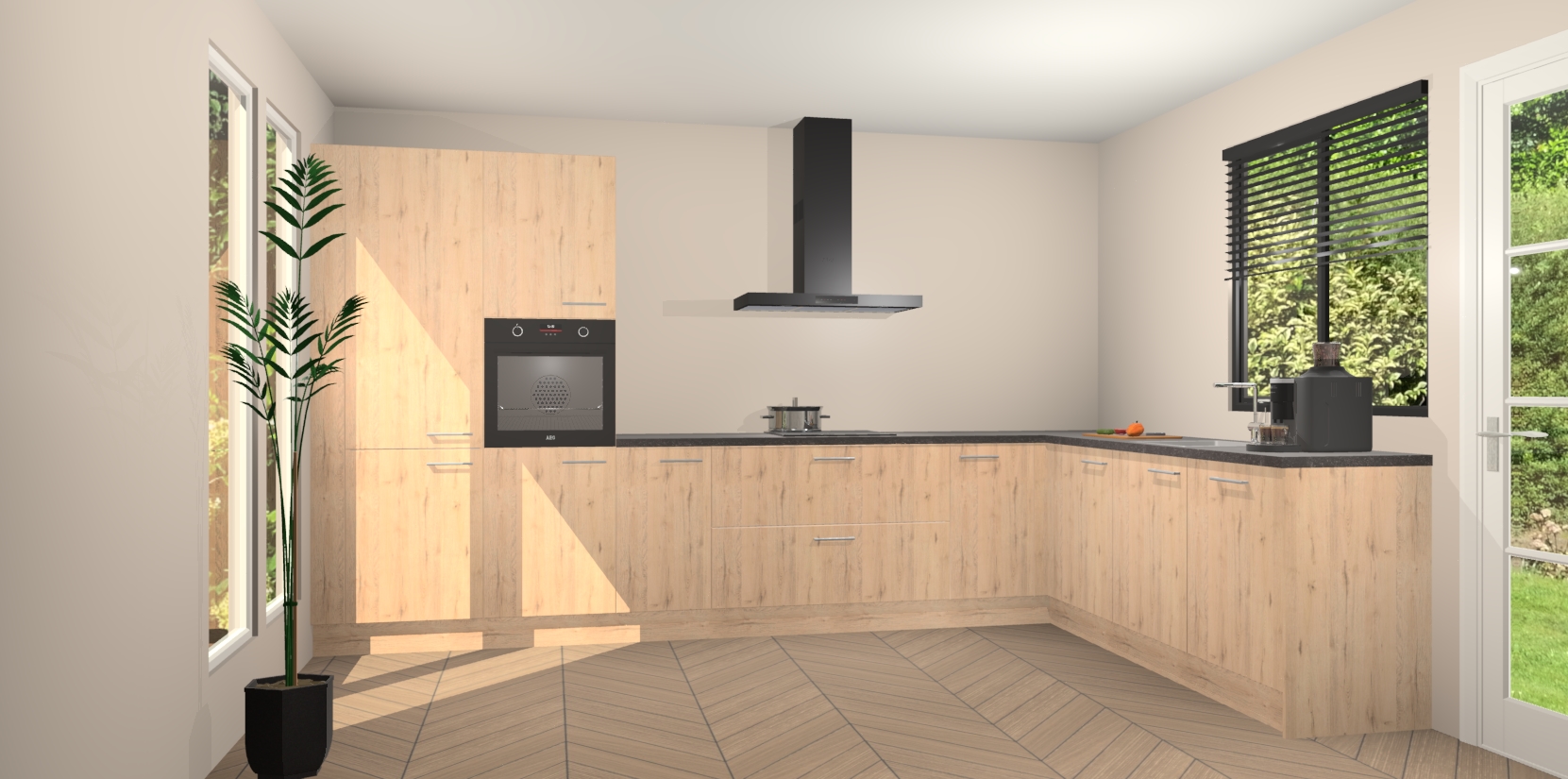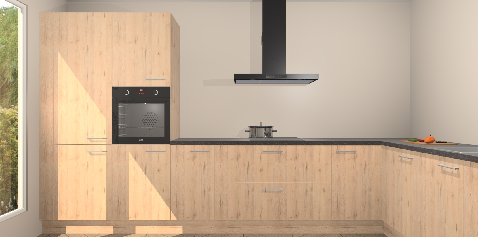 Met een modern, tijdloos design en ruime opslagruimte, zult u zich in no-time thuis voelen in uw nieuwe keuken. Uw leven wordt eenvoudiger met de soft-close deuren die voor het ultieme stille comfort zorgen - geen geluid dat u stoort terwijl u kookt. Ook is de keuken voorzien van 5 ingebouwde apparaten: een oven, inductie kookplaat, afzuigkap, vaatwasser en koelkast. Deze kunnen gemakkelijk na bestelling worden bijgewerkt naar AEG - waardoor uw luxe ervaring compleet is.