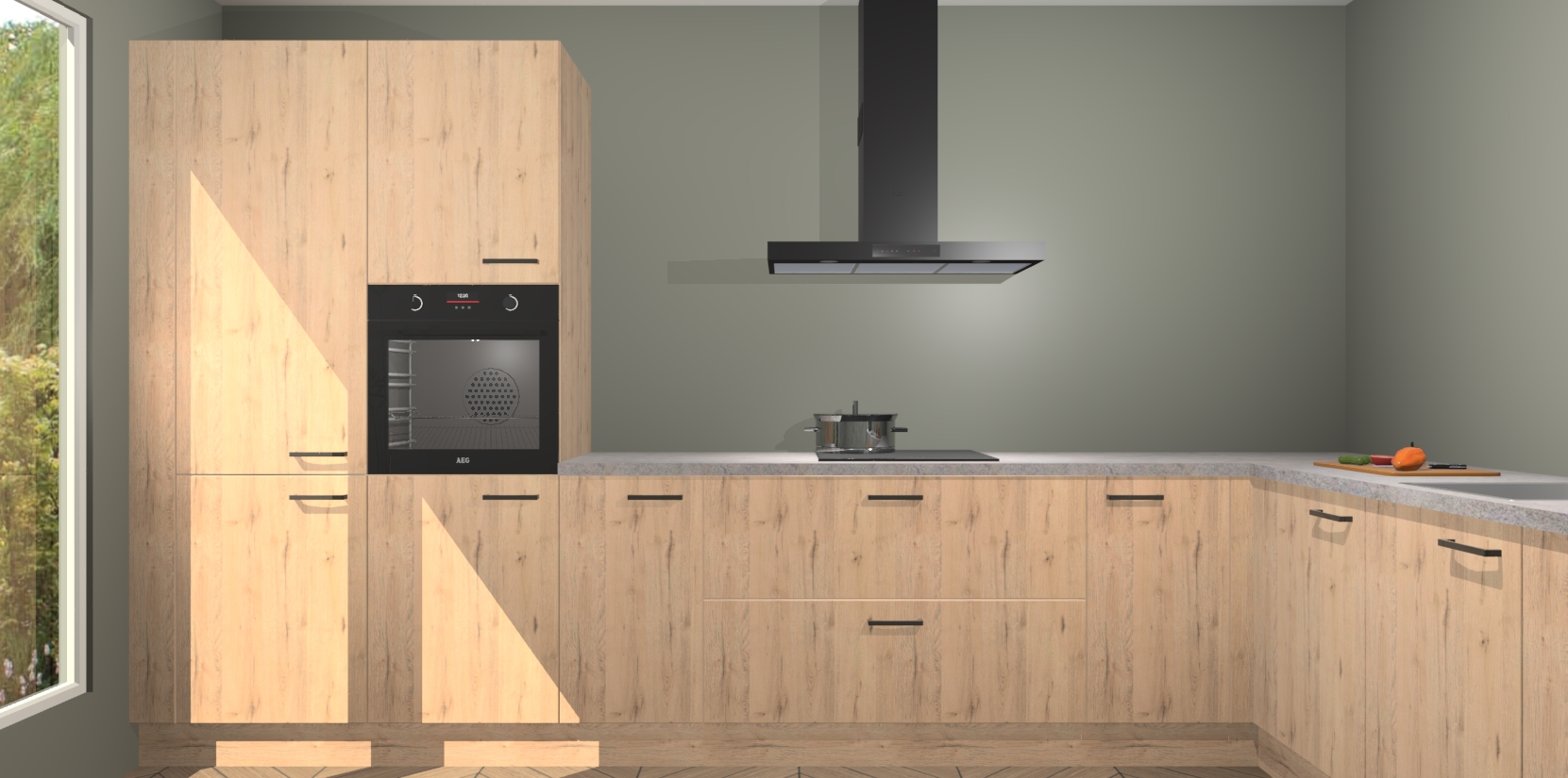 Met een modern, tijdloos design en ruime opslagruimte, zult u zich in no-time thuis voelen in uw nieuwe keuken. Uw leven wordt eenvoudiger met de soft-close deuren die voor het ultieme stille comfort zorgen - geen geluid dat u stoort terwijl u kookt. Ook is de keuken voorzien van 5 ingebouwde apparaten: een oven, inductie kookplaat, afzuigkap, vaatwasser en koelkast. Deze kunnen gemakkelijk na bestelling worden bijgewerkt naar AEG - waardoor uw luxe ervaring compleet is.