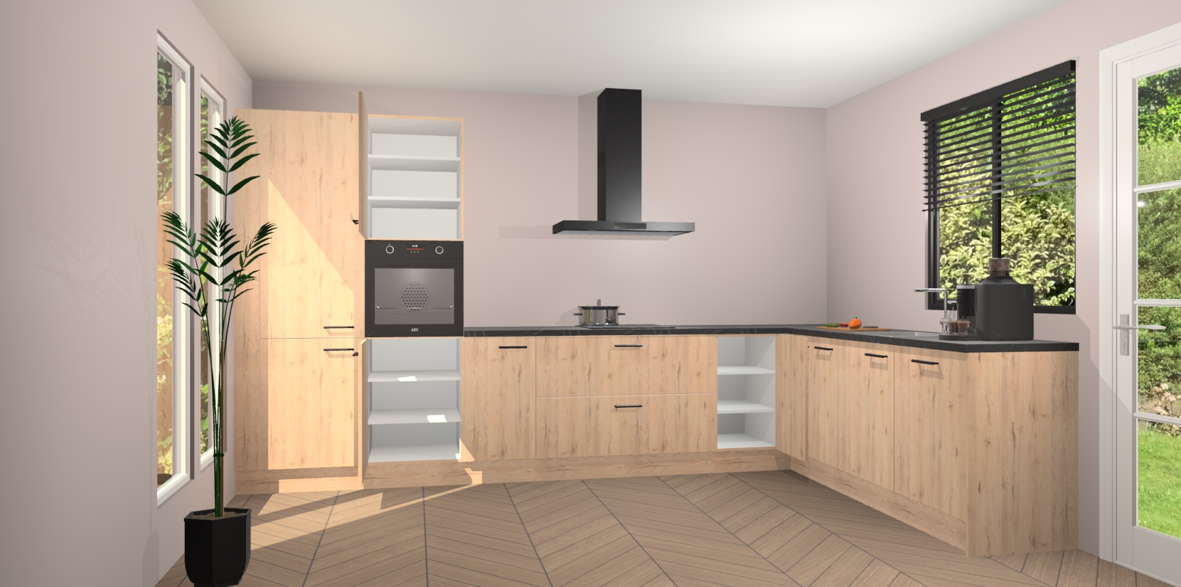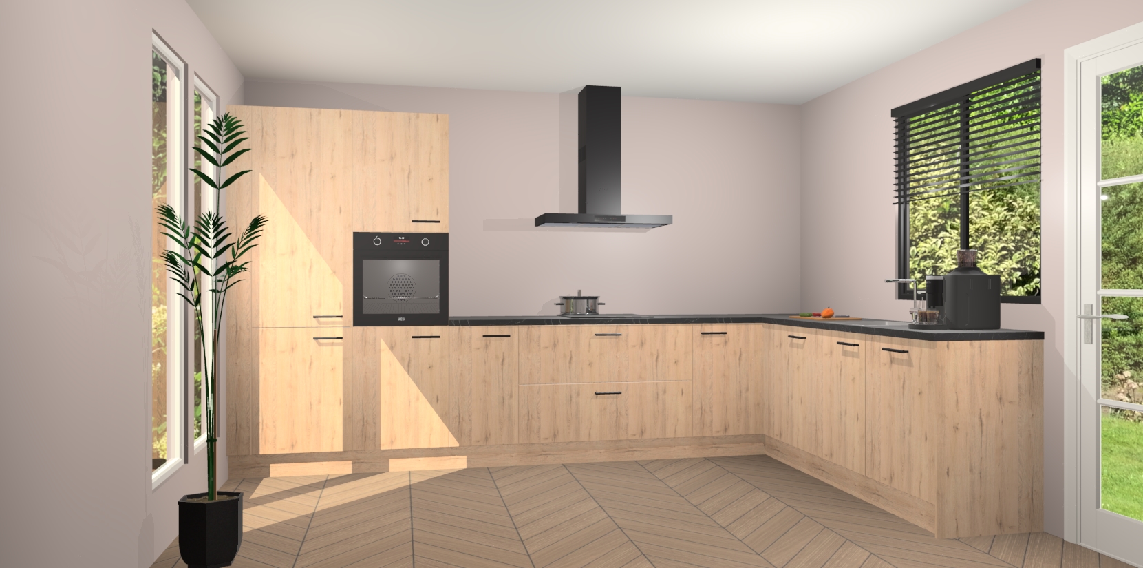 Met een modern, tijdloos design en ruime opslagruimte, zult u zich in no-time thuis voelen in uw nieuwe keuken. Uw leven wordt eenvoudiger met de soft-close deuren die voor het ultieme stille comfort zorgen - geen geluid dat u stoort terwijl u kookt. Ook is de keuken voorzien van 5 ingebouwde apparaten: een oven, inductie kookplaat, afzuigkap, vaatwasser en koelkast. Deze kunnen gemakkelijk na bestelling worden bijgewerkt naar AEG - waardoor uw luxe ervaring compleet is.