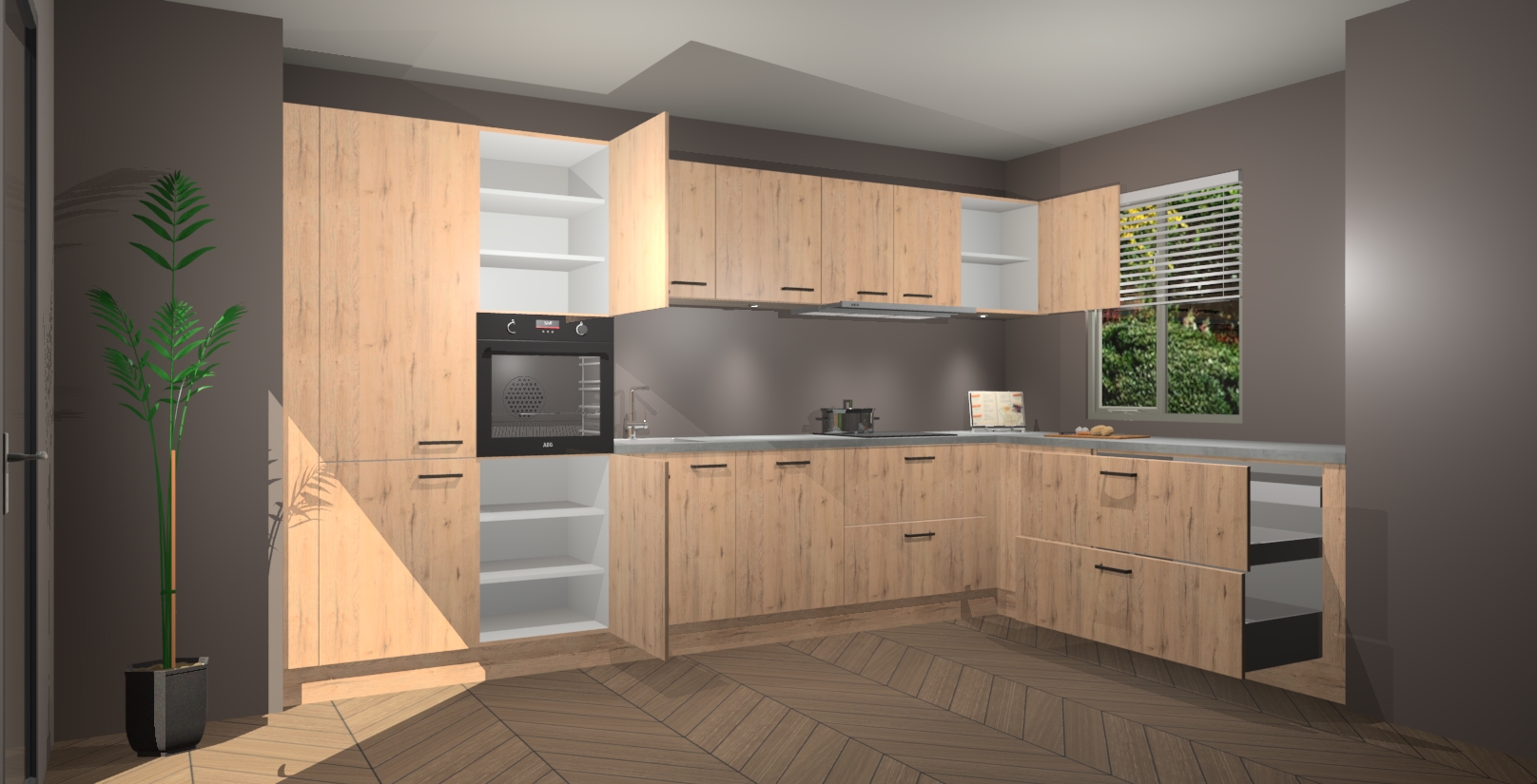 Verwelkom de natuurlijke warmte van de Madera Natuur keuken Petten in uw huis. Deze prachtige hoekkeuken met zijn moderne design en warme houten look geeft u meer dan genoeg opbergruimte om uw comfortabel te voelen in uw keuken. Geniet van soft-close deuren die al uw gasten het gevoel zullen geven dat ze zich in een luxueuze ruimte bevinden.