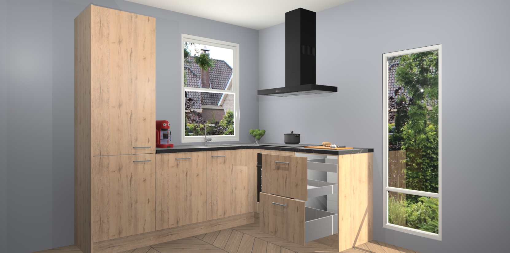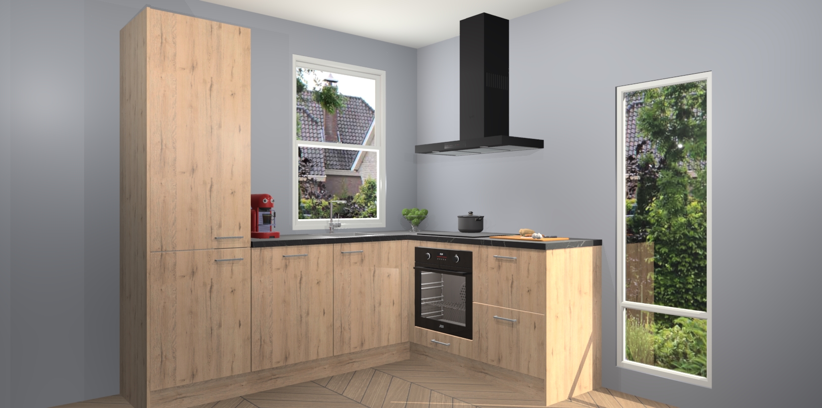 De prachtige Madera Natuur keuken Phuket is de perfecte keuze als u op zoek bent naar een moderne hoekkeuken met alle luxe en comfort die u kunt verwachten! De uitstraling in het houtlook-design draagt bij aan de warme sfeer die u nu al voelt wanneer u er naar kijkt. Heeft u genoeg van ouderwetse keukens? Probeer dan direct deze moderne, mooie hoekkeukens en laat iedereen verbluft achter!