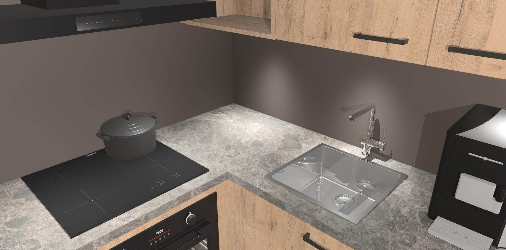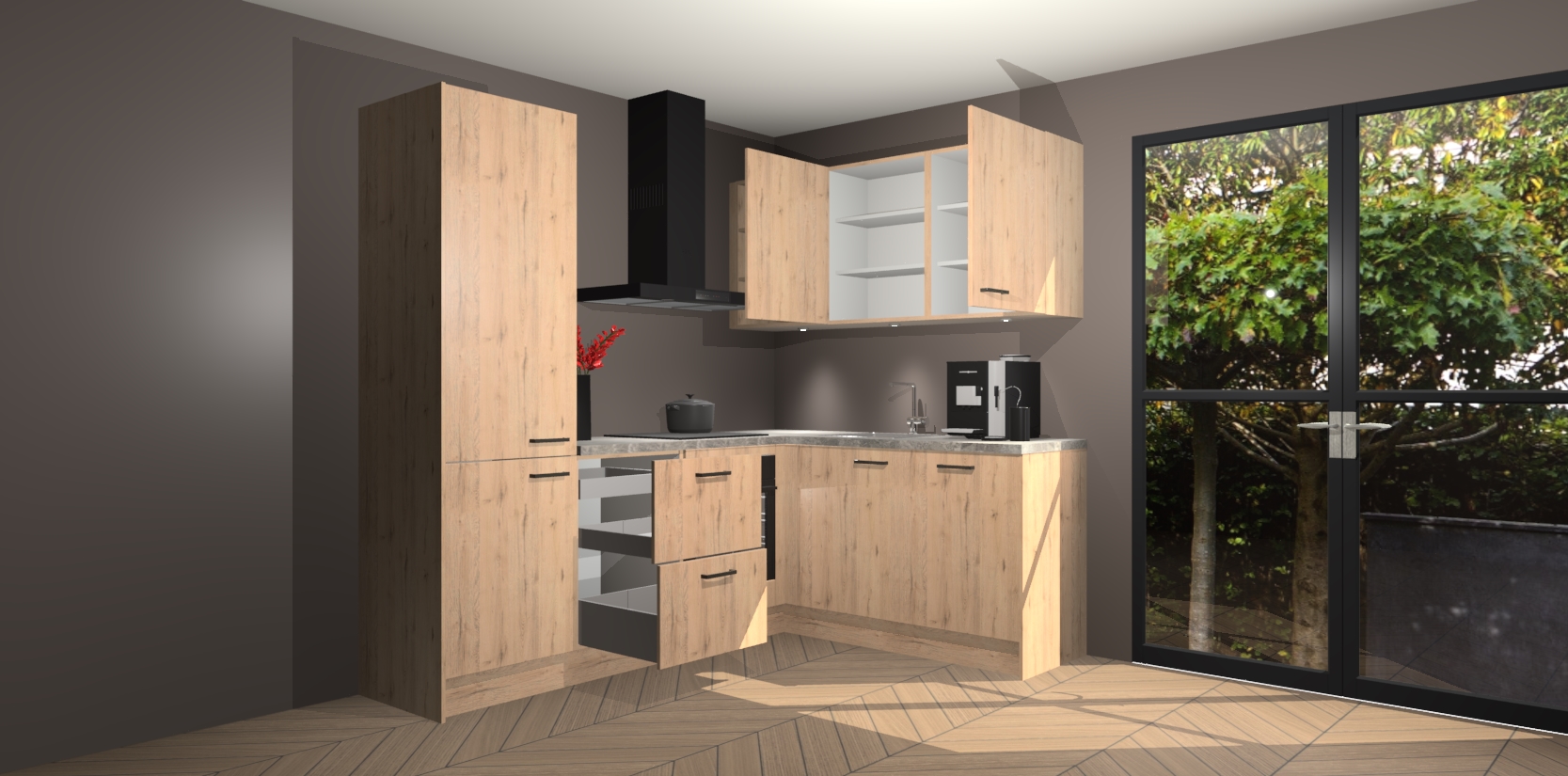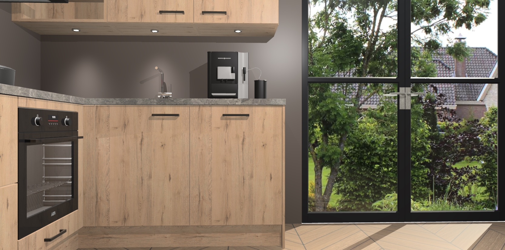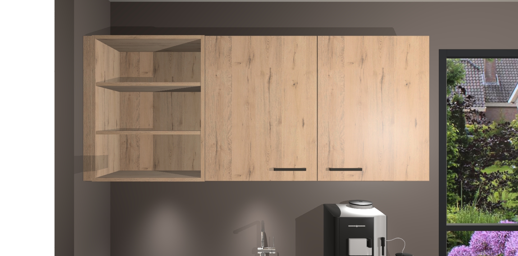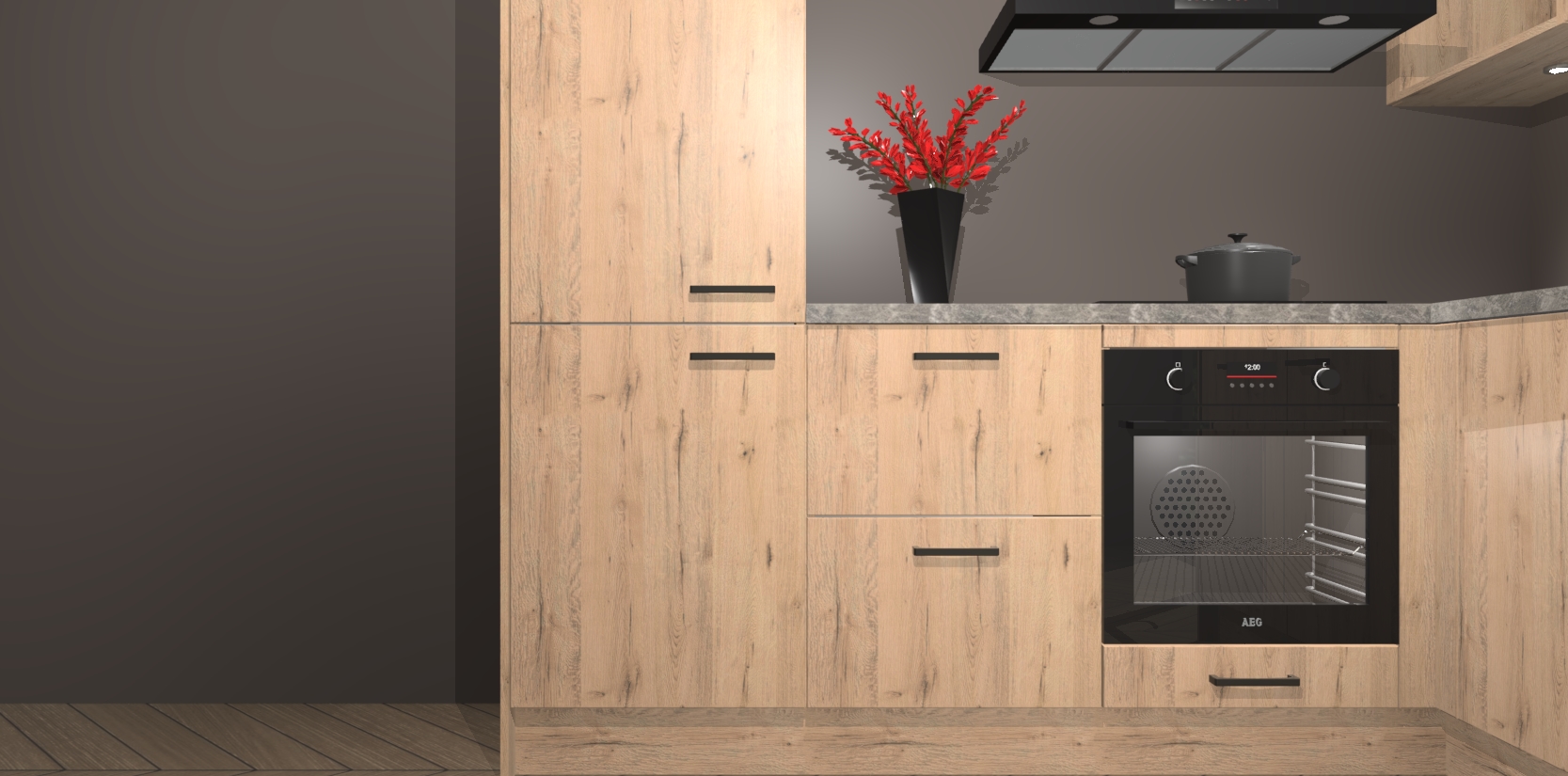Wauw, dit is de Madera Natuur keuken Pilsen! U kunt gerust zeggen dat u elegantie combineert met functionaliteit met deze keuken. Met een modern en chique ontwerp is de keuken precies wat u nodig heeft om uw ruimte te verfraaien. De binnenzijde van de kasten is in dezelfde donkere kleur als de buitenzijde voor een uniforme look, compleet met softclose-kasten die stil sluiten.