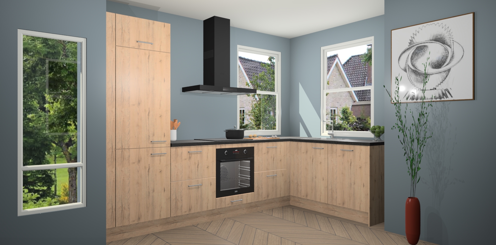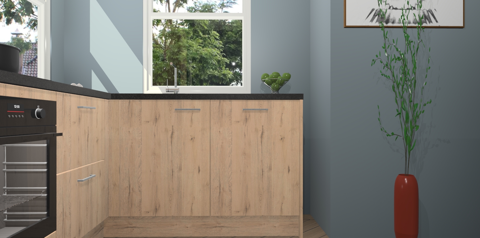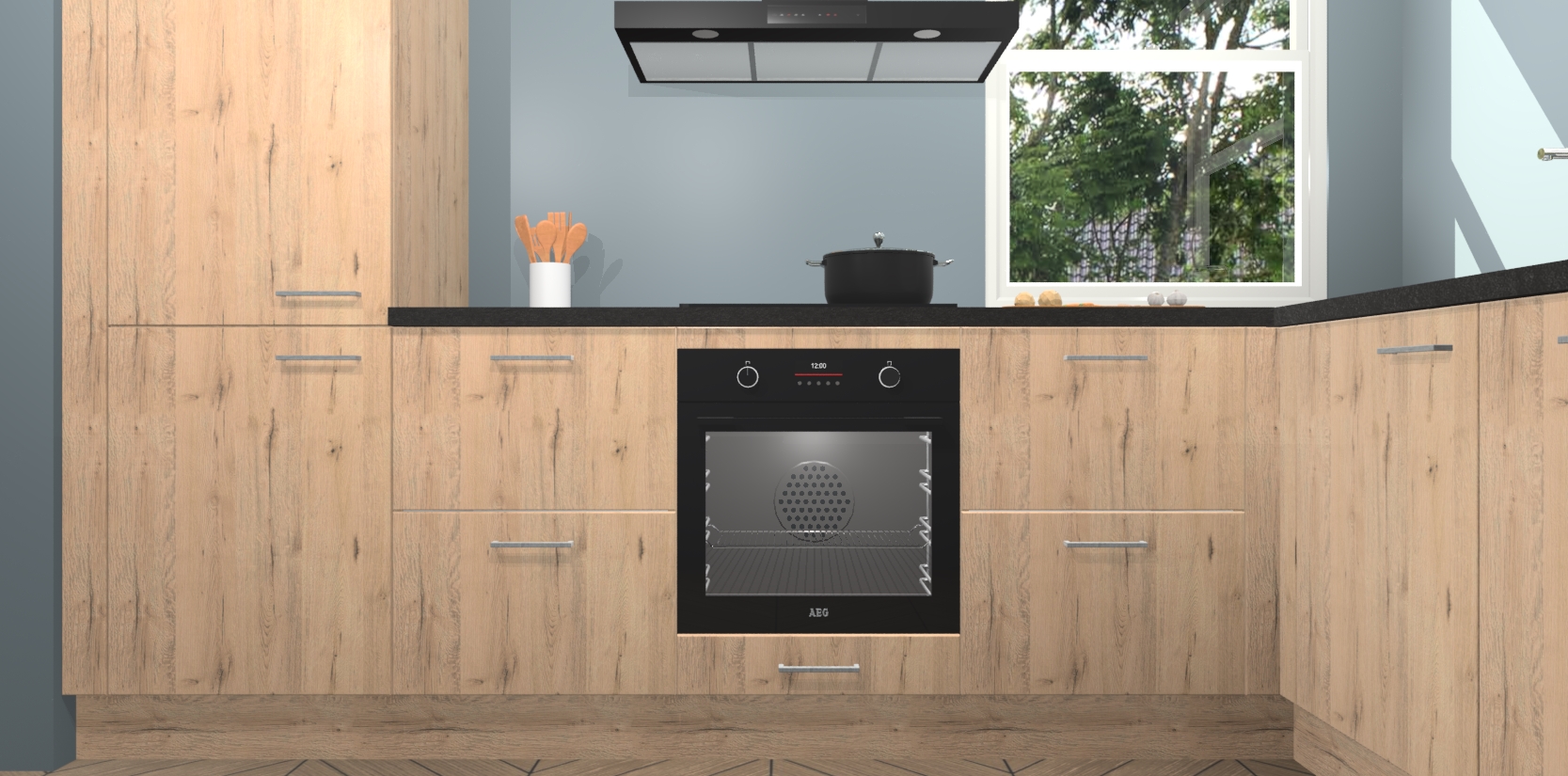 Wat maakt deze keuken zo bijzonder? Ten eerste geeft het houten werkblad uw ruimte een onmiskenbaar klassieke uitstraling. De natuurlijke afwerking roept warmte en elegantie op die nooit uit de mode zullen raken. Bovendien is het gemakkelijk schoon te houden en te onderhouden, zodat je er jarenlang plezier van kunt hebben. Als u op zoek bent naar extra gemak in uw keuken, dan heeft u bij het plaatsen van een bestelling bij ons ook de optie om uw toestellen te upgraden naar AEG-modellen - zo haalt u moderne innovatie van topmerken in apparatentechnologie rechtstreeks in huis.