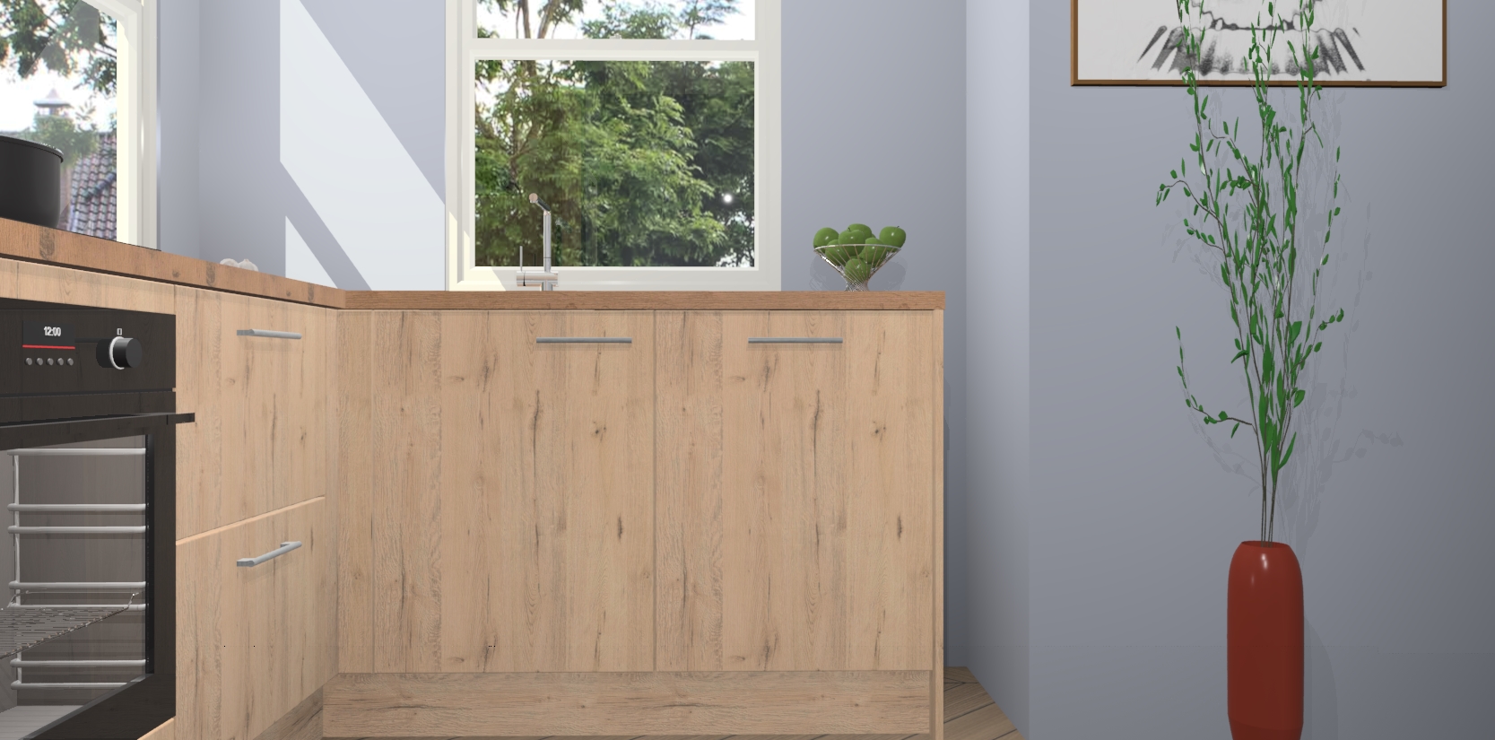 Wat maakt deze keuken zo bijzonder? Ten eerste geeft het houten werkblad uw ruimte een onmiskenbaar klassieke uitstraling. De natuurlijke afwerking roept warmte en elegantie op die nooit uit de mode zullen raken. Bovendien is het gemakkelijk schoon te houden en te onderhouden, zodat je er jarenlang plezier van kunt hebben. Als u op zoek bent naar extra gemak in uw keuken, dan heeft u bij het plaatsen van een bestelling bij ons ook de optie om uw toestellen te upgraden naar AEG-modellen - zo haalt u moderne innovatie van topmerken in apparatentechnologie rechtstreeks in huis.