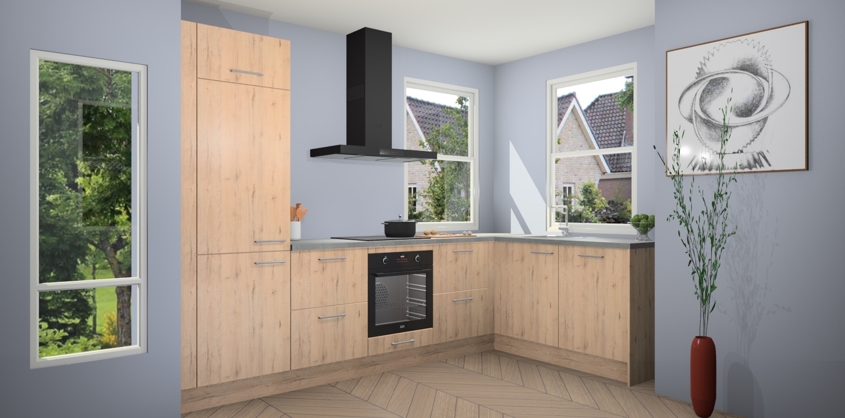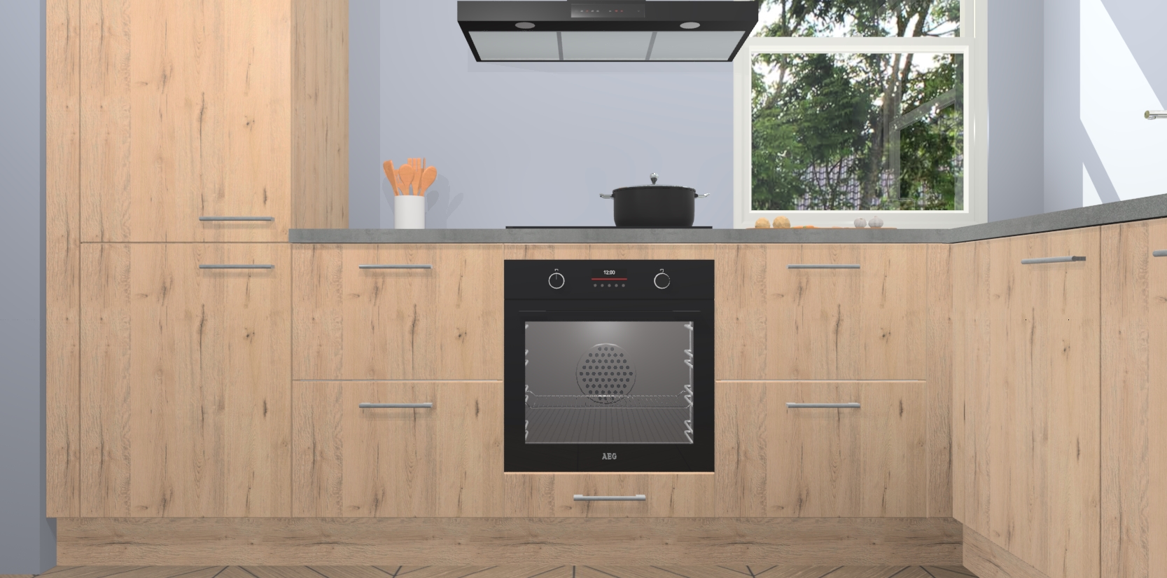 Wat maakt deze keuken zo bijzonder? Ten eerste geeft het houten werkblad uw ruimte een onmiskenbaar klassieke uitstraling. De natuurlijke afwerking roept warmte en elegantie op die nooit uit de mode zullen raken. Bovendien is het gemakkelijk schoon te houden en te onderhouden, zodat je er jarenlang plezier van kunt hebben. Als u op zoek bent naar extra gemak in uw keuken, dan heeft u bij het plaatsen van een bestelling bij ons ook de optie om uw toestellen te upgraden naar AEG-modellen - zo haalt u moderne innovatie van topmerken in apparatentechnologie rechtstreeks in huis.