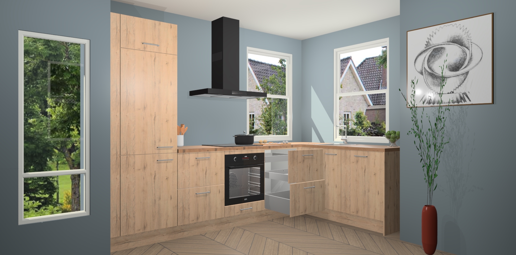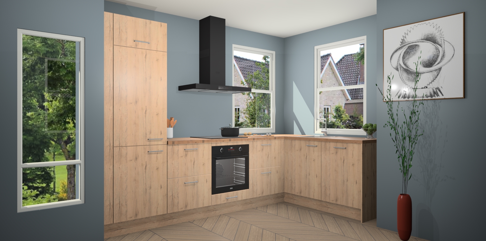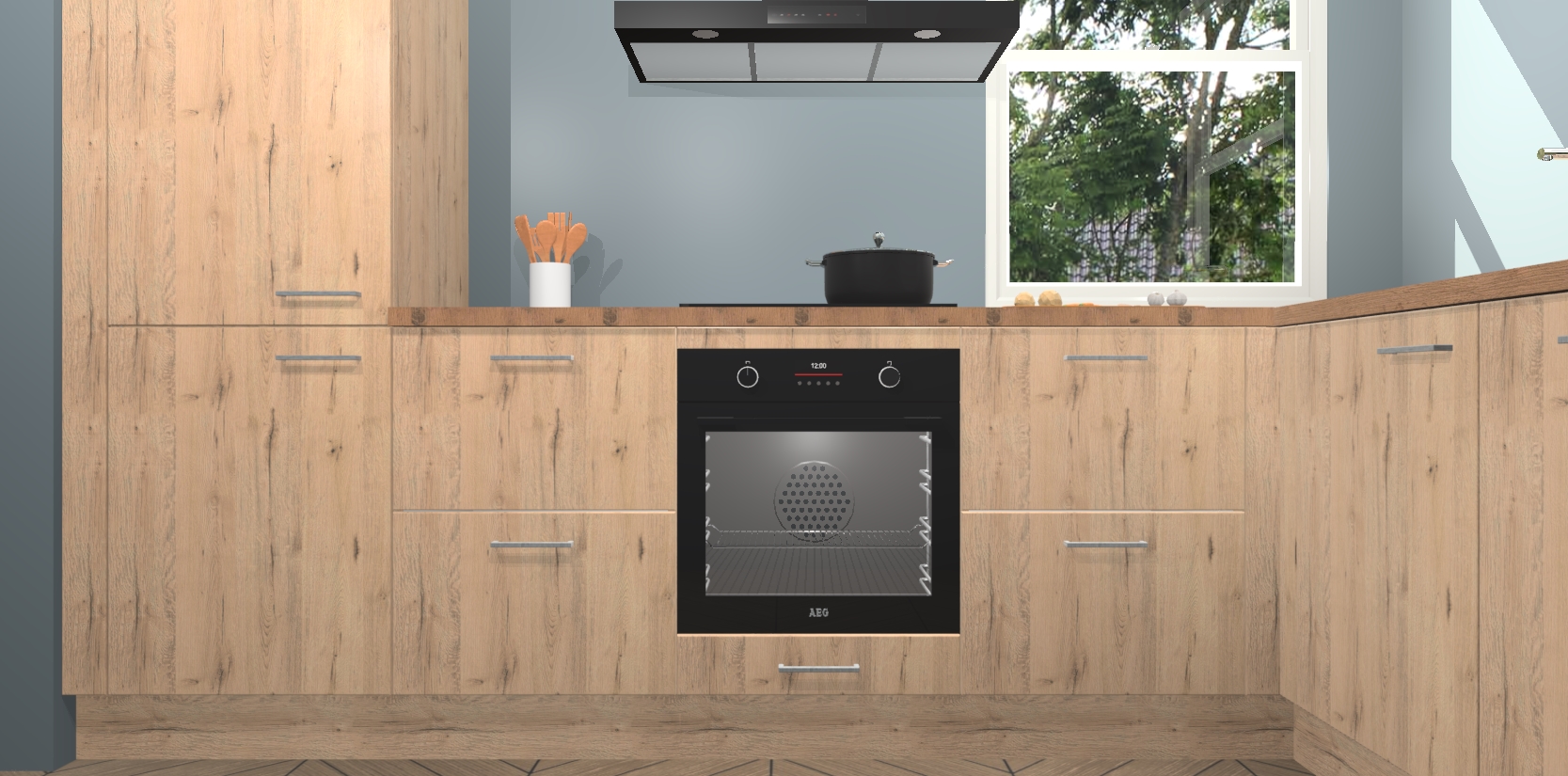 Wat maakt deze keuken zo bijzonder? Ten eerste geeft het houten werkblad uw ruimte een onmiskenbaar klassieke uitstraling. De natuurlijke afwerking roept warmte en elegantie op die nooit uit de mode zullen raken. Bovendien is het gemakkelijk schoon te houden en te onderhouden, zodat je er jarenlang plezier van kunt hebben. Als u op zoek bent naar extra gemak in uw keuken, dan heeft u bij het plaatsen van een bestelling bij ons ook de optie om uw toestellen te upgraden naar AEG-modellen - zo haalt u moderne innovatie van topmerken in apparatentechnologie rechtstreeks in huis.