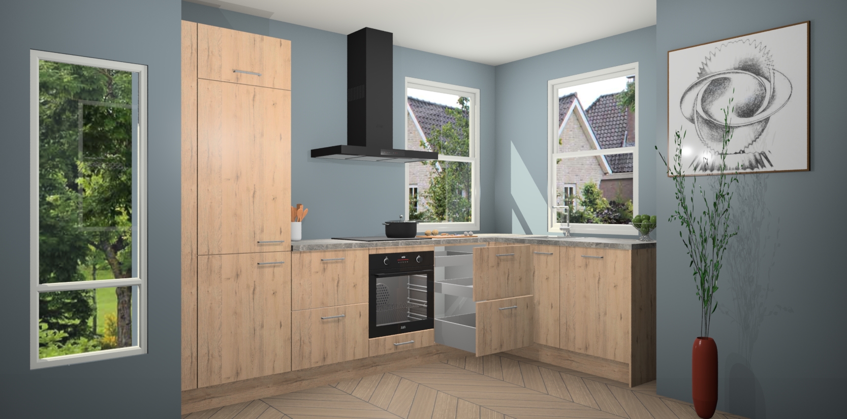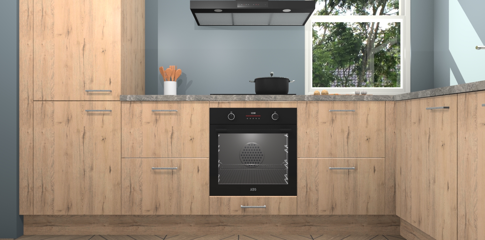 Wat maakt deze keuken zo bijzonder? Ten eerste geeft het houten werkblad uw ruimte een onmiskenbaar klassieke uitstraling. De natuurlijke afwerking roept warmte en elegantie op die nooit uit de mode zullen raken. Bovendien is het gemakkelijk schoon te houden en te onderhouden, zodat je er jarenlang plezier van kunt hebben. Als u op zoek bent naar extra gemak in uw keuken, dan heeft u bij het plaatsen van een bestelling bij ons ook de optie om uw toestellen te upgraden naar AEG-modellen - zo haalt u moderne innovatie van topmerken in apparatentechnologie rechtstreeks in huis.