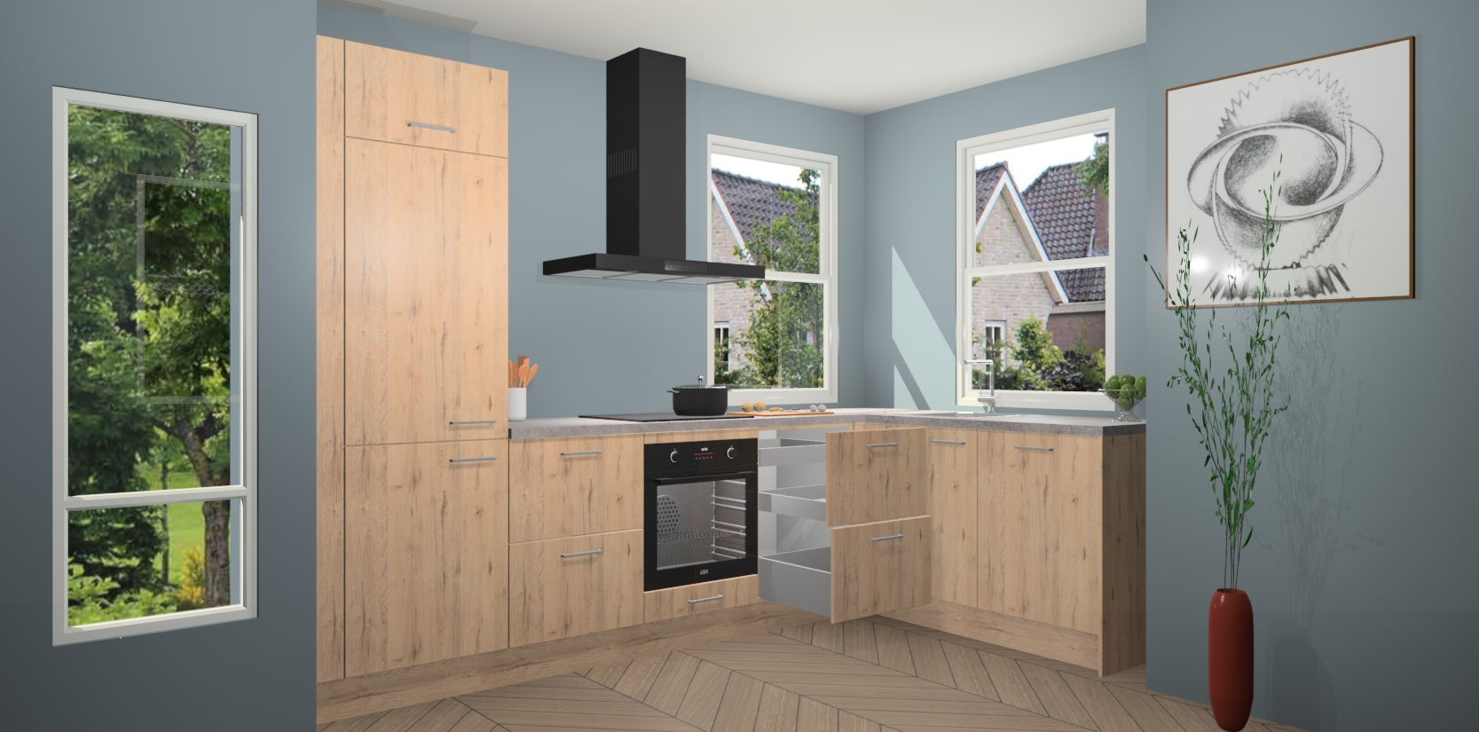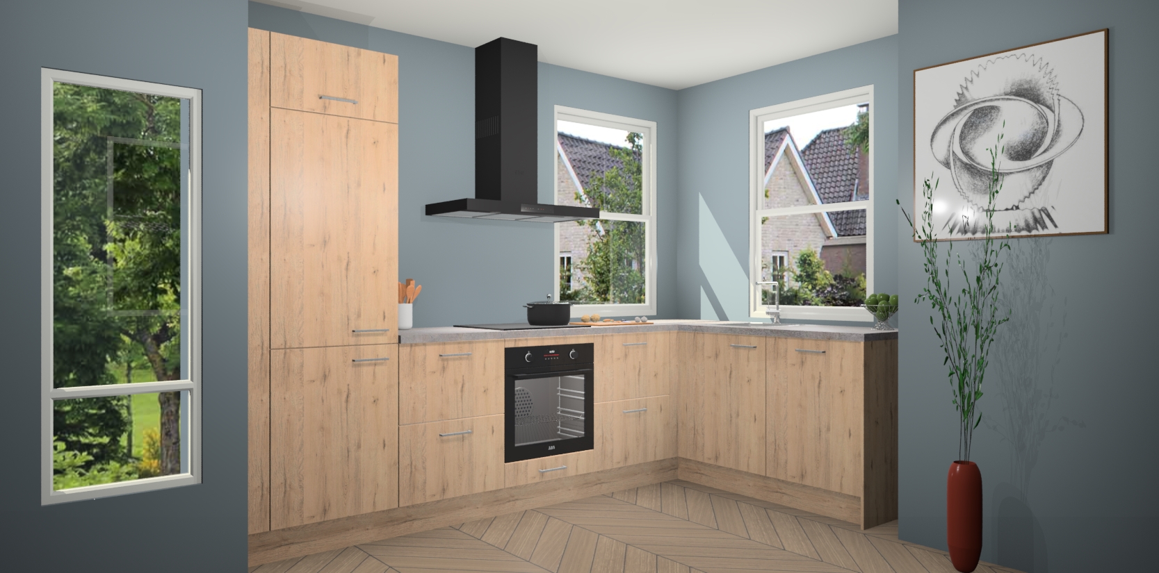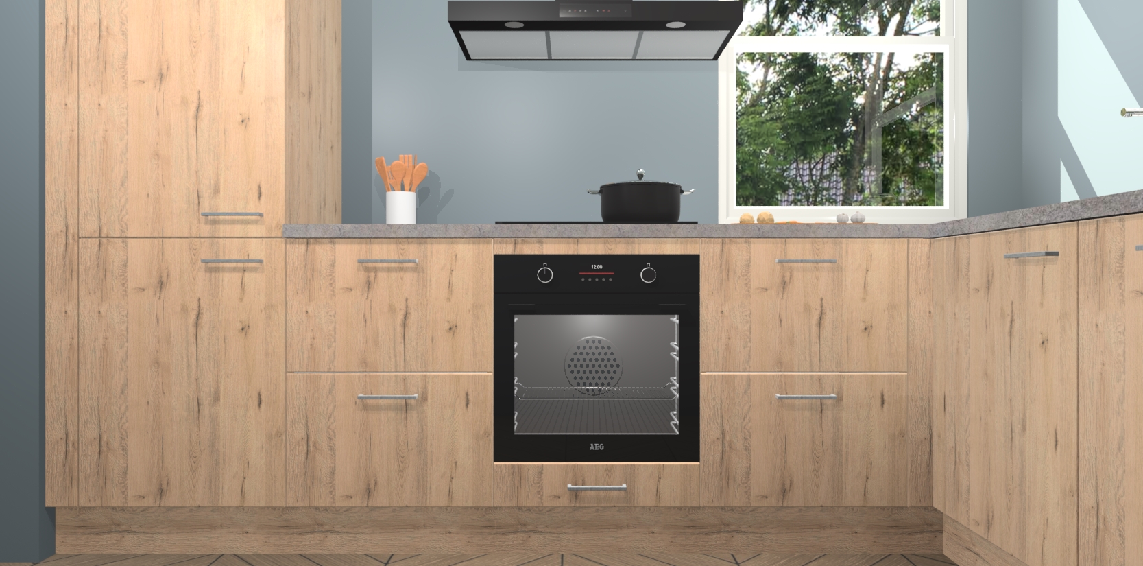 Wat maakt deze keuken zo bijzonder? Ten eerste geeft het houten werkblad uw ruimte een onmiskenbaar klassieke uitstraling. De natuurlijke afwerking roept warmte en elegantie op die nooit uit de mode zullen raken. Bovendien is het gemakkelijk schoon te houden en te onderhouden, zodat je er jarenlang plezier van kunt hebben. Als u op zoek bent naar extra gemak in uw keuken, dan heeft u bij het plaatsen van een bestelling bij ons ook de optie om uw toestellen te upgraden naar AEG-modellen - zo haalt u moderne innovatie van topmerken in apparatentechnologie rechtstreeks in huis.
