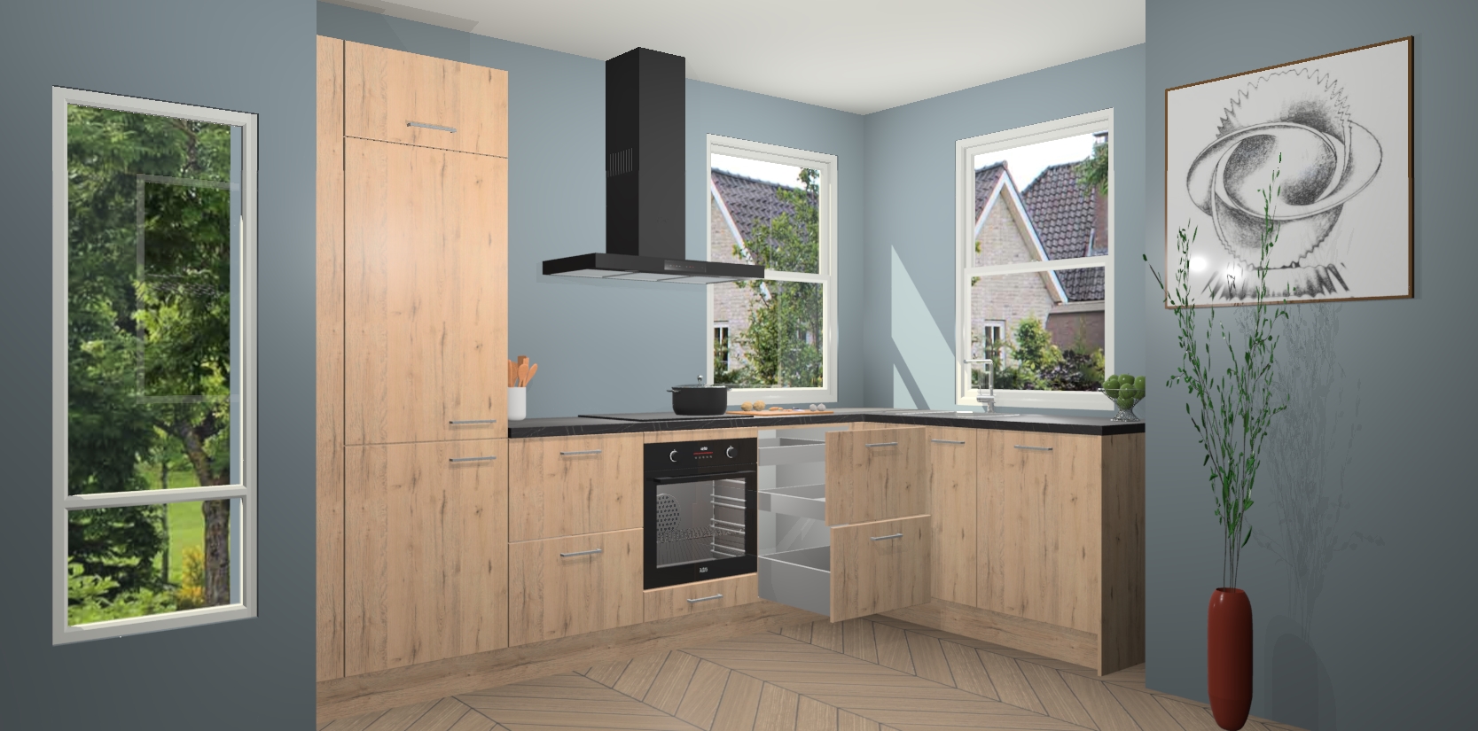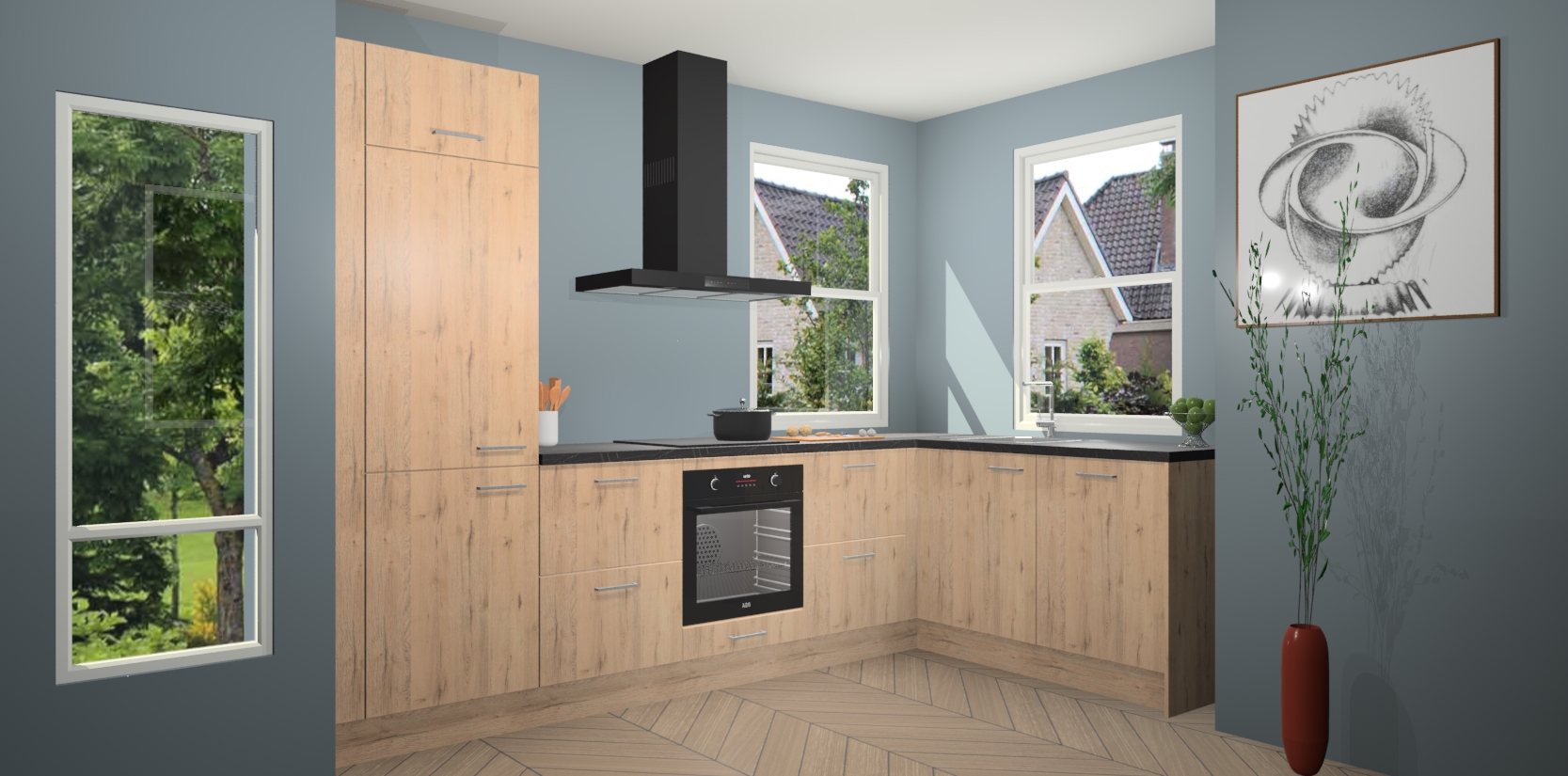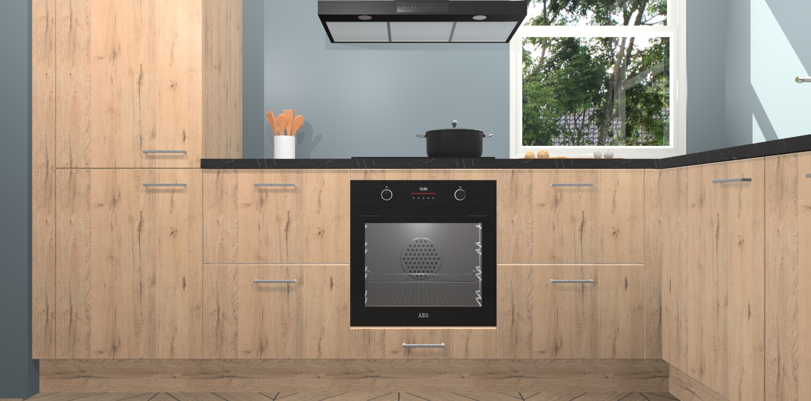 Wat maakt deze keuken zo bijzonder? Ten eerste geeft het houten werkblad uw ruimte een onmiskenbaar klassieke uitstraling. De natuurlijke afwerking roept warmte en elegantie op die nooit uit de mode zullen raken. Bovendien is het gemakkelijk schoon te houden en te onderhouden, zodat je er jarenlang plezier van kunt hebben. Als u op zoek bent naar extra gemak in uw keuken, dan heeft u bij het plaatsen van een bestelling bij ons ook de optie om uw toestellen te upgraden naar AEG-modellen - zo haalt u moderne innovatie van topmerken in apparatentechnologie rechtstreeks in huis.