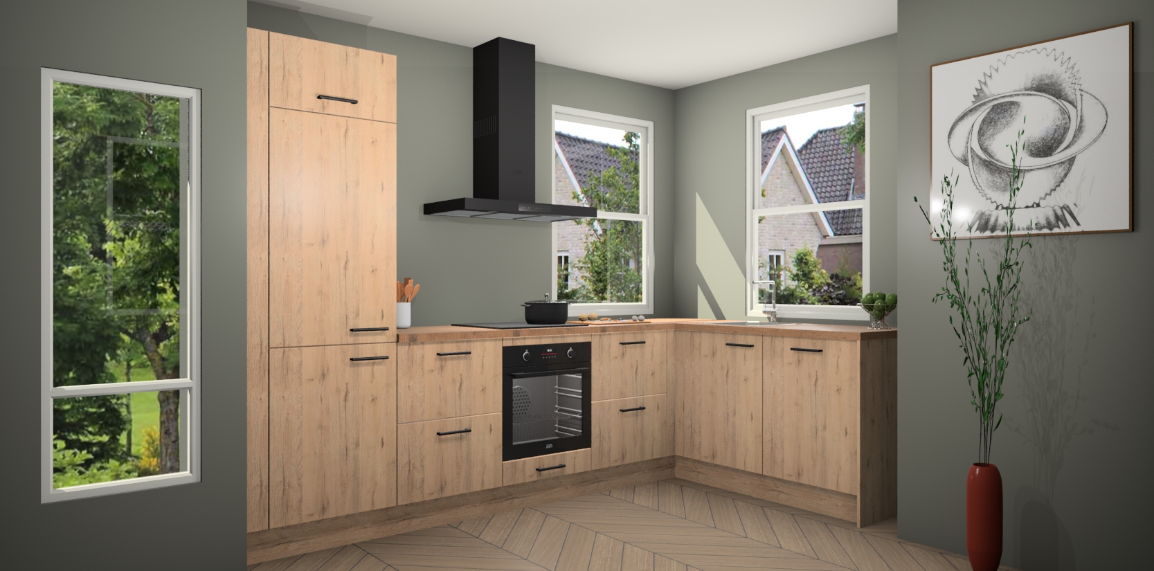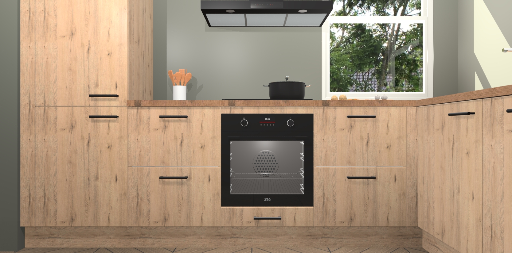 Wat maakt deze keuken zo bijzonder? Ten eerste geeft het houten werkblad uw ruimte een onmiskenbaar klassieke uitstraling. De natuurlijke afwerking roept warmte en elegantie op die nooit uit de mode zullen raken. Bovendien is het gemakkelijk schoon te houden en te onderhouden, zodat je er jarenlang plezier van kunt hebben. Als u op zoek bent naar extra gemak in uw keuken, dan heeft u bij het plaatsen van een bestelling bij ons ook de optie om uw toestellen te upgraden naar AEG-modellen - zo haalt u moderne innovatie van topmerken in apparatentechnologie rechtstreeks in huis.