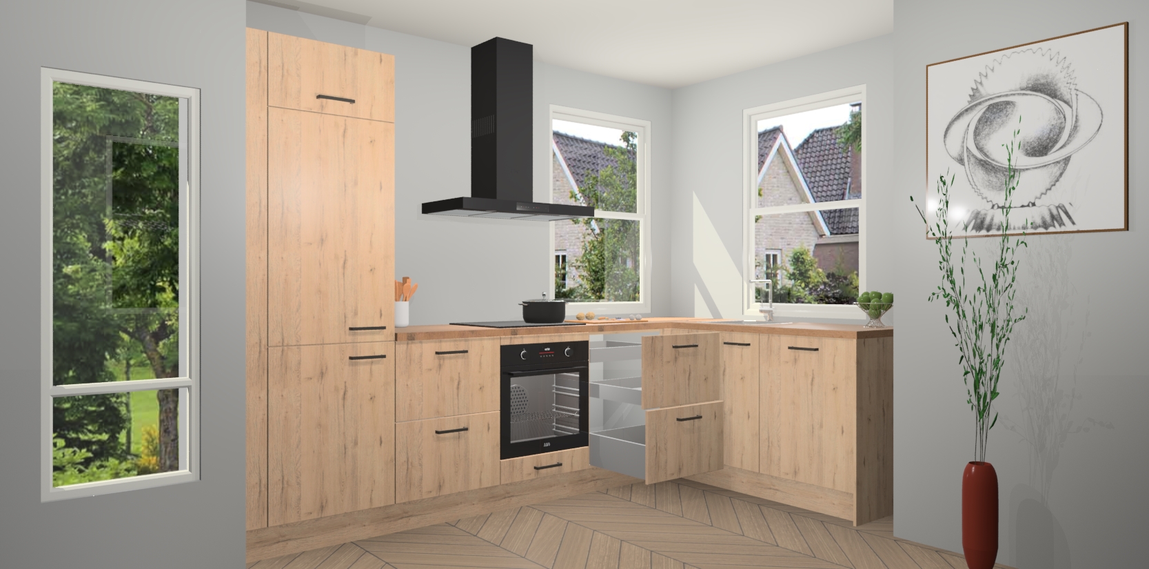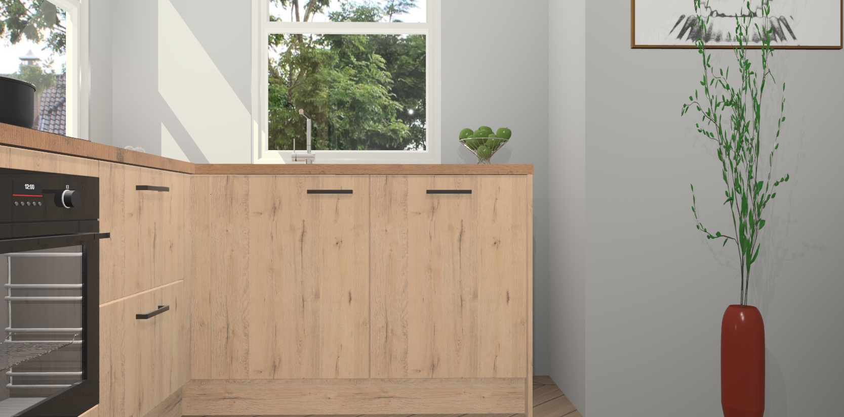 Wat maakt deze keuken zo bijzonder? Ten eerste geeft het houten werkblad uw ruimte een onmiskenbaar klassieke uitstraling. De natuurlijke afwerking roept warmte en elegantie op die nooit uit de mode zullen raken. Bovendien is het gemakkelijk schoon te houden en te onderhouden, zodat je er jarenlang plezier van kunt hebben. Als u op zoek bent naar extra gemak in uw keuken, dan heeft u bij het plaatsen van een bestelling bij ons ook de optie om uw toestellen te upgraden naar AEG-modellen - zo haalt u moderne innovatie van topmerken in apparatentechnologie rechtstreeks in huis.